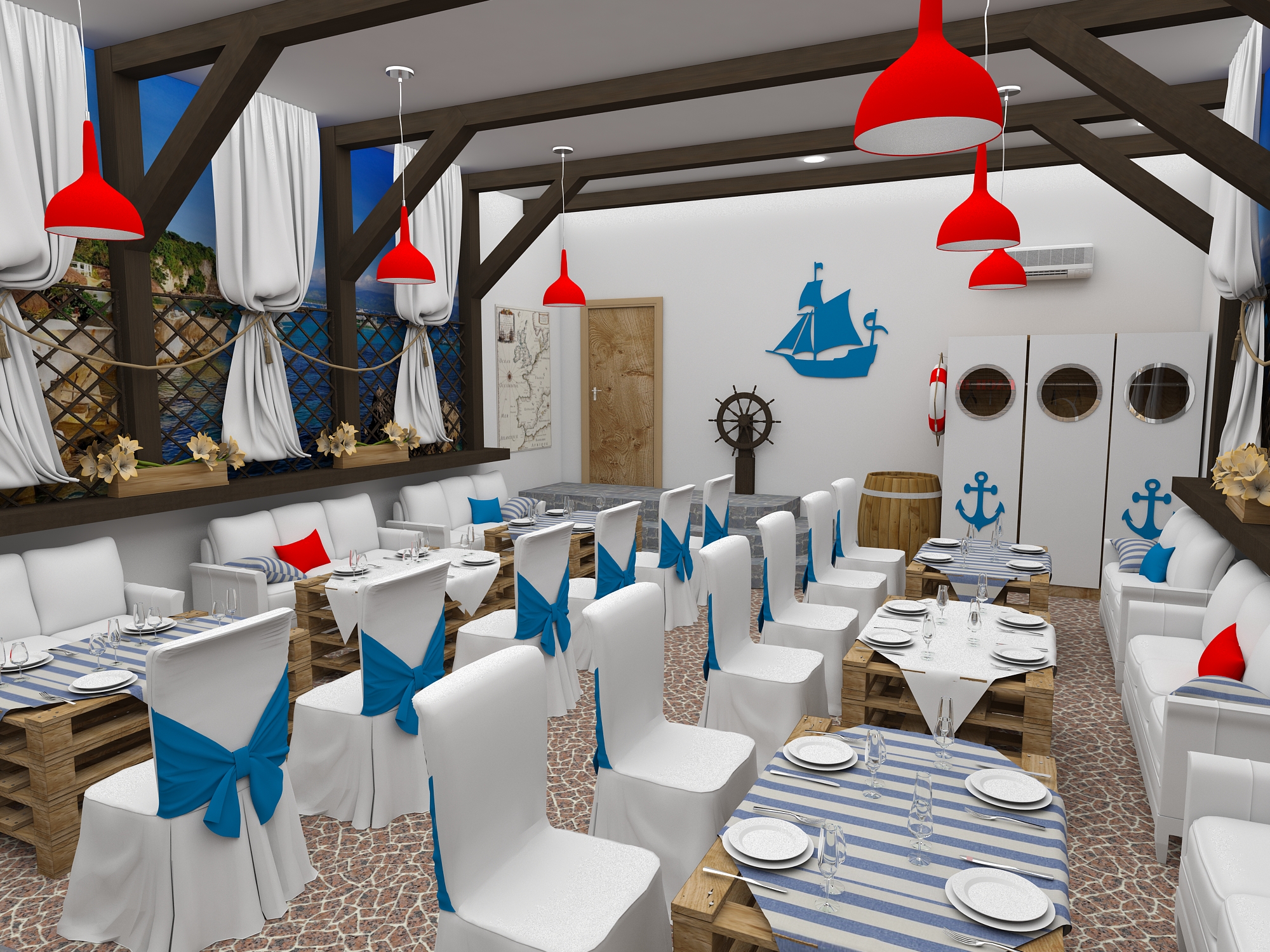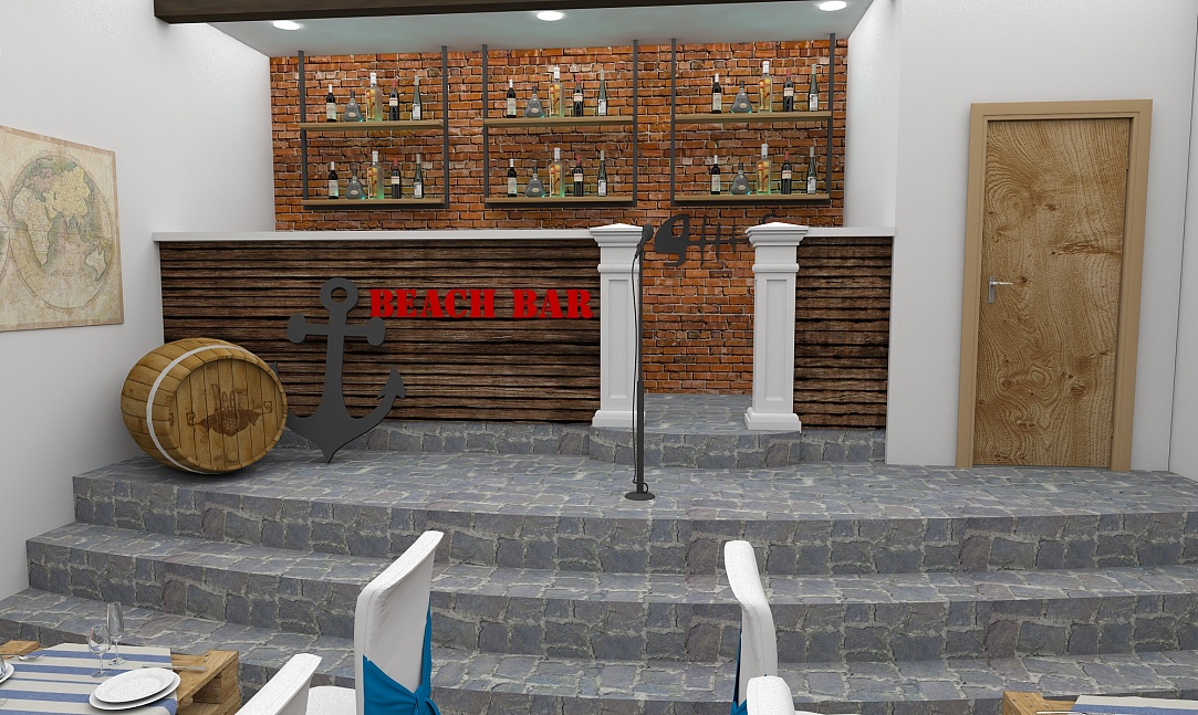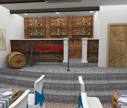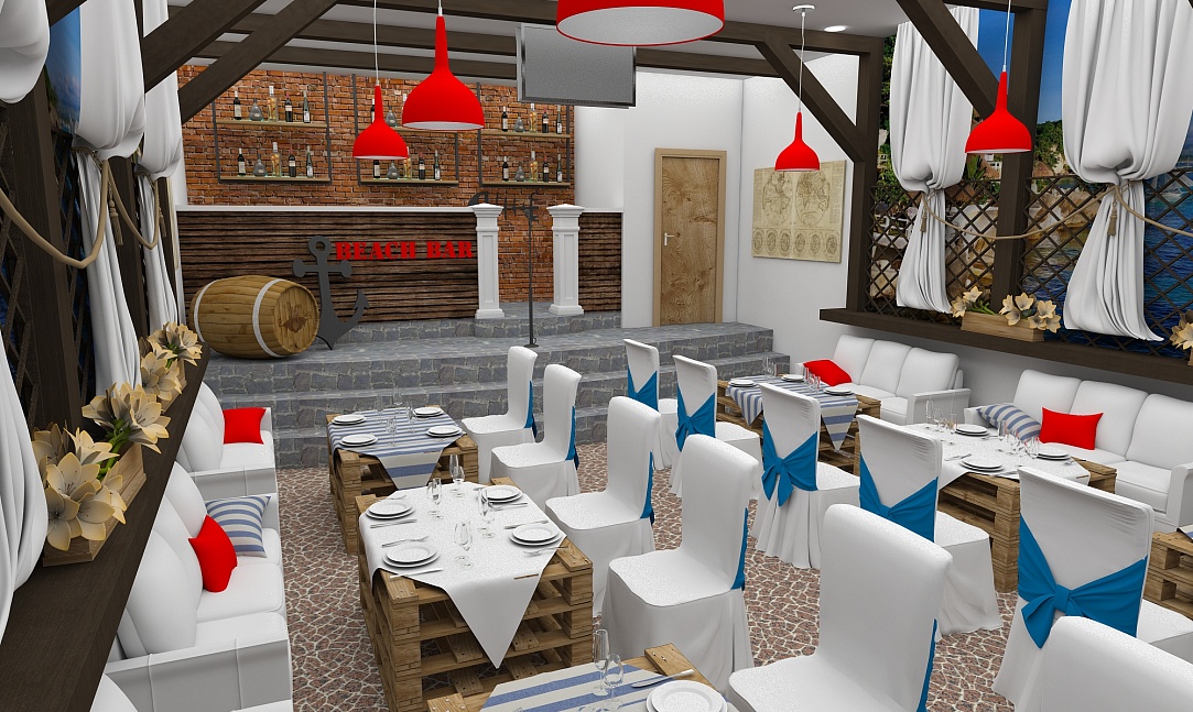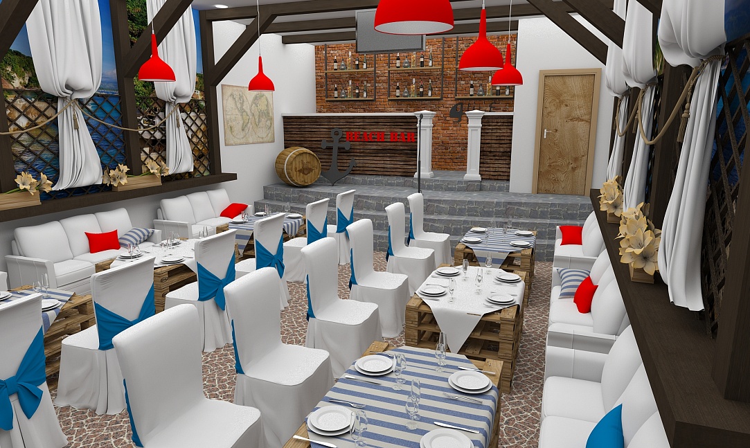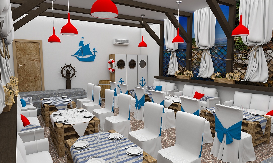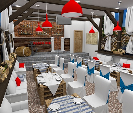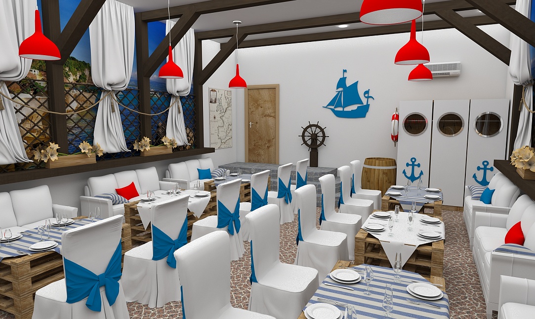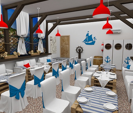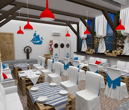 Задача - разработать дизайн проект в морском стиле для банкетного зала в пос. Лазурный берег