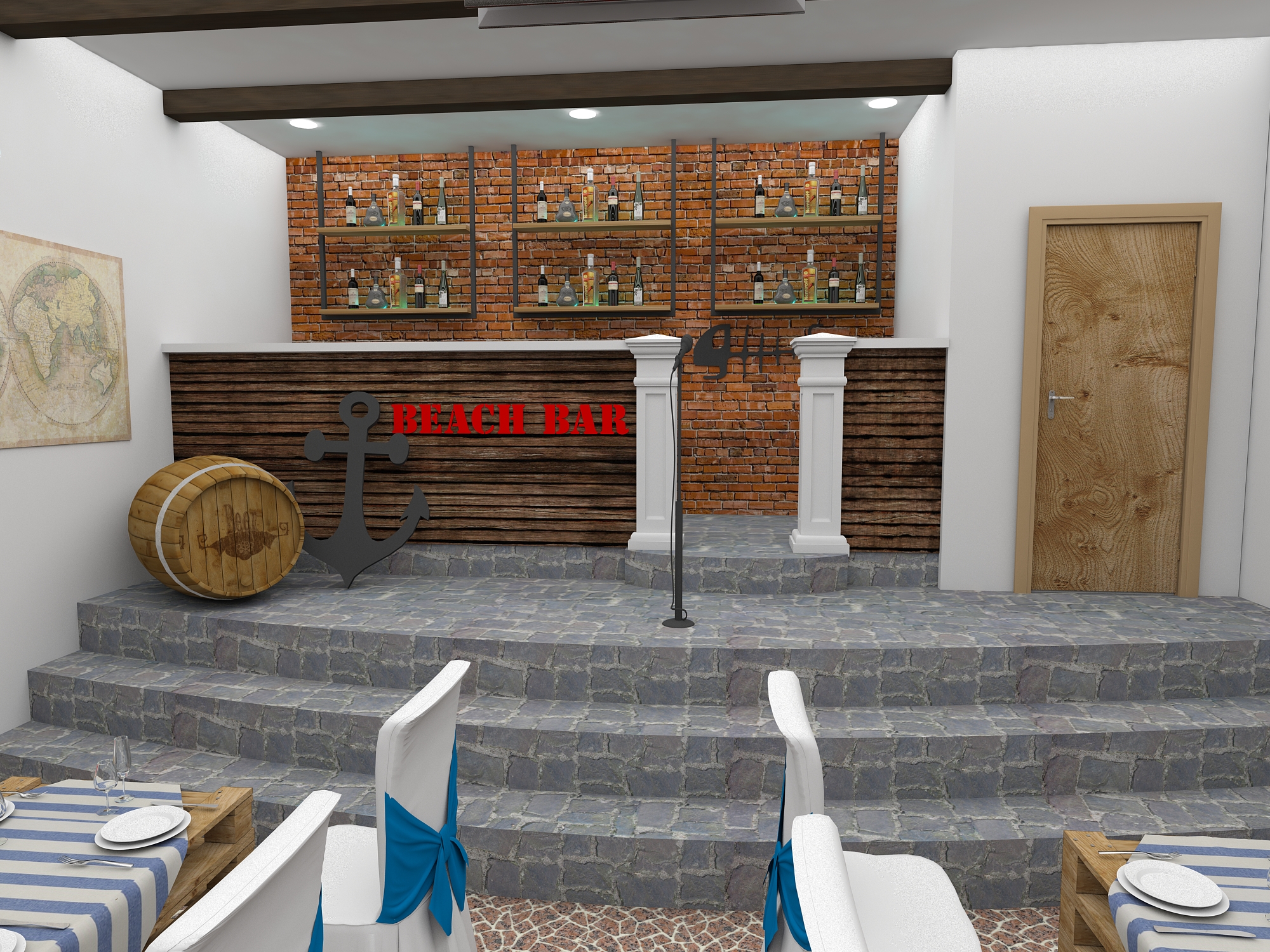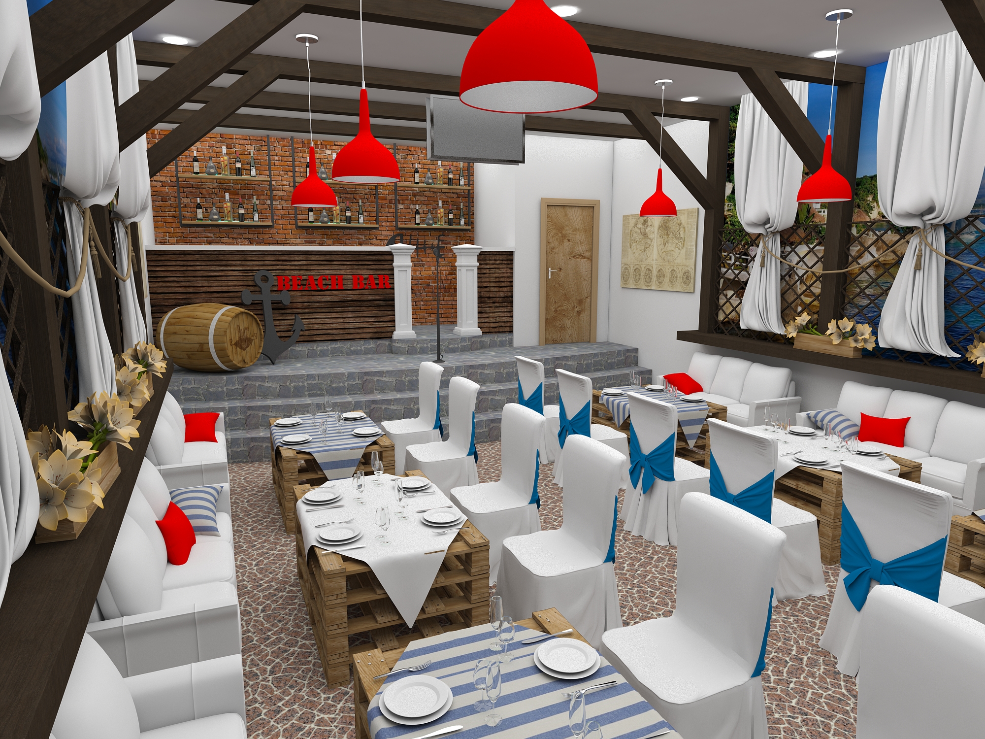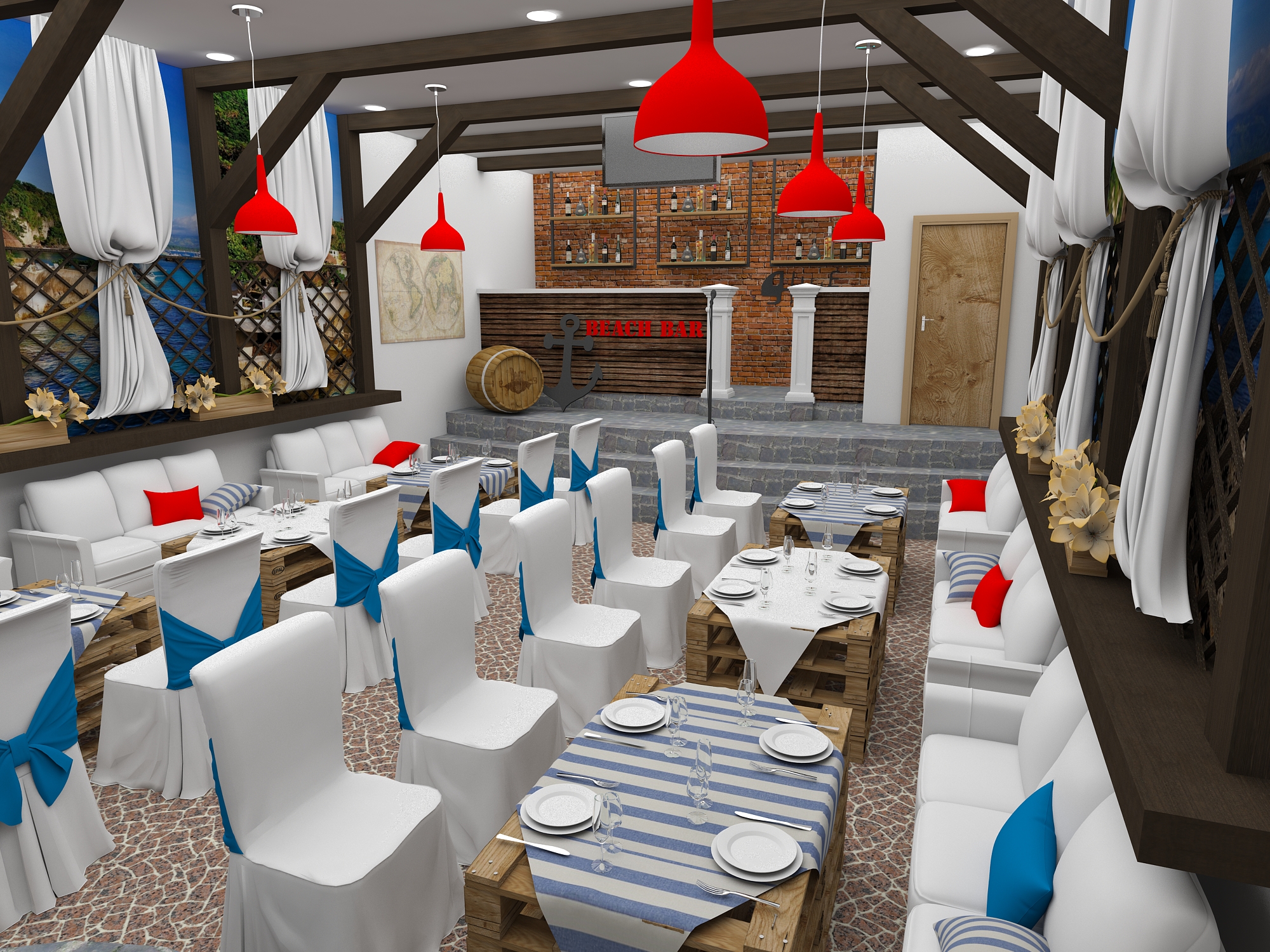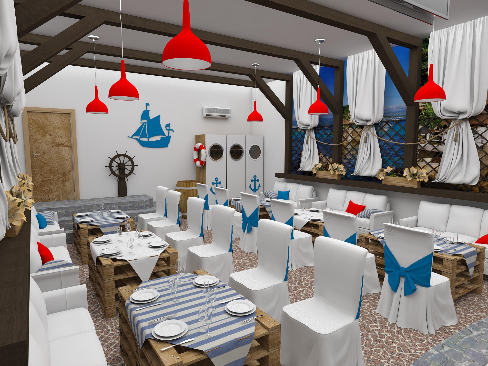 Задача - разработать дизайн проект в морском стиле для банкетного зала в пос. Лазурный берег