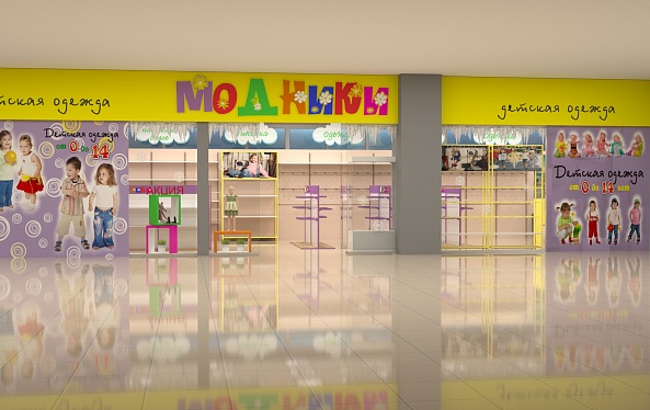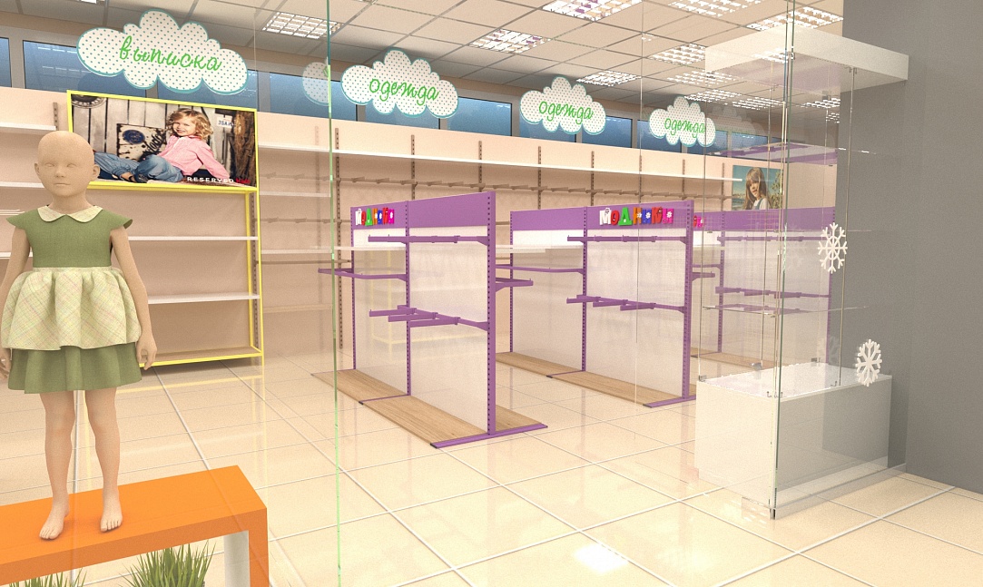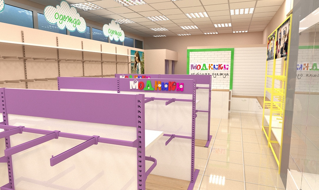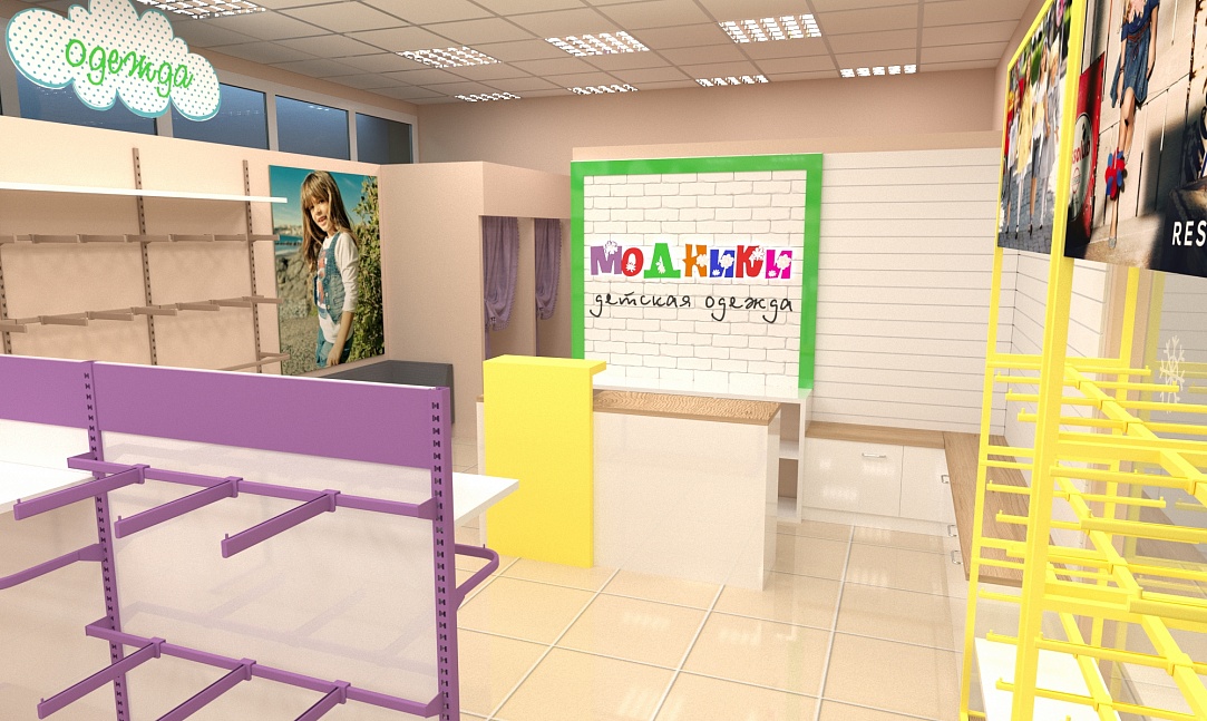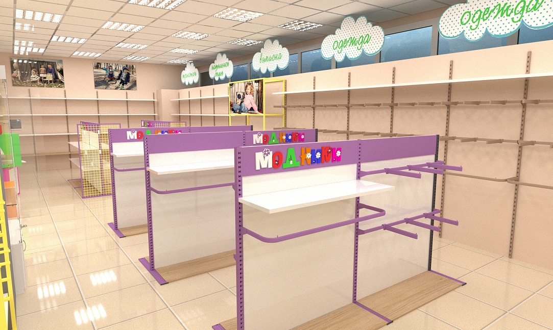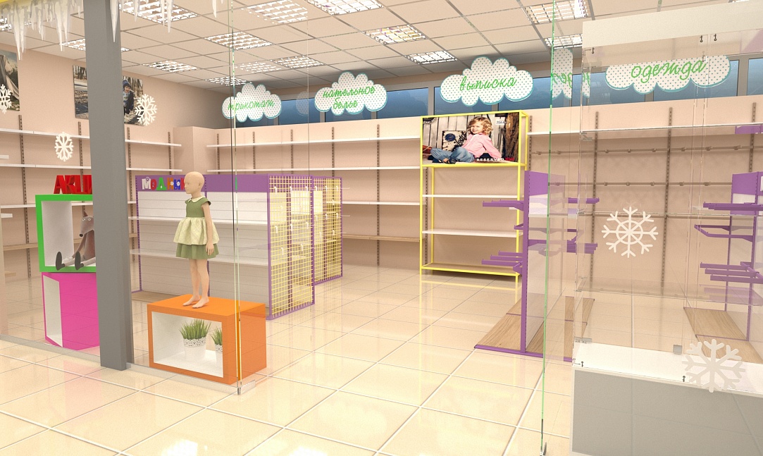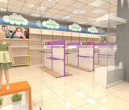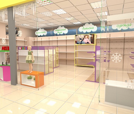 Задача - дизайн интерьера детской одежды, подготовка проекта для ТРК "Горки"