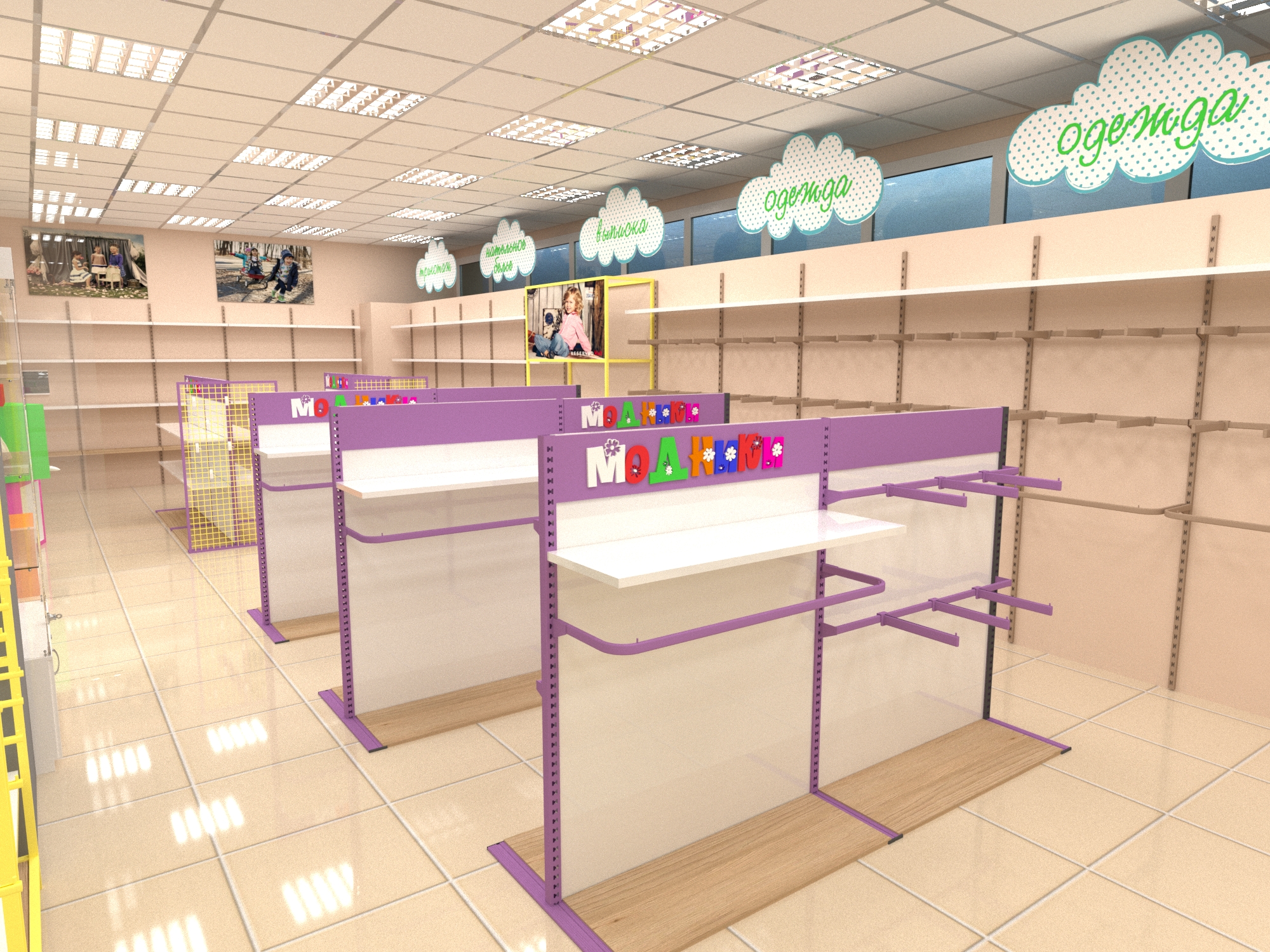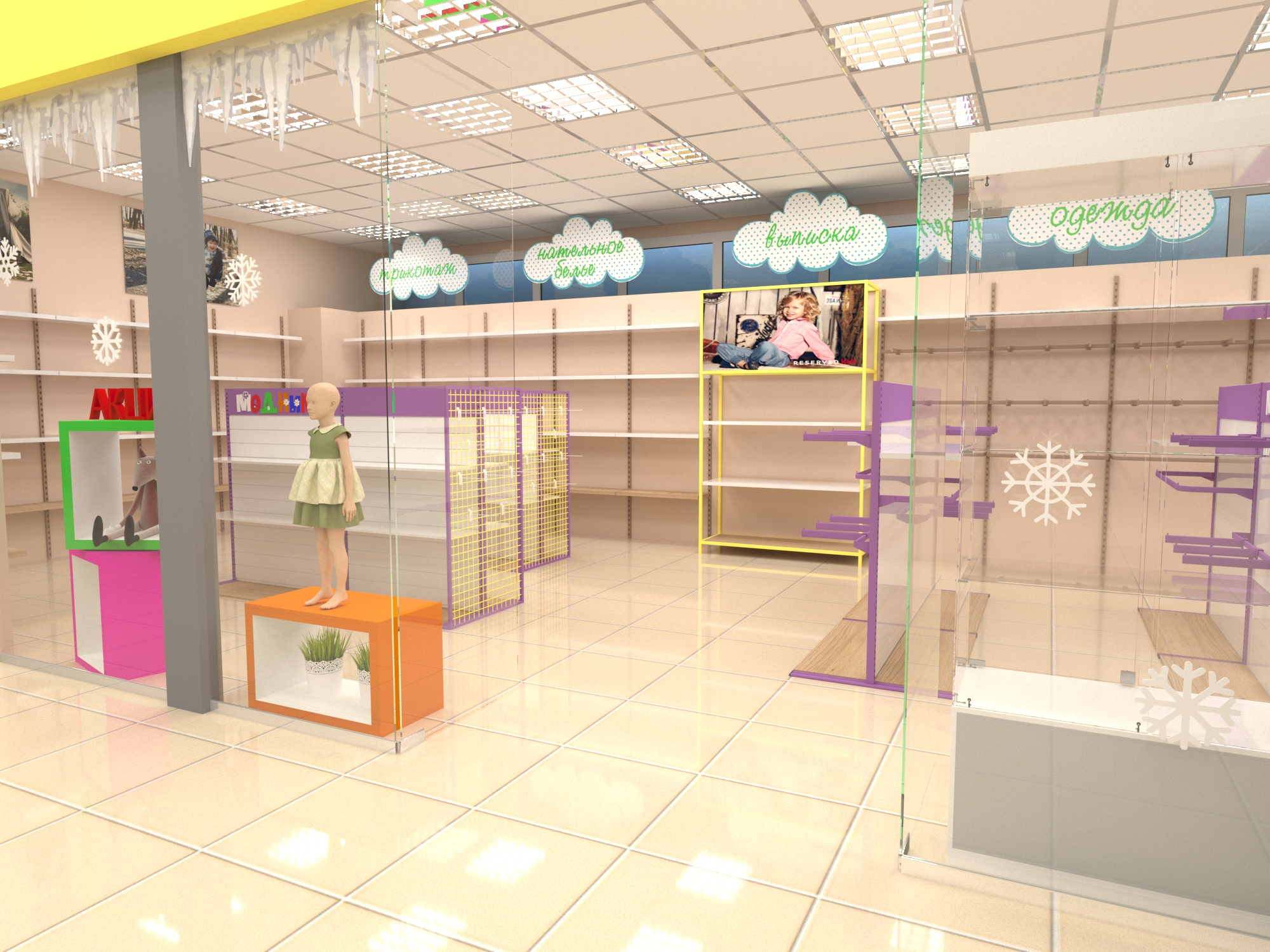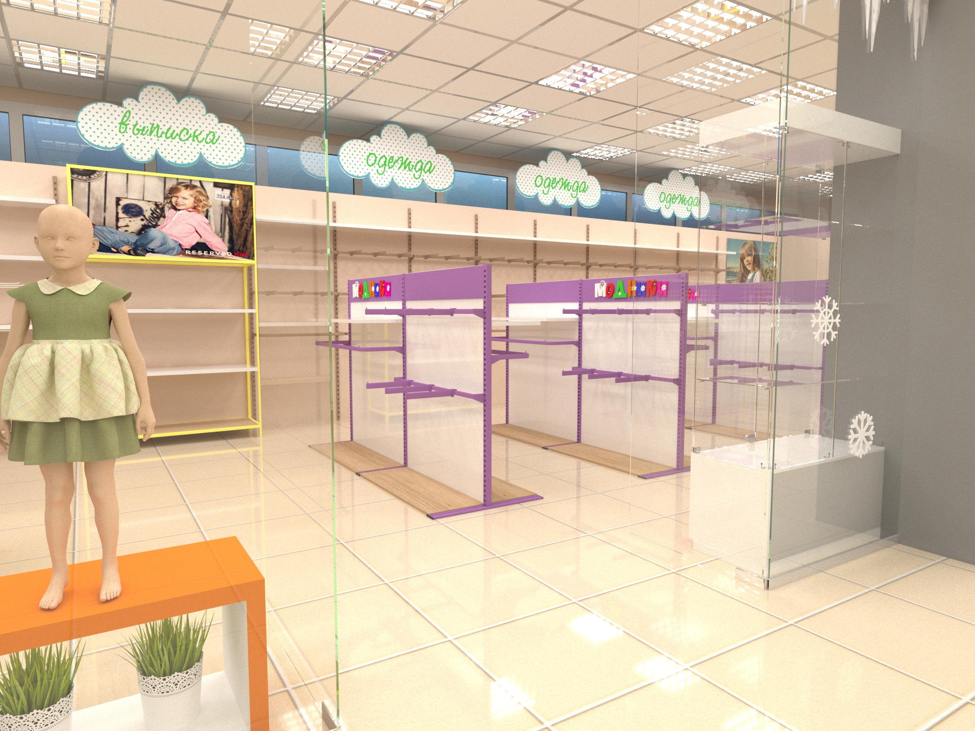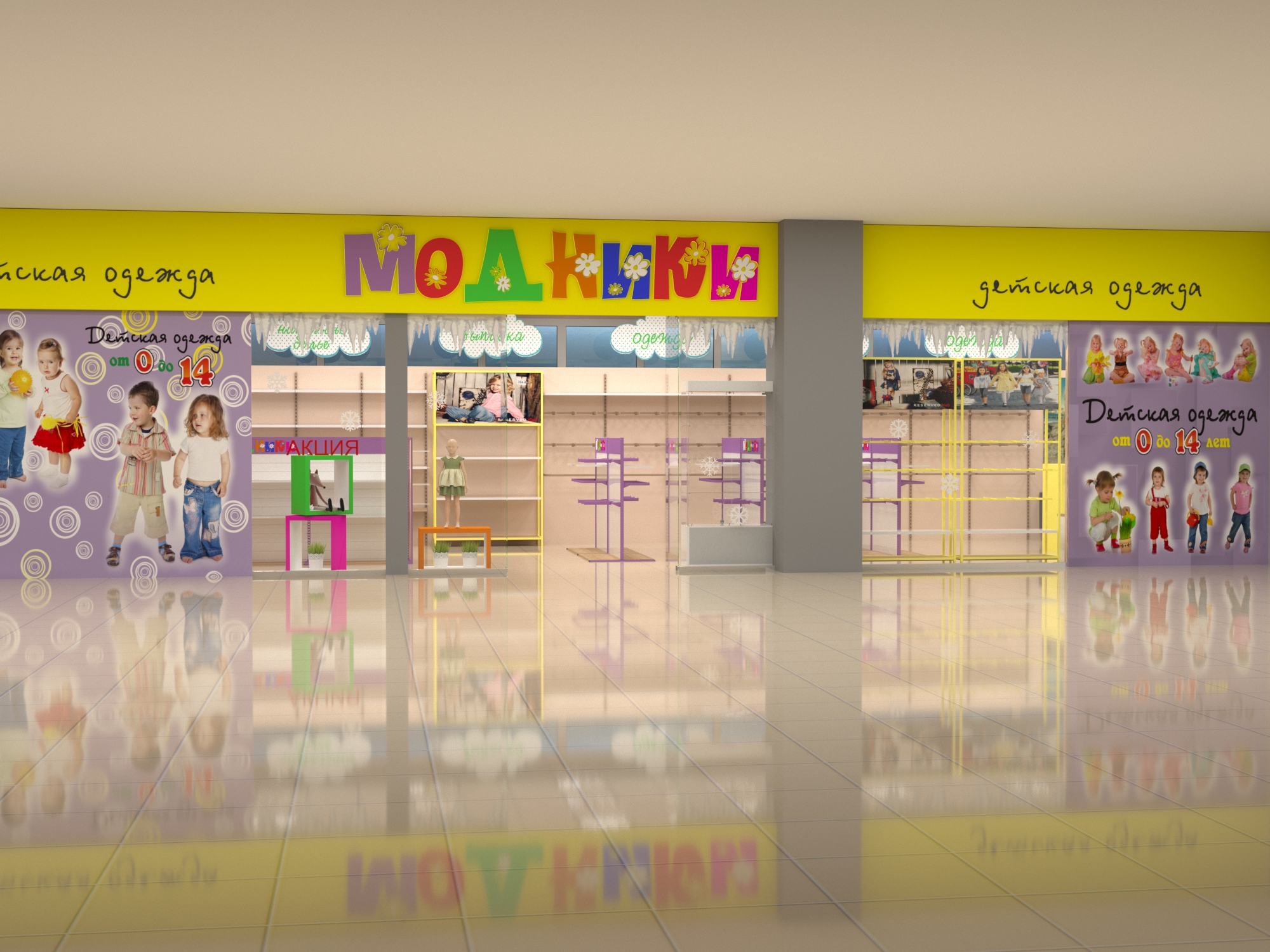 Задача - дизайн интерьера детской одежды, подготовка проекта для ТРК "Горки"
