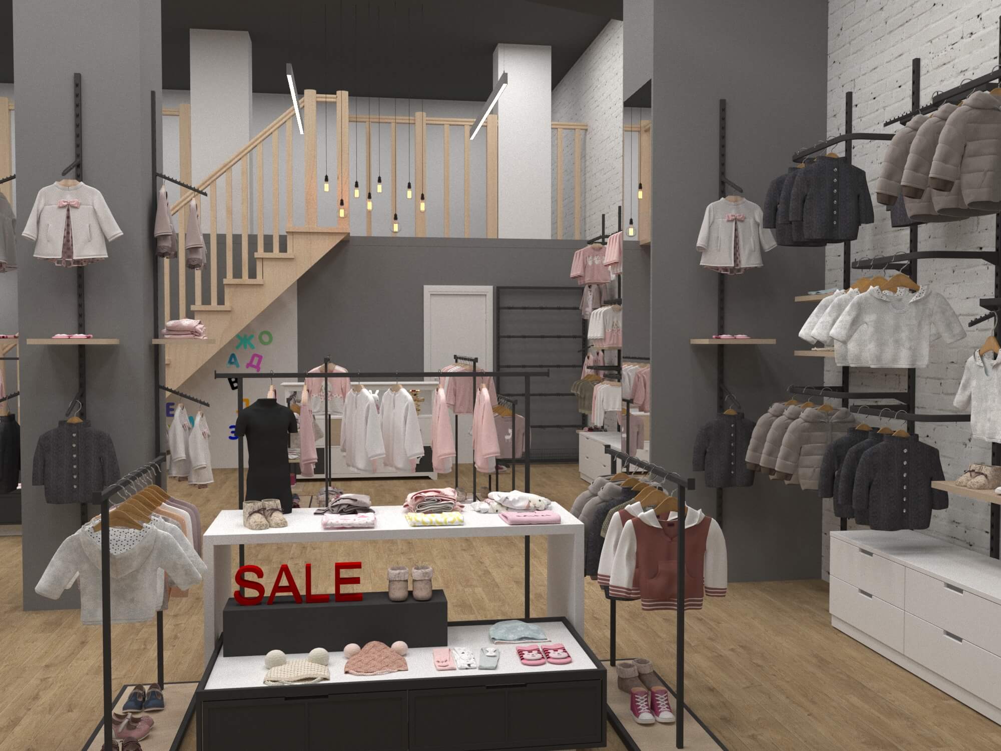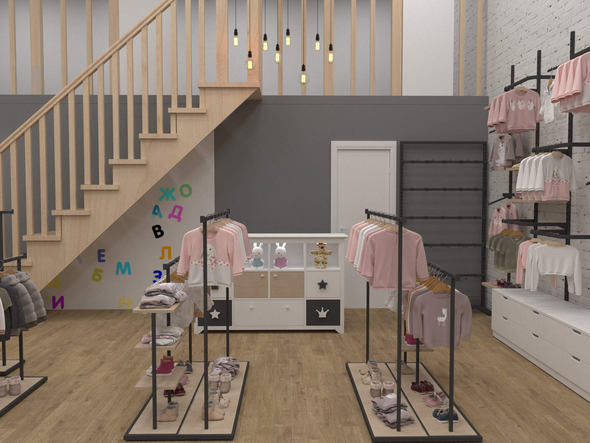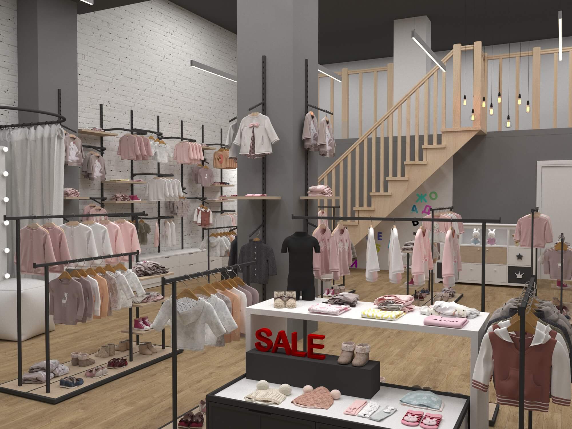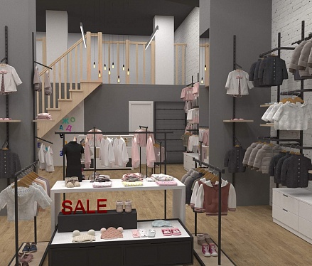 К разработке дизайна магазина для родителей и детей необходимо подходить особым образом: составить список необходимого оборудования, разработать особую цветовую палитру и перечень используемых материалов и поверхностей. Плюсом ко всему было принято решение составить дизайн-код помещения в стиле лофт, чтобы составить мягкую атмосферу уюта и спокойствия для всех посетителей.