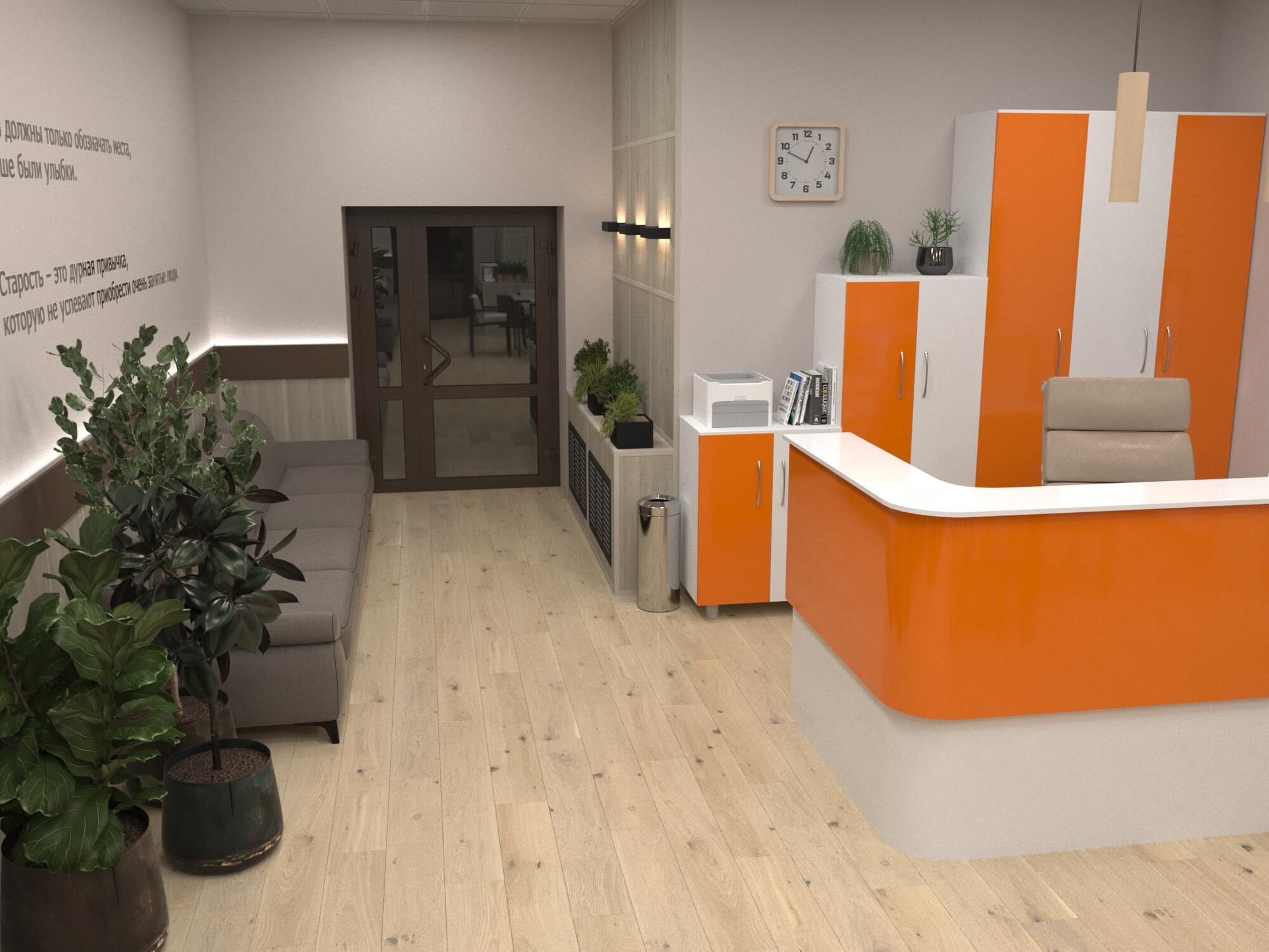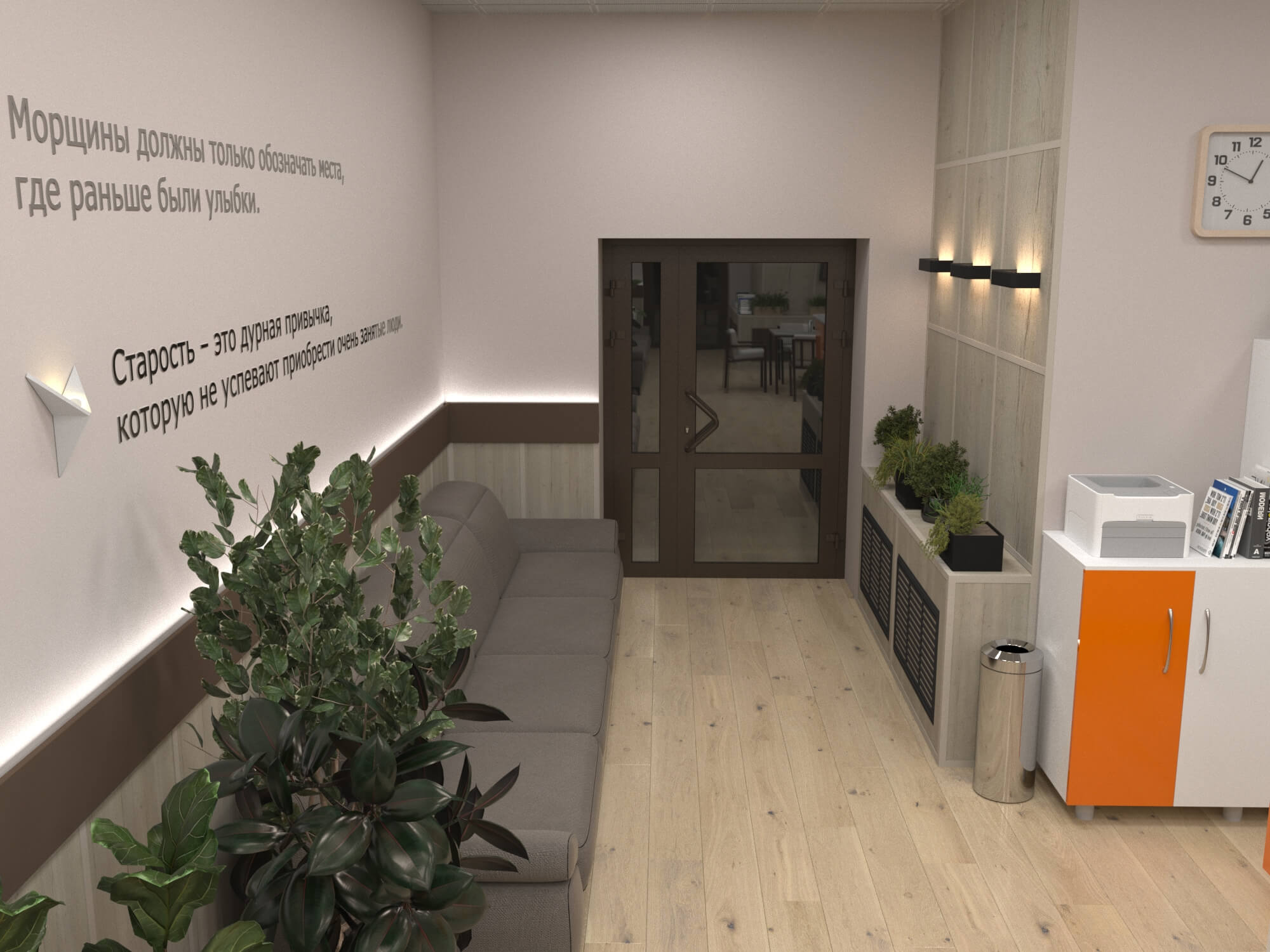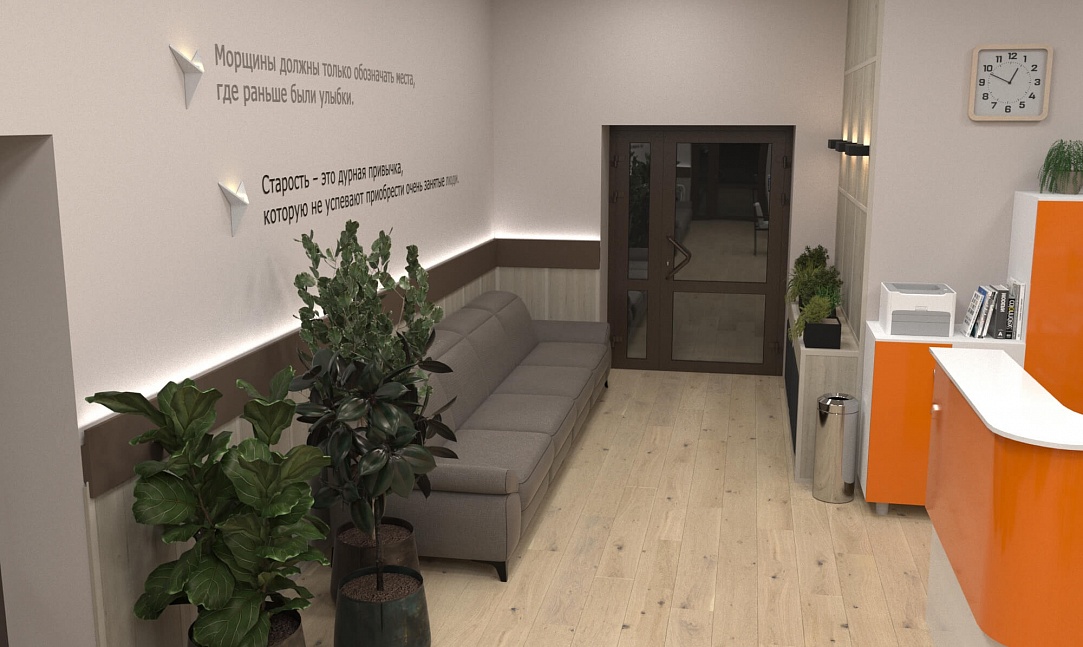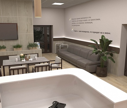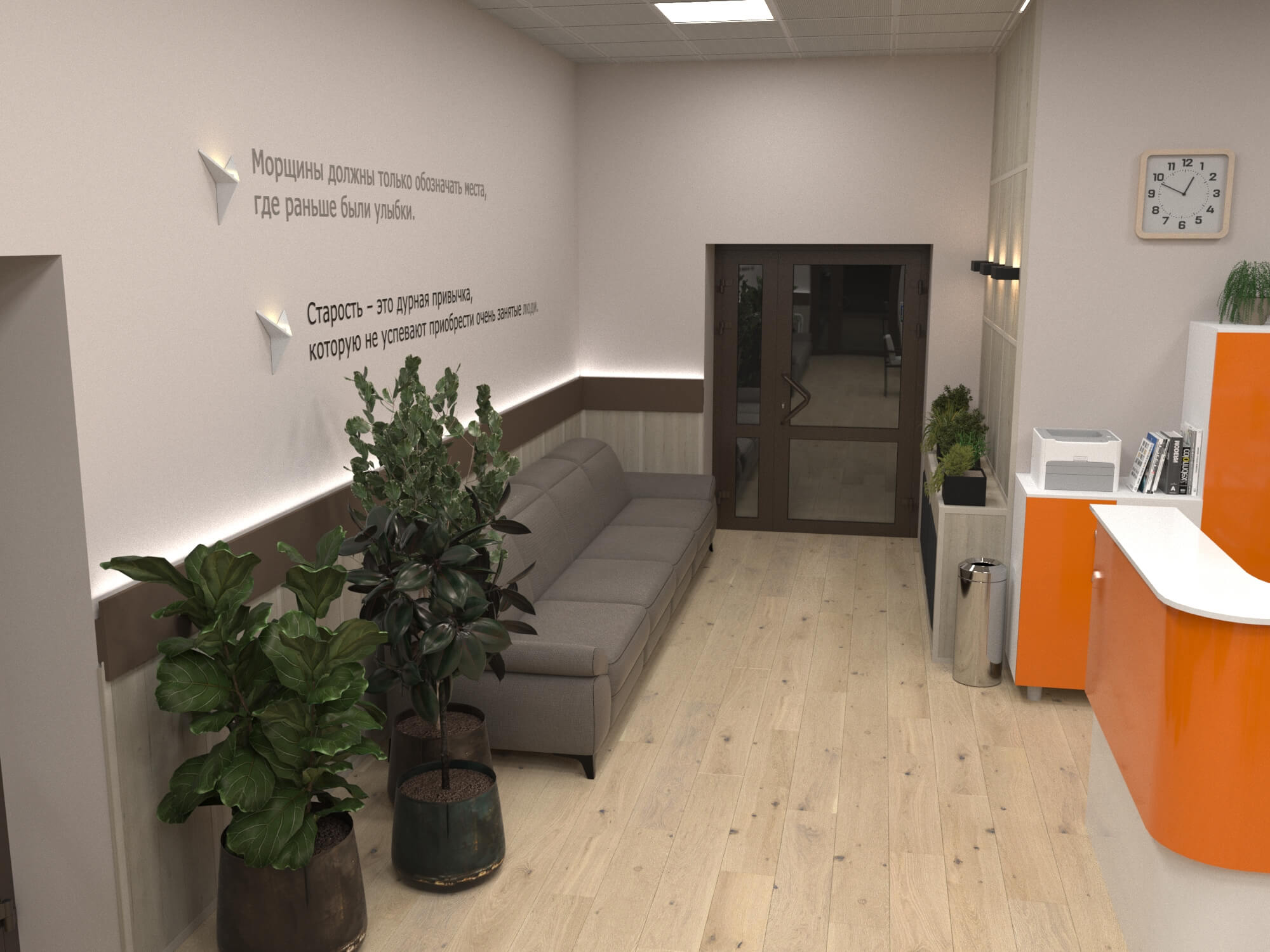 При проектировании данного объекта дизайнер поставил перед собой задачу сделать интерьер общественного места максимально уютным и домашним. Также заказчик обозначил, что стойку ресепшн и шкафы администрация оставляет и нужно вписать их в новый интерьер, что и было сделано.
