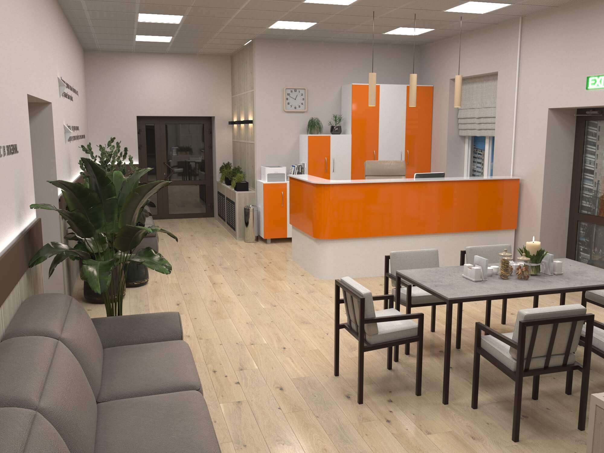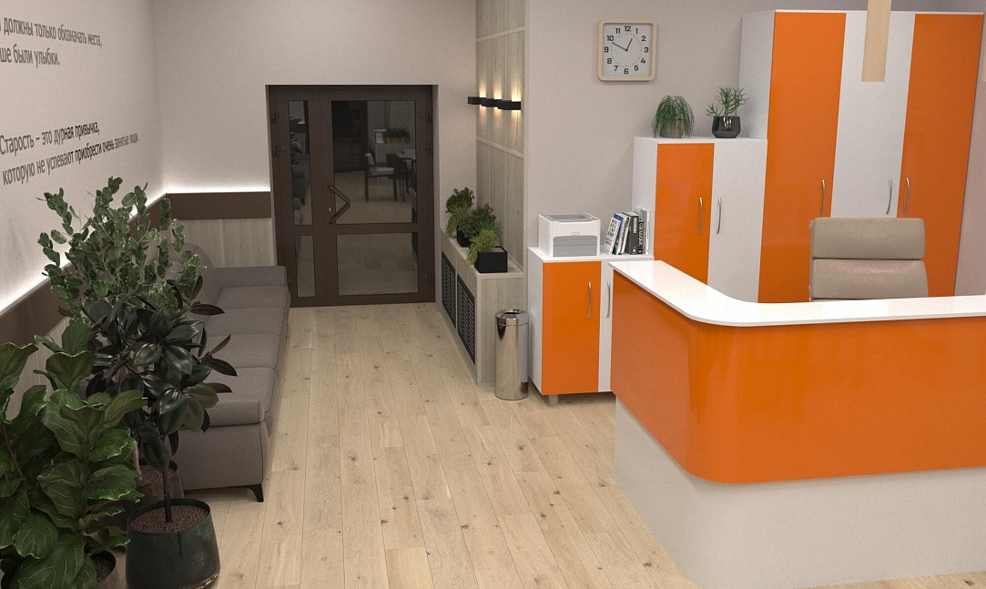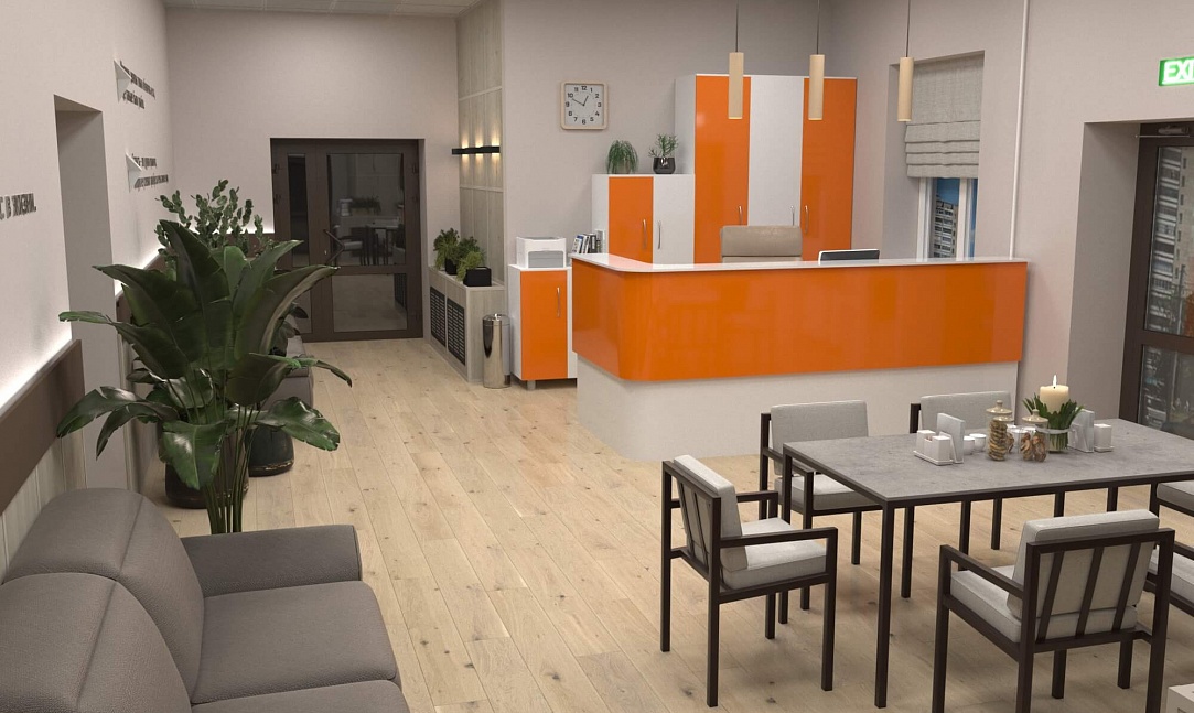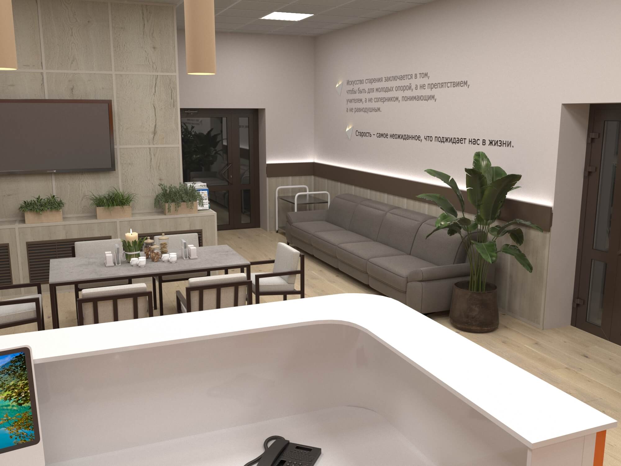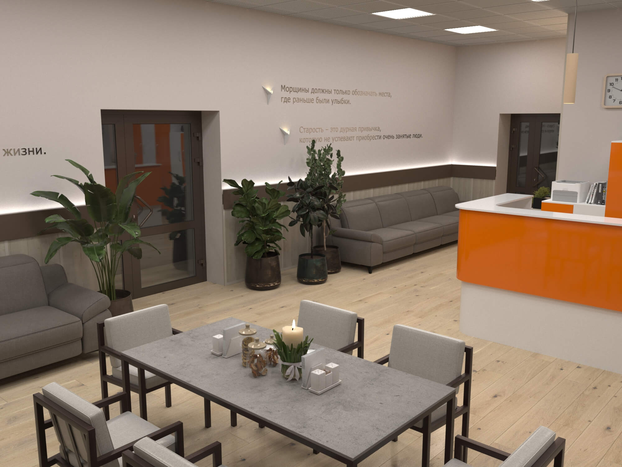 При проектировании данного объекта дизайнер поставил перед собой задачу сделать интерьер общественного места максимально уютным и домашним. Также заказчик обозначил, что стойку ресепшн и шкафы администрация оставляет и нужно вписать их в новый интерьер, что и было сделано.
