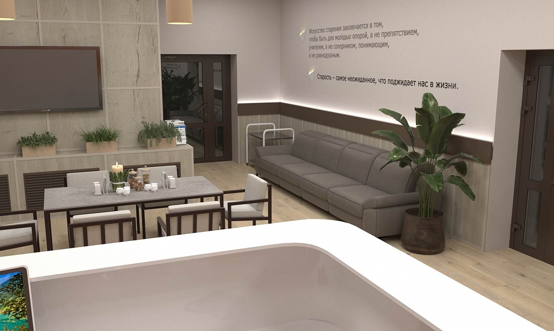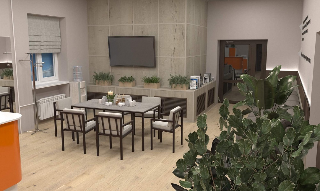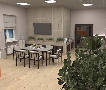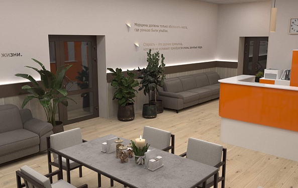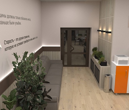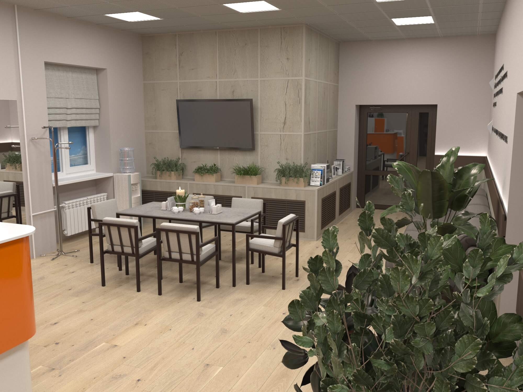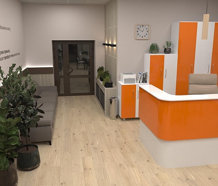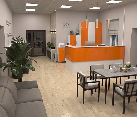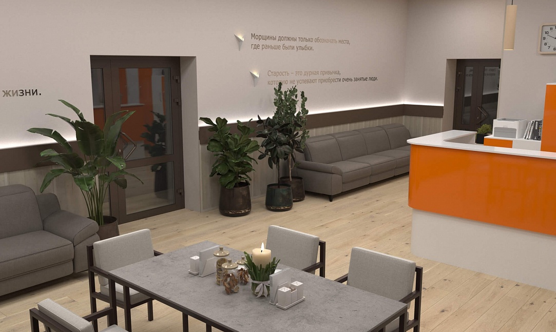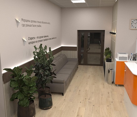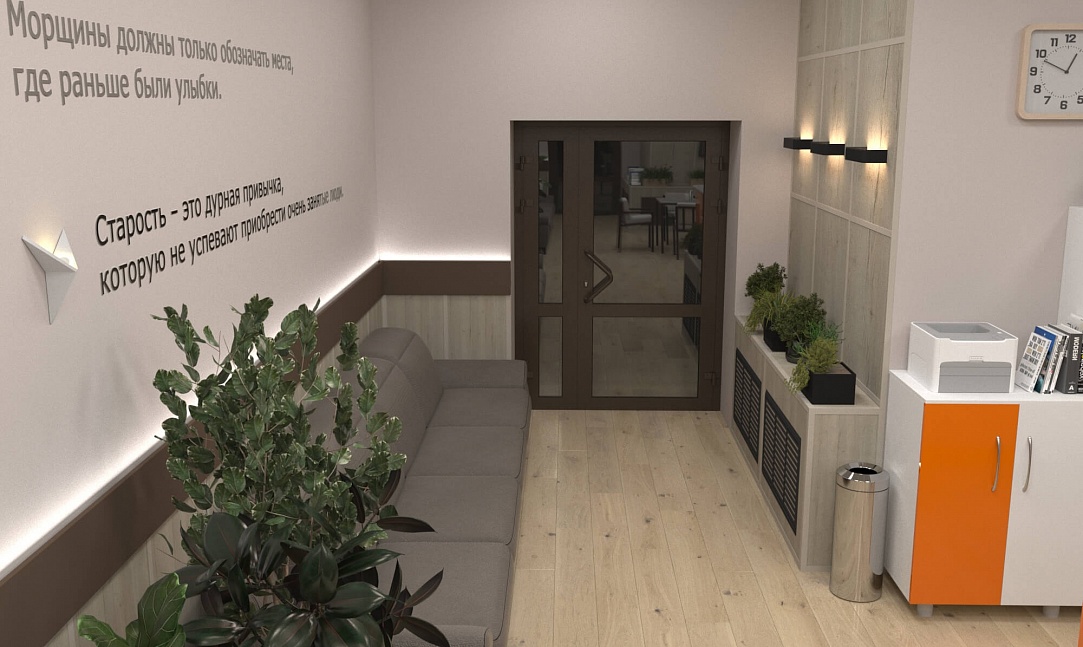 При проектировании данного объекта дизайнер поставил перед собой задачу сделать интерьер общественного места максимально уютным и домашним. Также заказчик обозначил, что стойку ресепшн и шкафы администрация оставляет и нужно вписать их в новый интерьер, что и было сделано.