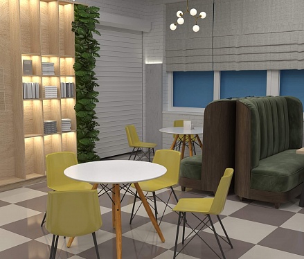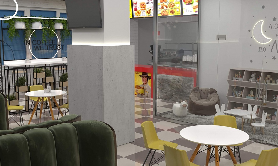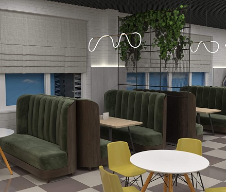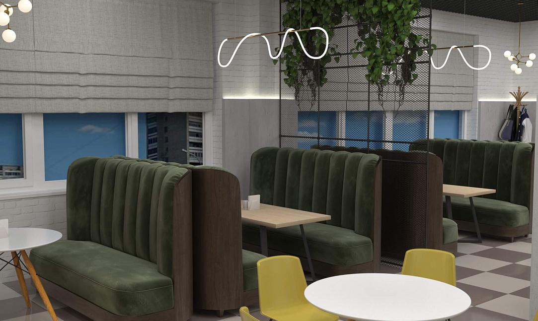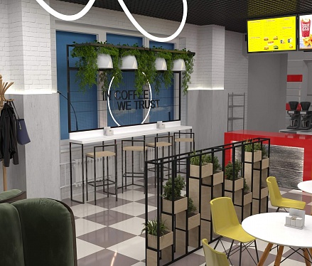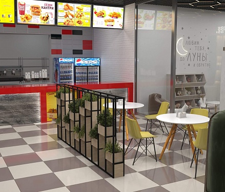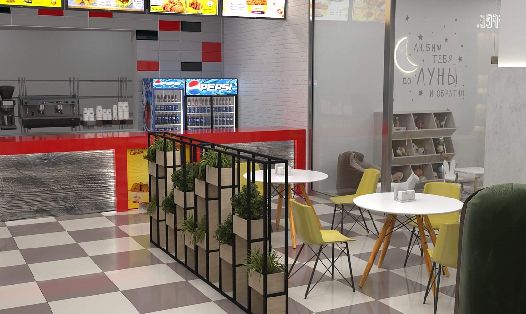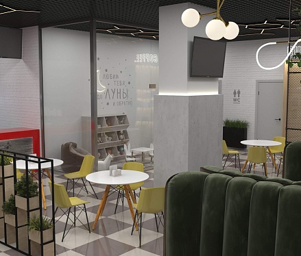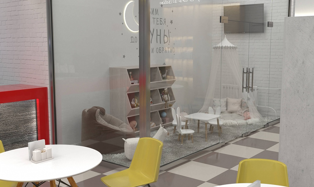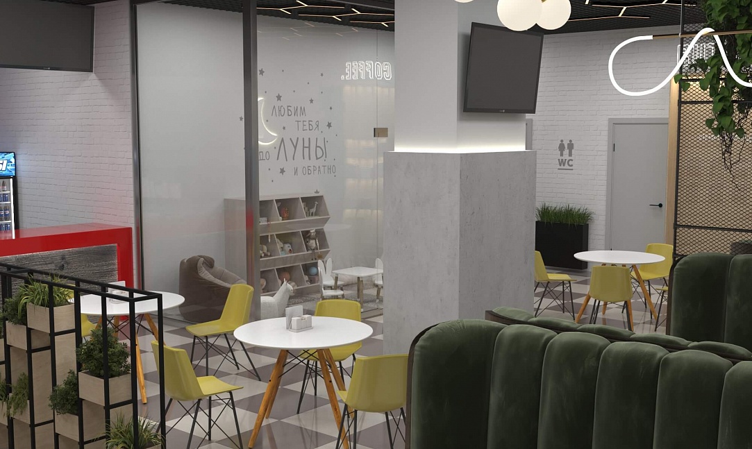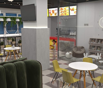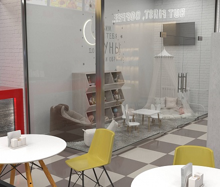 Пожелание заказчика — частично обновить интерьер, привести существующее кафе к современному внешнему виду, спроектировать детскую зону и посадочные места. С помощью новой мебели и интерьерных декоров внешний вид кафе стал соответствовать поставленной задаче. Используемые материалы: Металл, ЛДСП, МДФ, постформинг, световые неоновые вывески.