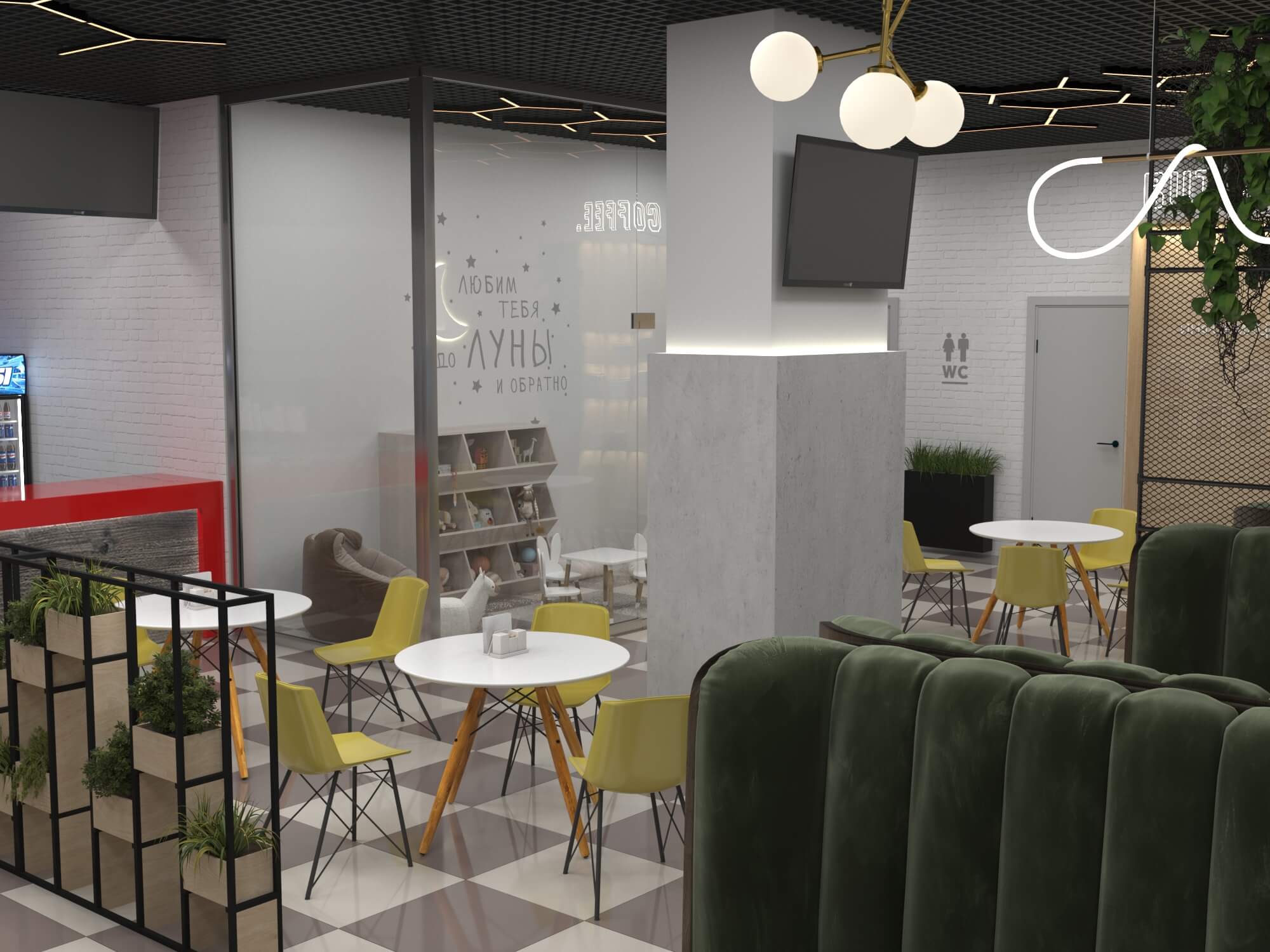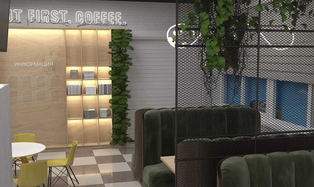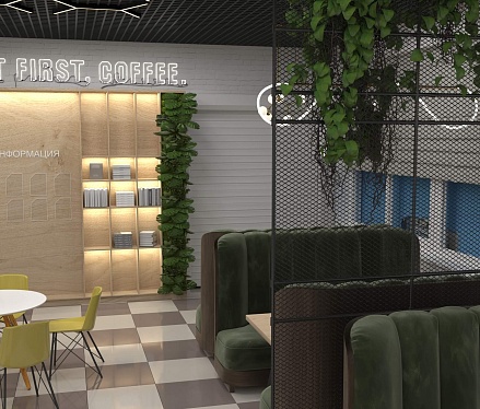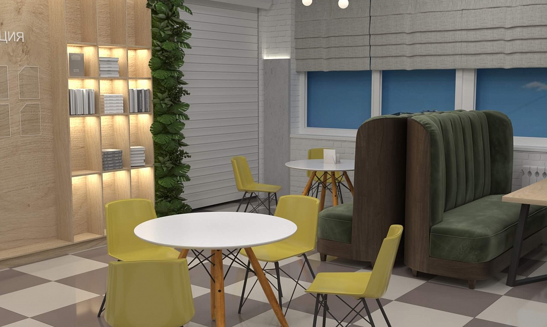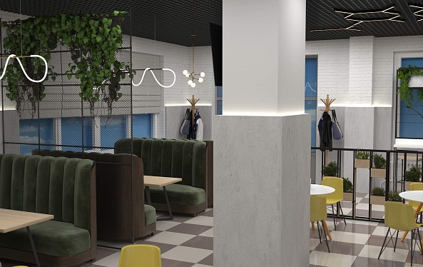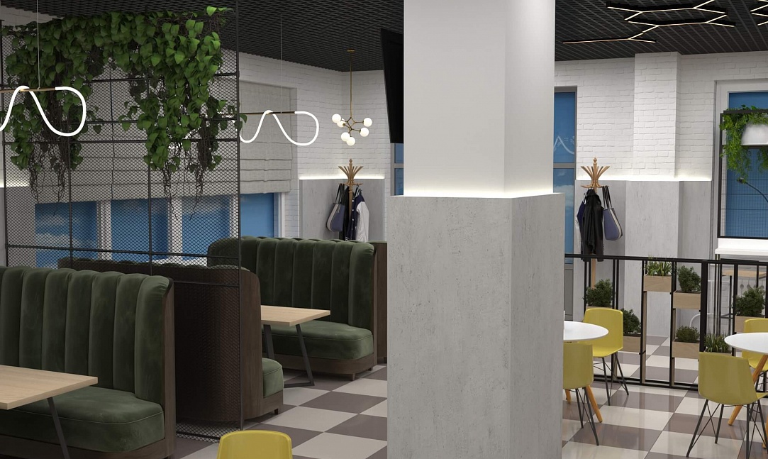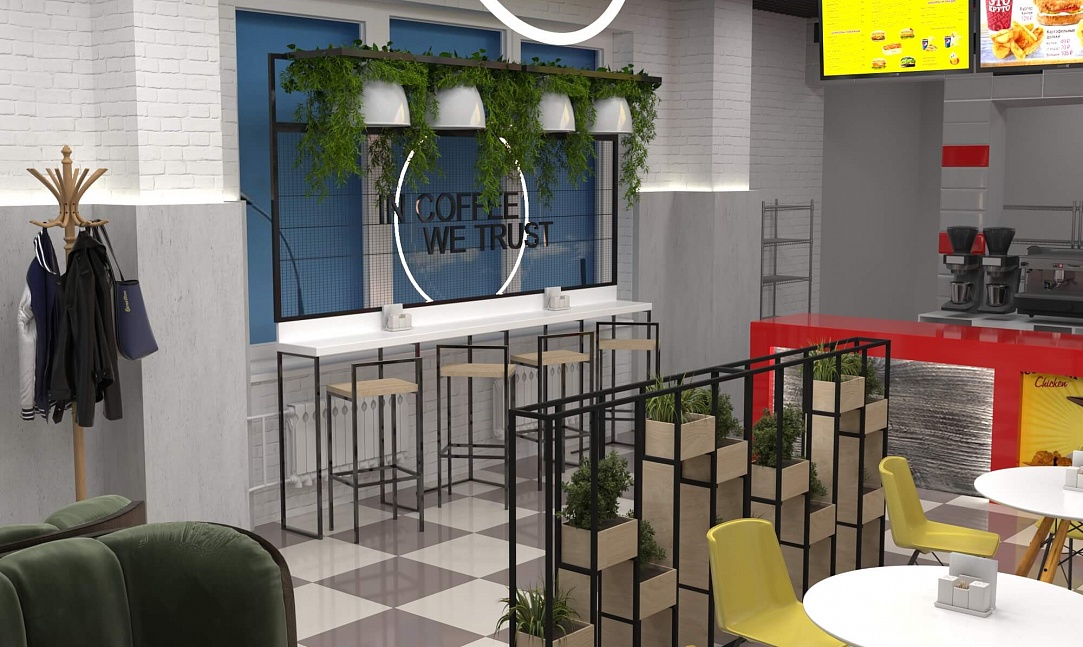 Пожелание заказчика — частично обновить интерьер, привести существующее кафе к современному внешнему виду, спроектировать детскую зону и посадочные места. С помощью новой мебели и интерьерных декоров внешний вид кафе стал соответствовать поставленной задаче. Используемые материалы: Металл, ЛДСП, МДФ, постформинг, световые неоновые вывески.