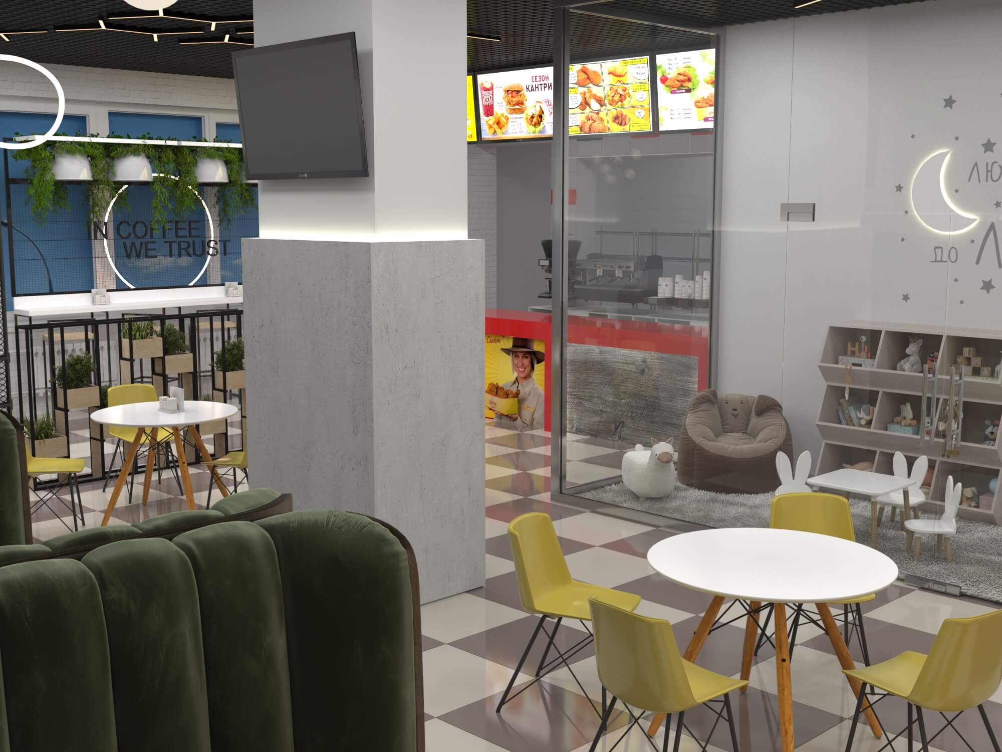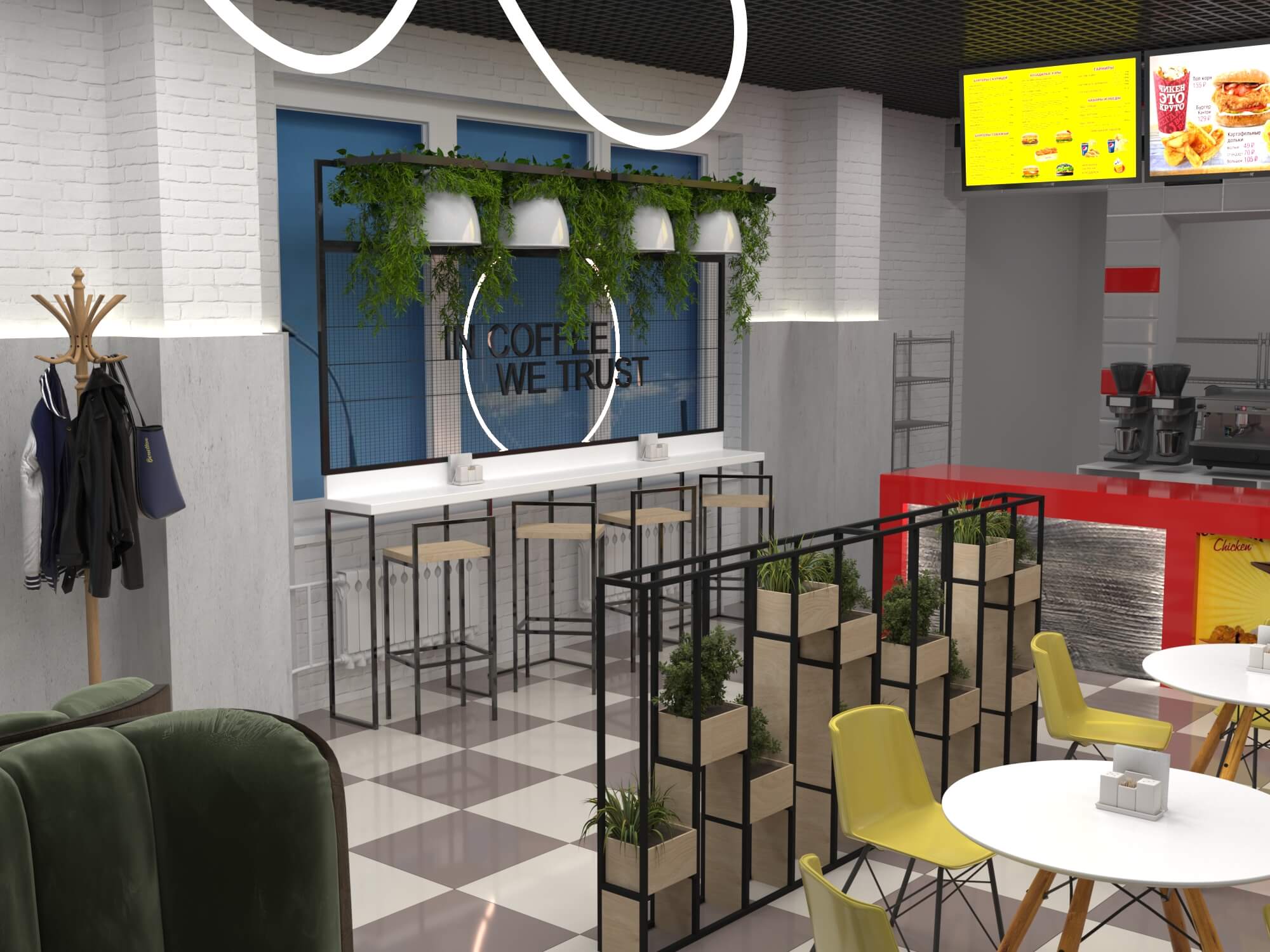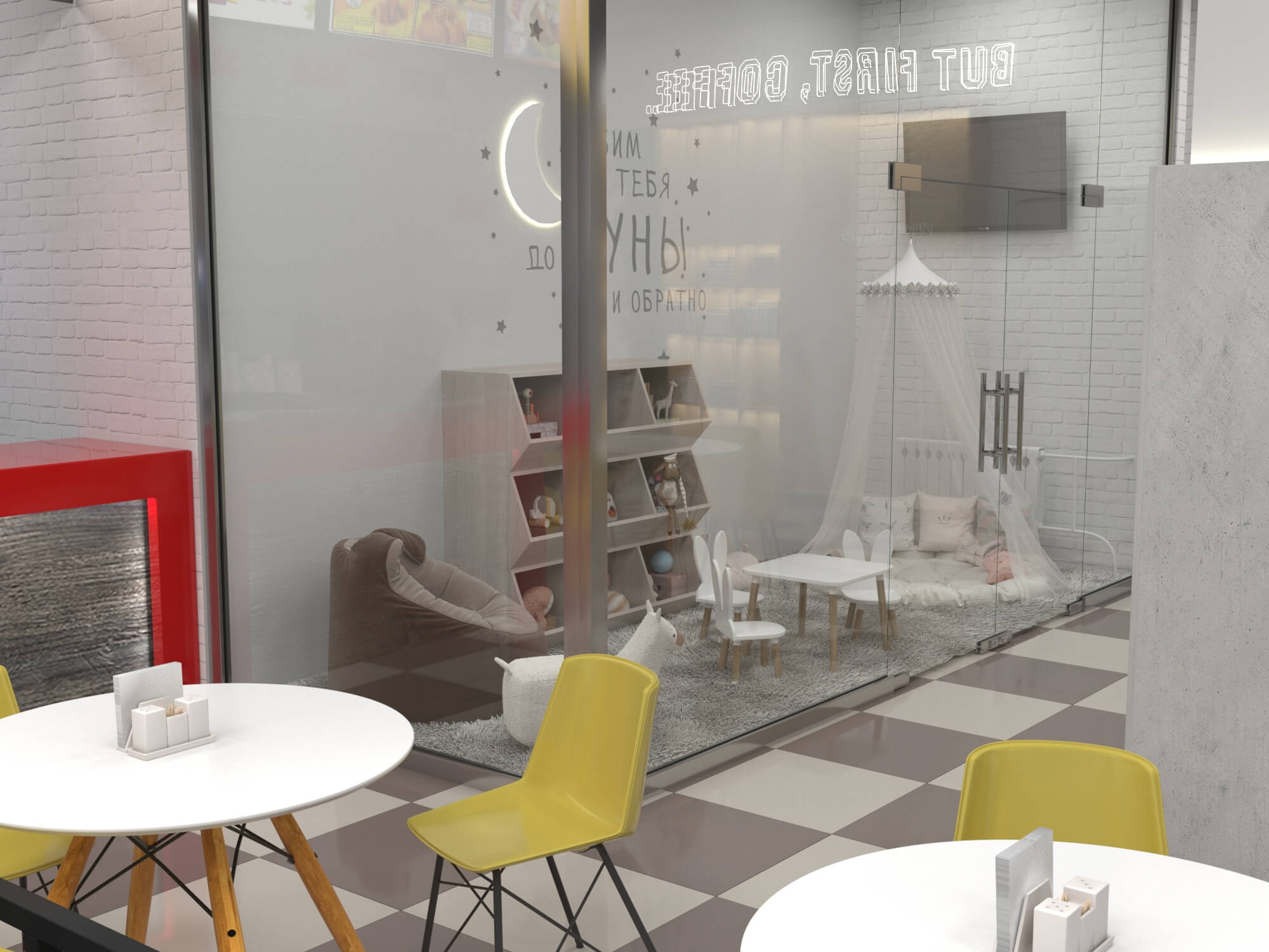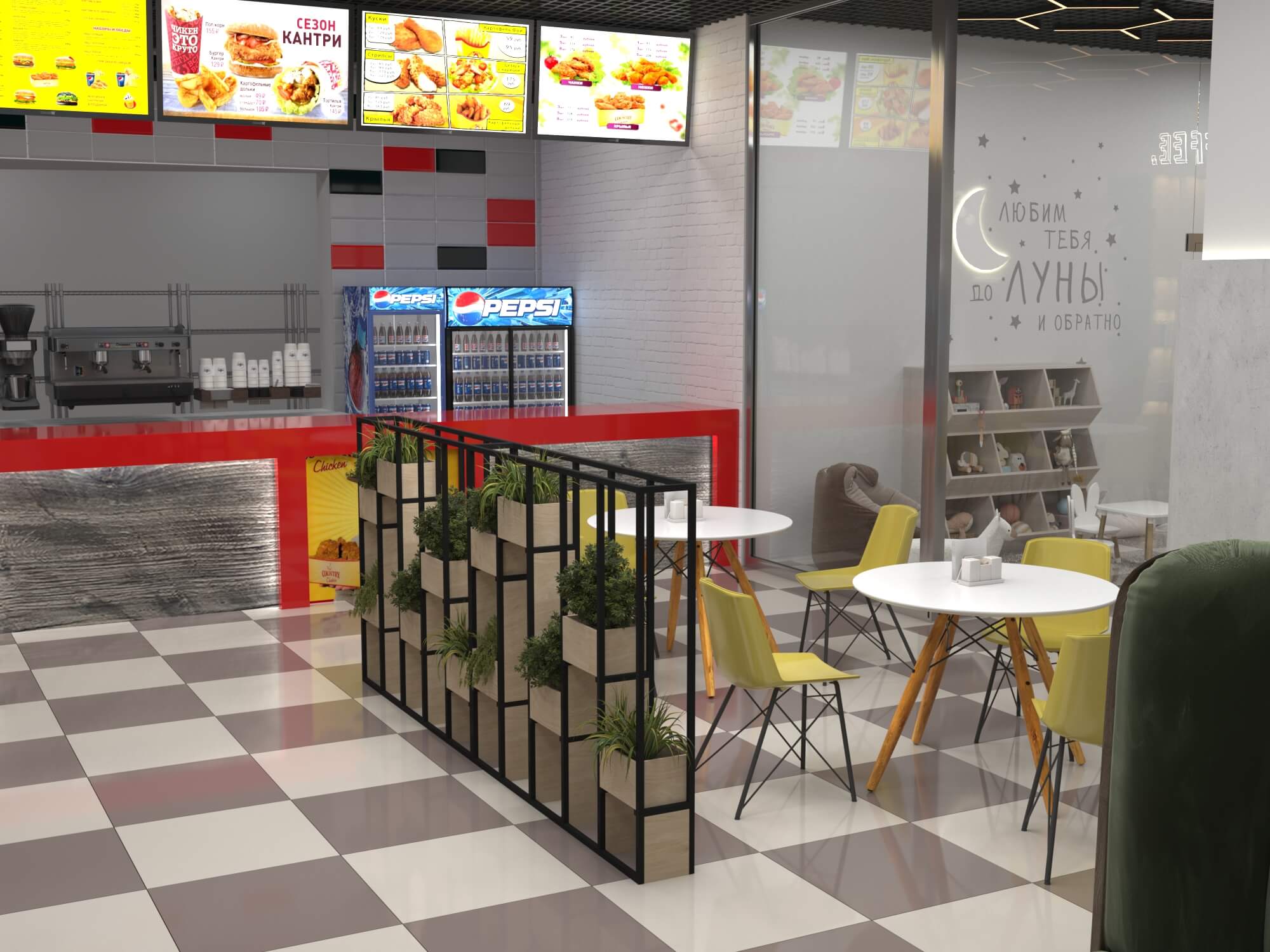 Пожелание заказчика — частично обновить интерьер, привести существующее кафе к современному внешнему виду, спроектировать детскую зону и посадочные места. С помощью новой мебели и интерьерных декоров внешний вид кафе стал соответствовать поставленной задаче. Используемые материалы: Металл, ЛДСП, МДФ, постформинг, световые неоновые вывески.