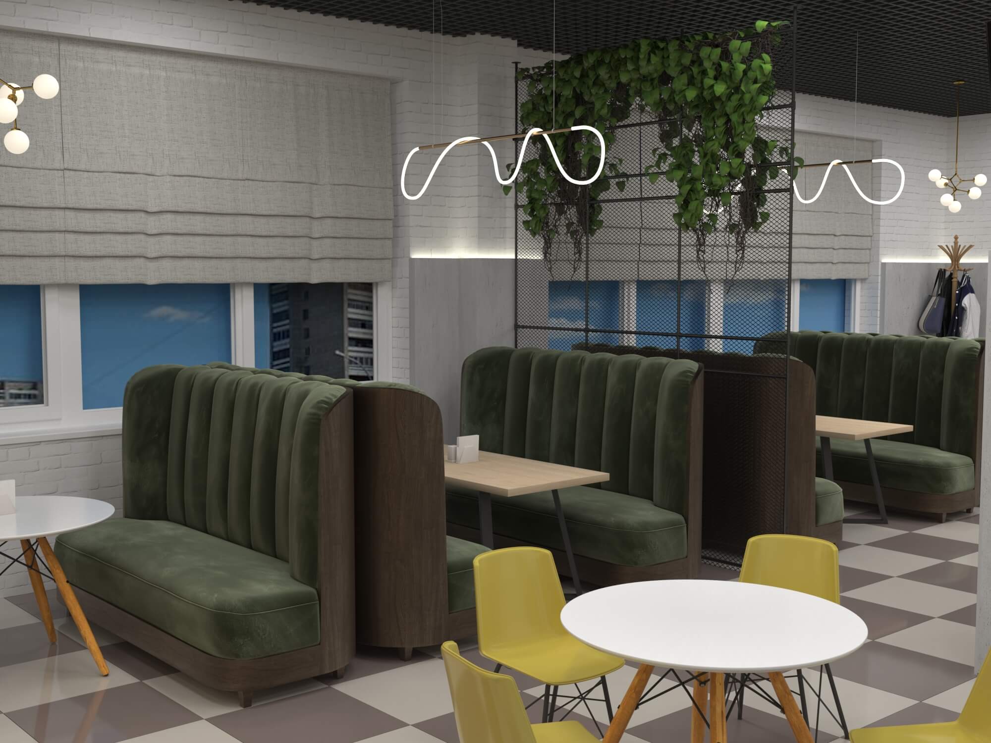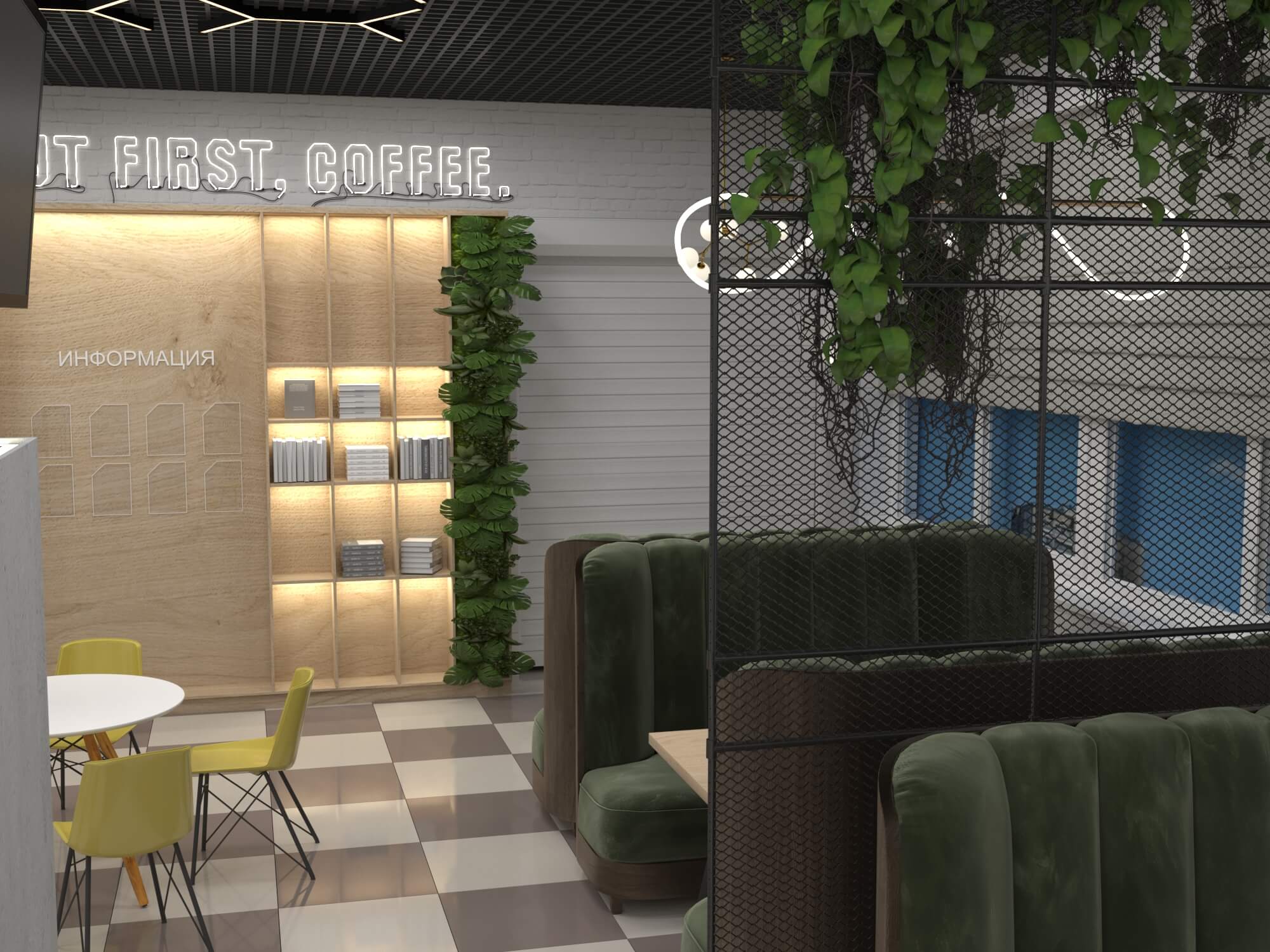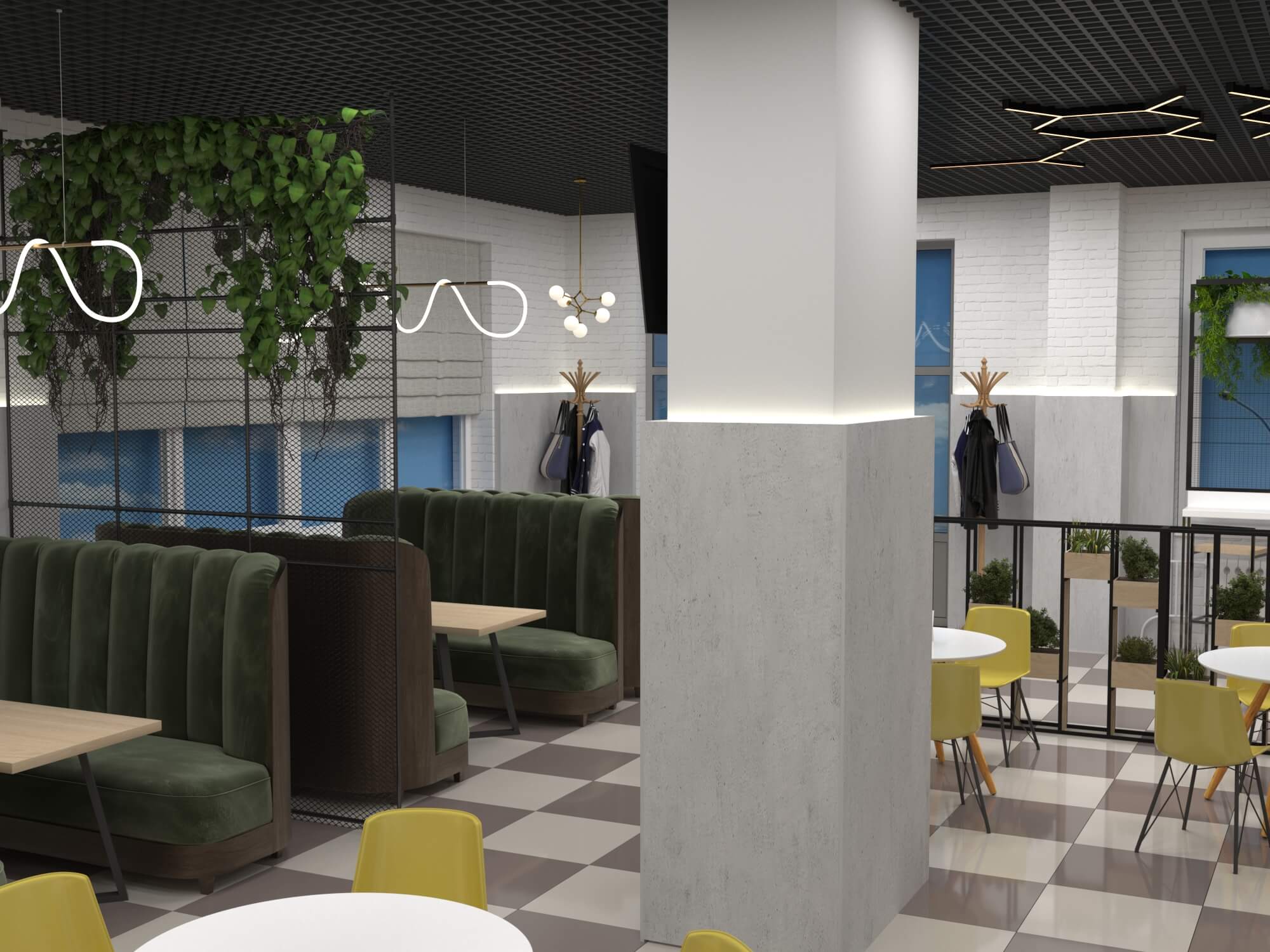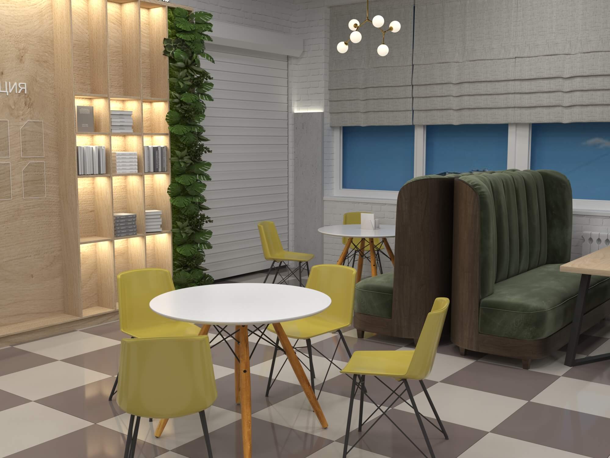Пожелание заказчика — частично обновить интерьер, привести существующее кафе к современному внешнему виду, спроектировать детскую зону и посадочные места. С помощью новой мебели и интерьерных декоров внешний вид кафе стал соответствовать поставленной задаче. Используемые материалы: Металл, ЛДСП, МДФ, постформинг, световые неоновые вывески.