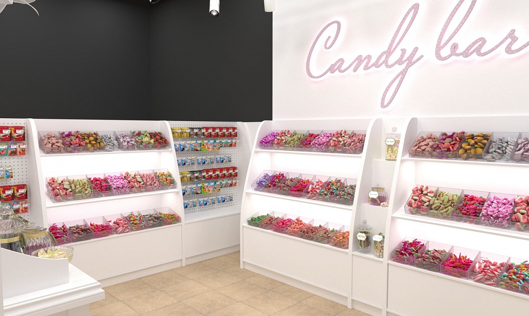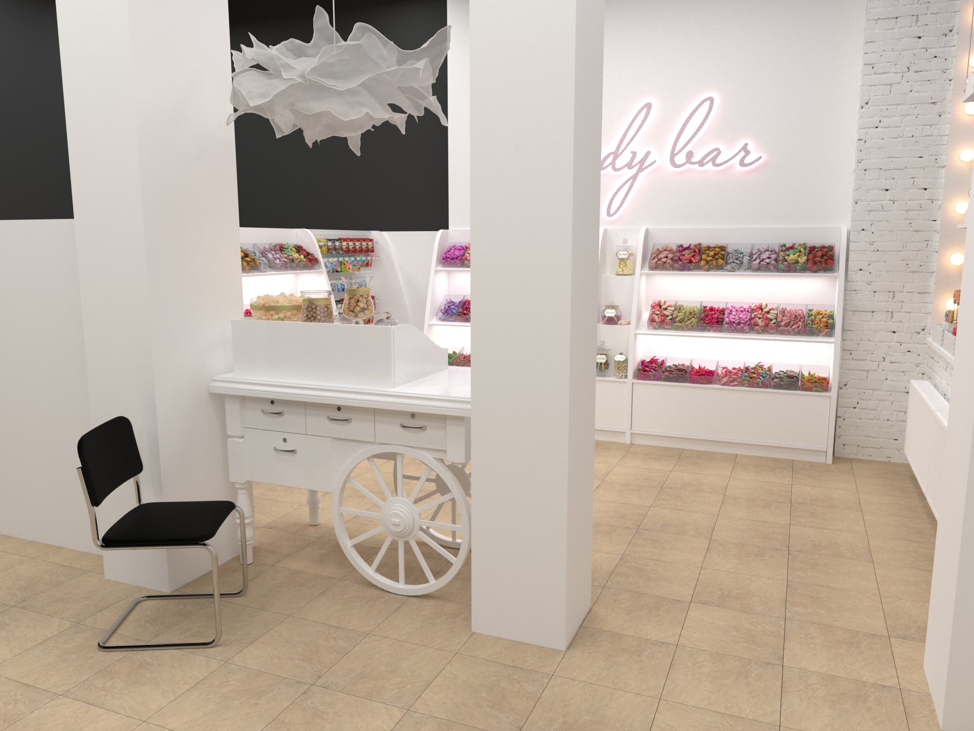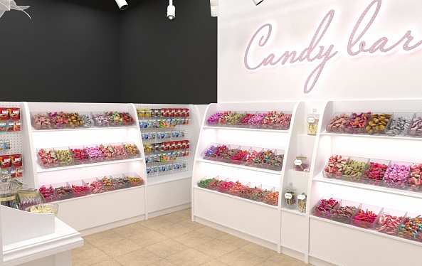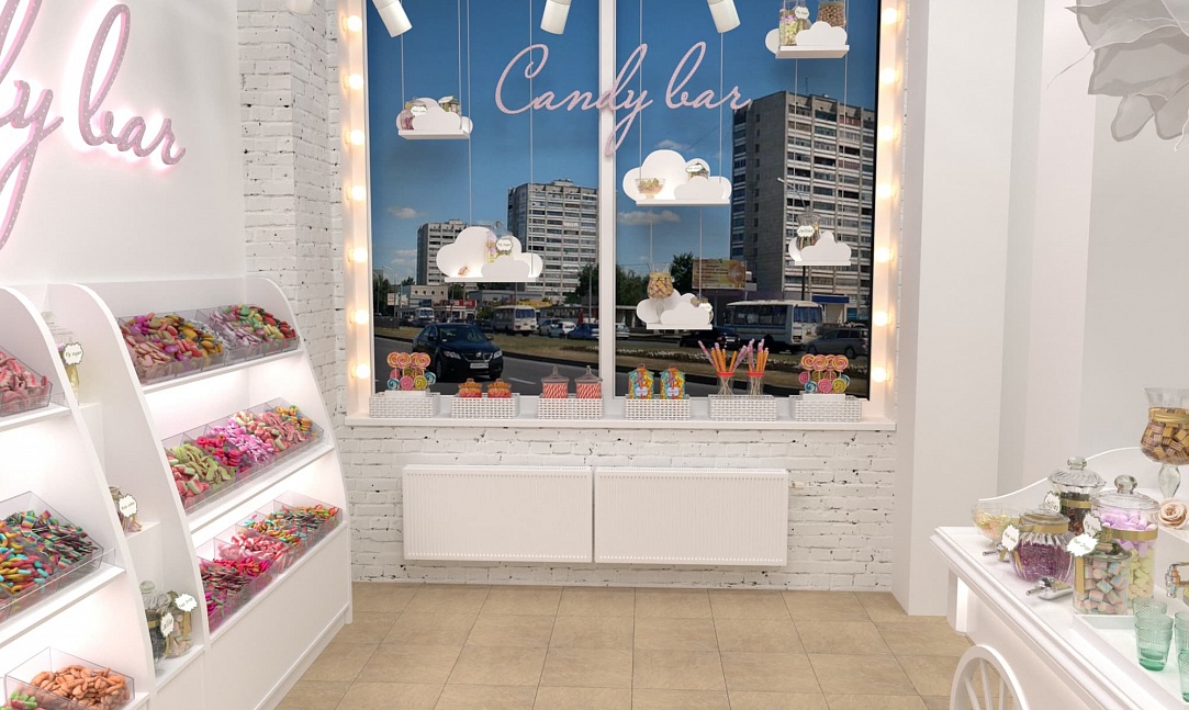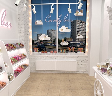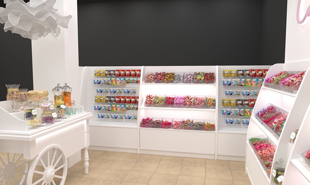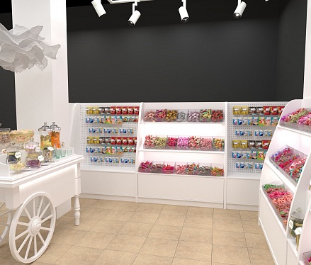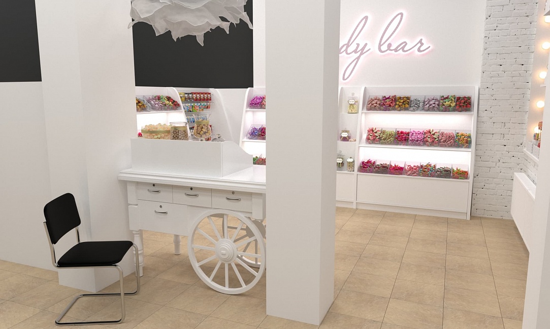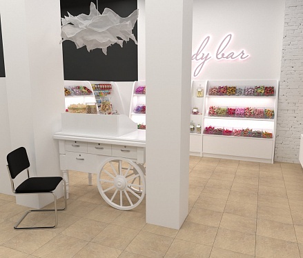 Аппетитными могут быть не только сладости, но и дизайн кондитерской. У такого проекта всё на виду и все элементы находятся на своих местах: перфорированные панели держат на крючках небольшие сладости, короба хранения из чистого акрила выставляют на обозрение вкуснейшие угощения на развес, находясь при этом на стильных светлых витринах. К имеющимся элементам интерьера было принято решение добавить небольшую стационарную тележку, служащую одновременно кассой и витриной для посетителей, а также кружевные абажуры на освещение, завершающие образ небольшой кондитерской.