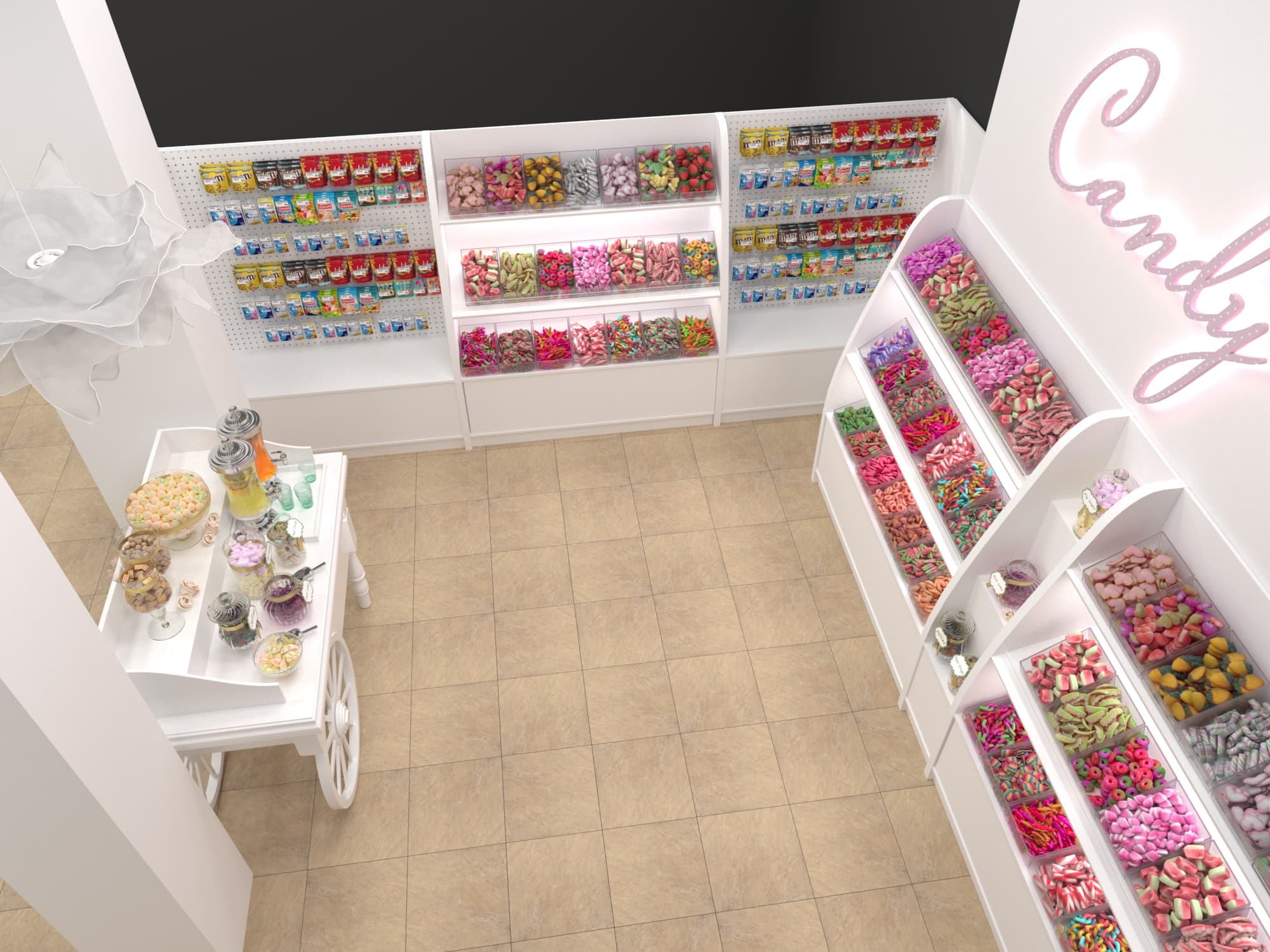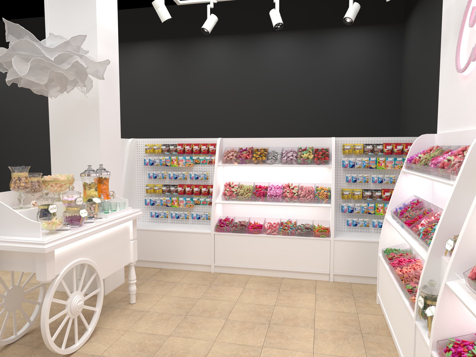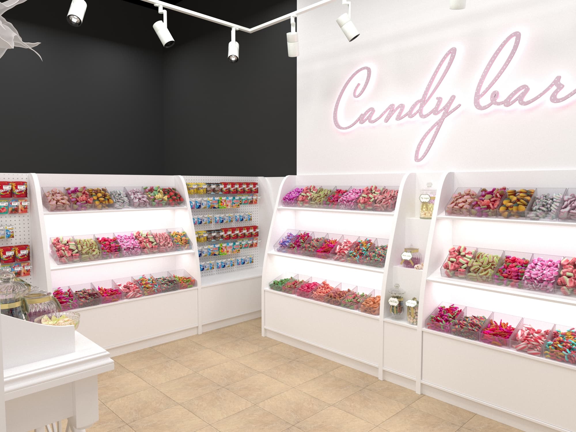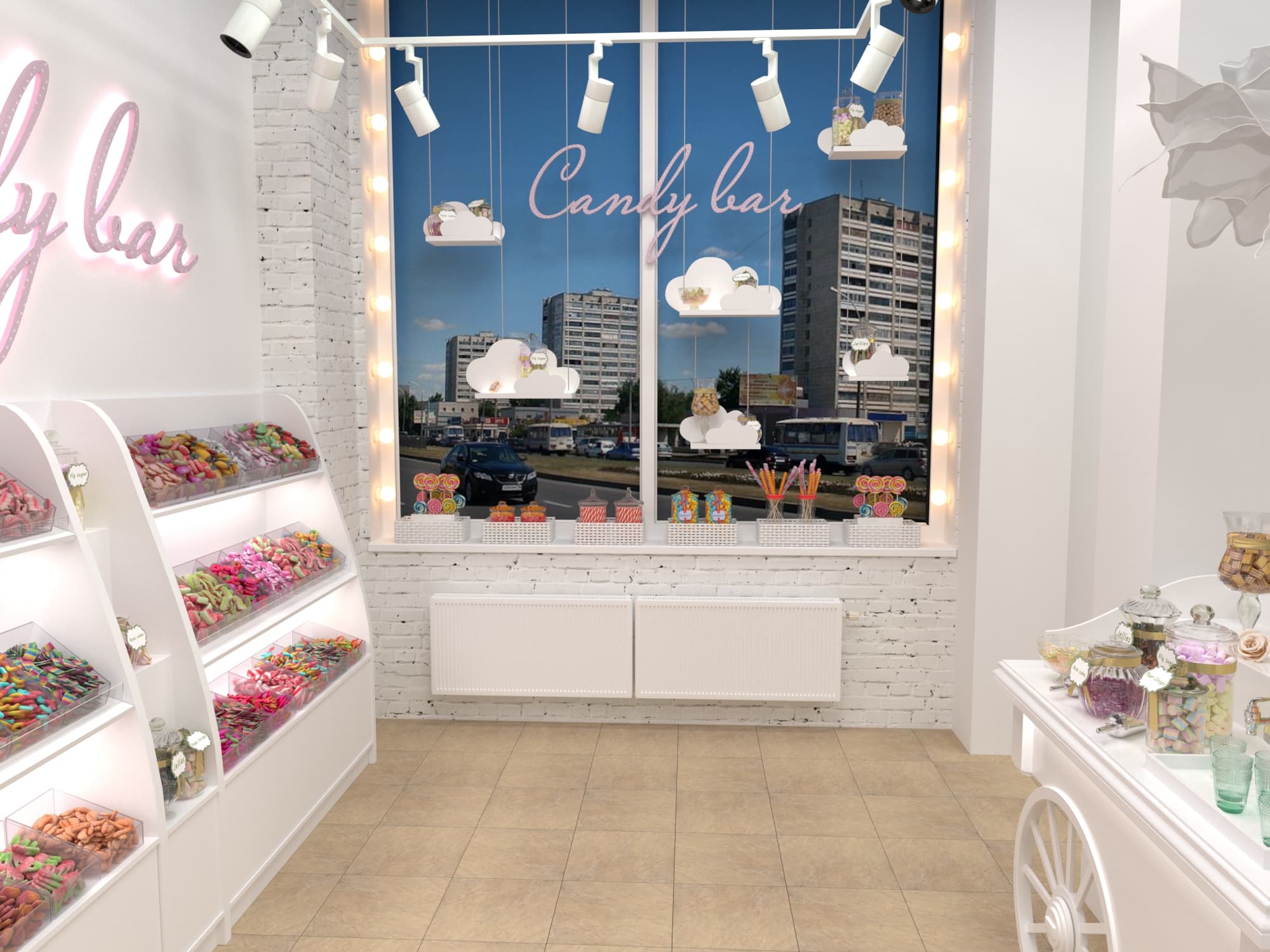 Аппетитными могут быть не только сладости, но и дизайн кондитерской. У такого проекта всё на виду и все элементы находятся на своих местах: перфорированные панели держат на крючках небольшие сладости, короба хранения из чистого акрила выставляют на обозрение вкуснейшие угощения на развес, находясь при этом на стильных светлых витринах. К имеющимся элементам интерьера было принято решение добавить небольшую стационарную тележку, служащую одновременно кассой и витриной для посетителей, а также кружевные абажуры на освещение, завершающие образ небольшой кондитерской.