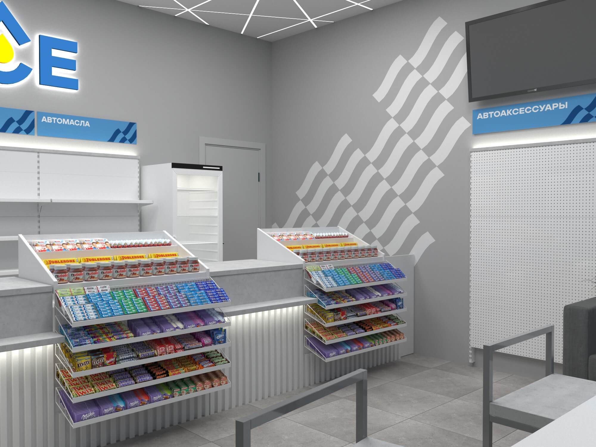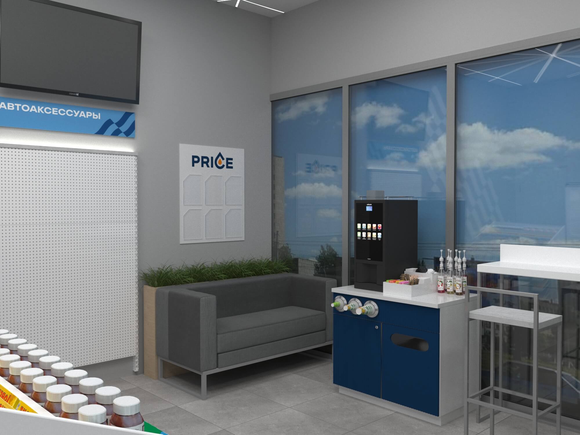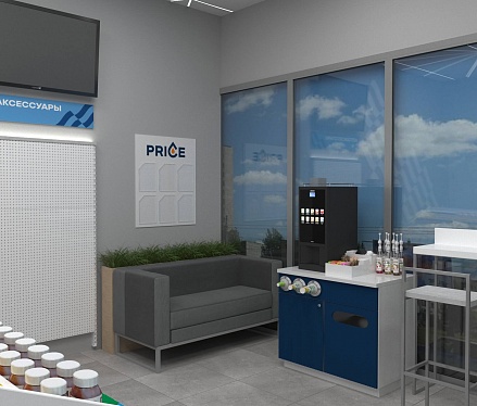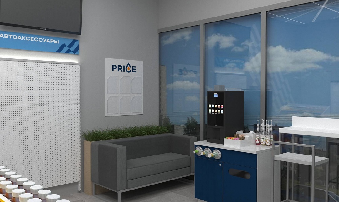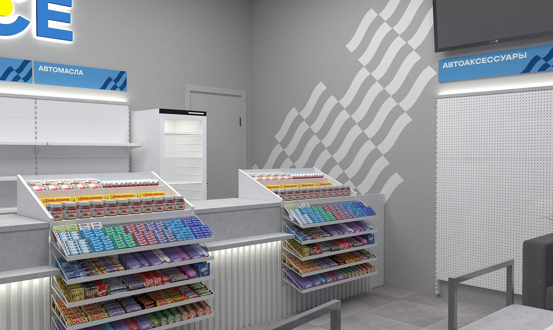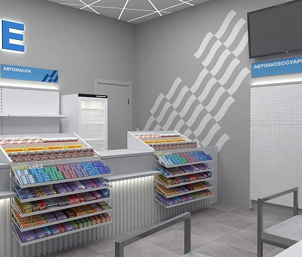Задача - разработать дизайн магазина АЗС. Пожелания клиента - торговля через прилавок. Также надо было разместить кофекорнер, холодильные шкафы и зону отдыха. Бренд бук был предоставлен заказчиком, фирменный стиль отражен в интерьере. На основании этой концепции было изготовлено оборудование для двух точек.