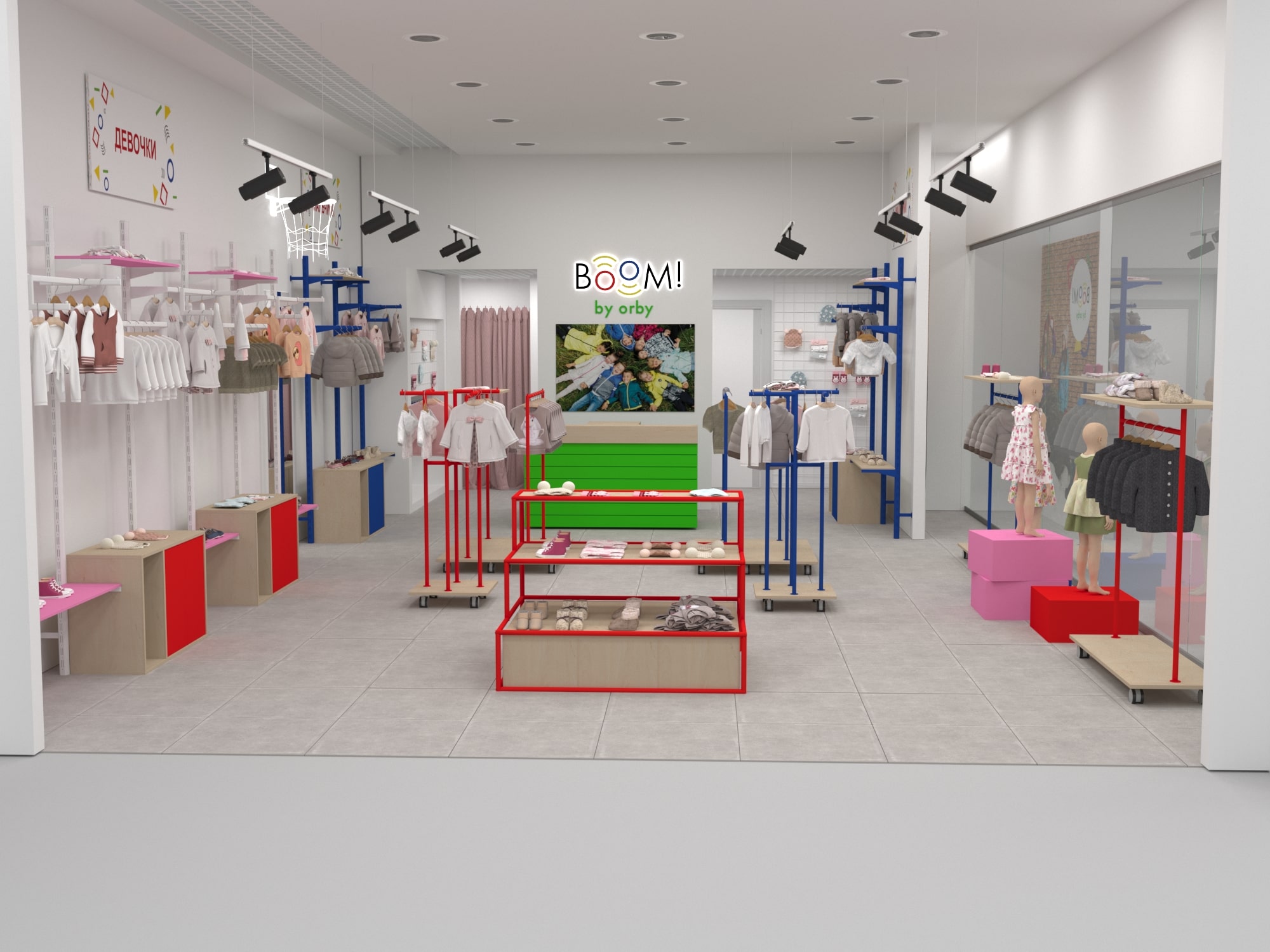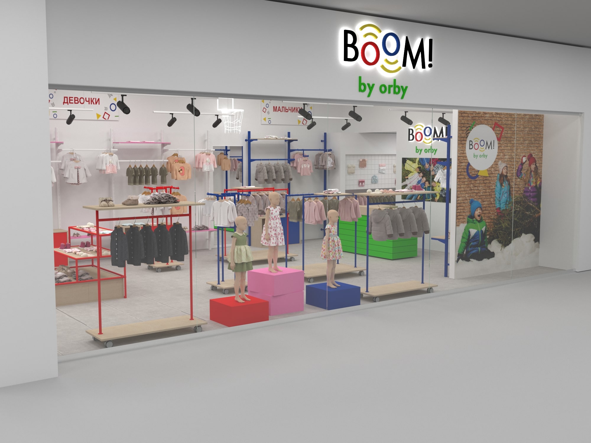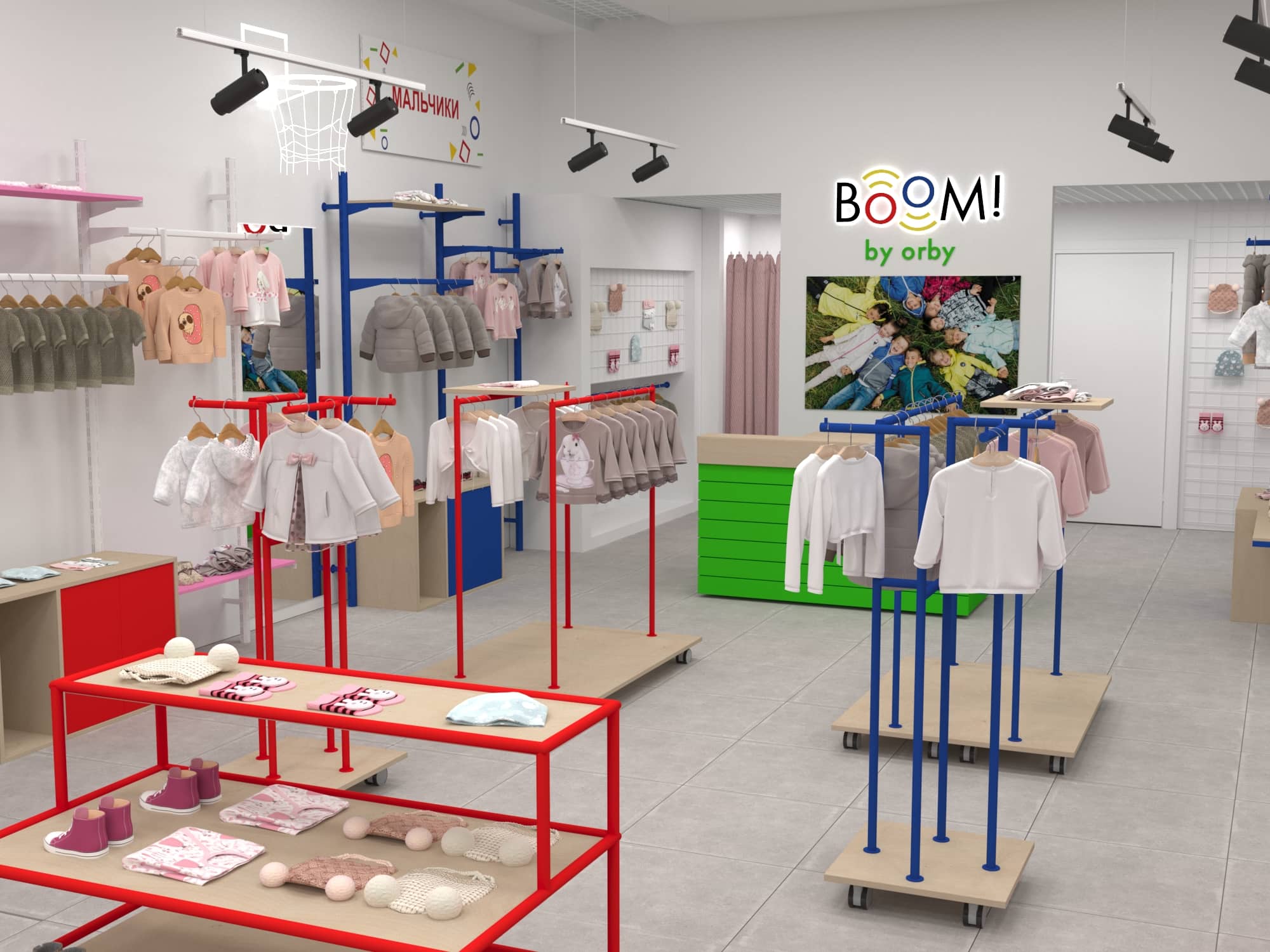 Для уже известного по всей стране магазина одежды для детей "BOOM by orby" был разработан особенный дизайн проект магазина.