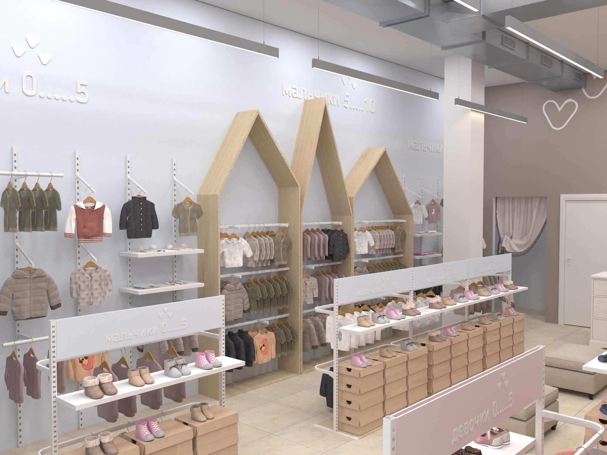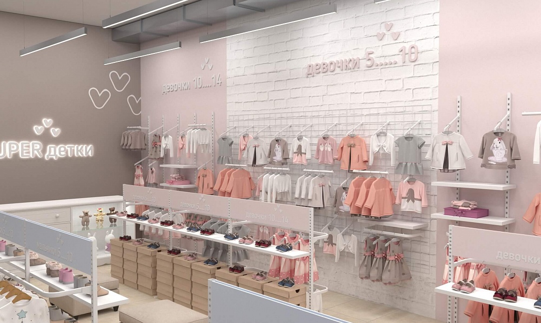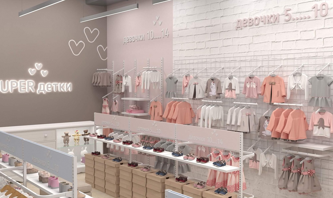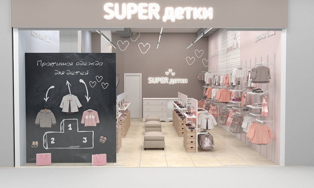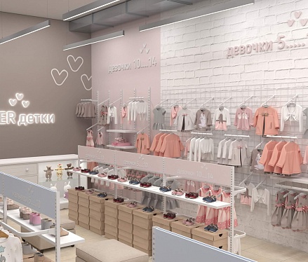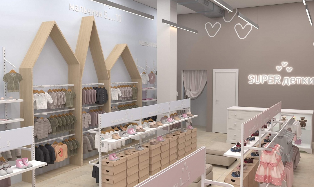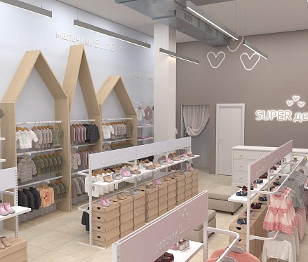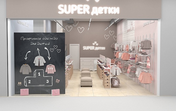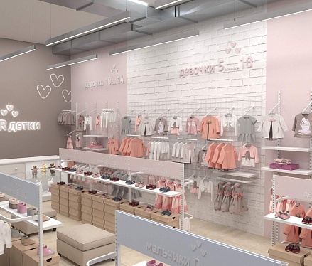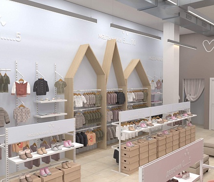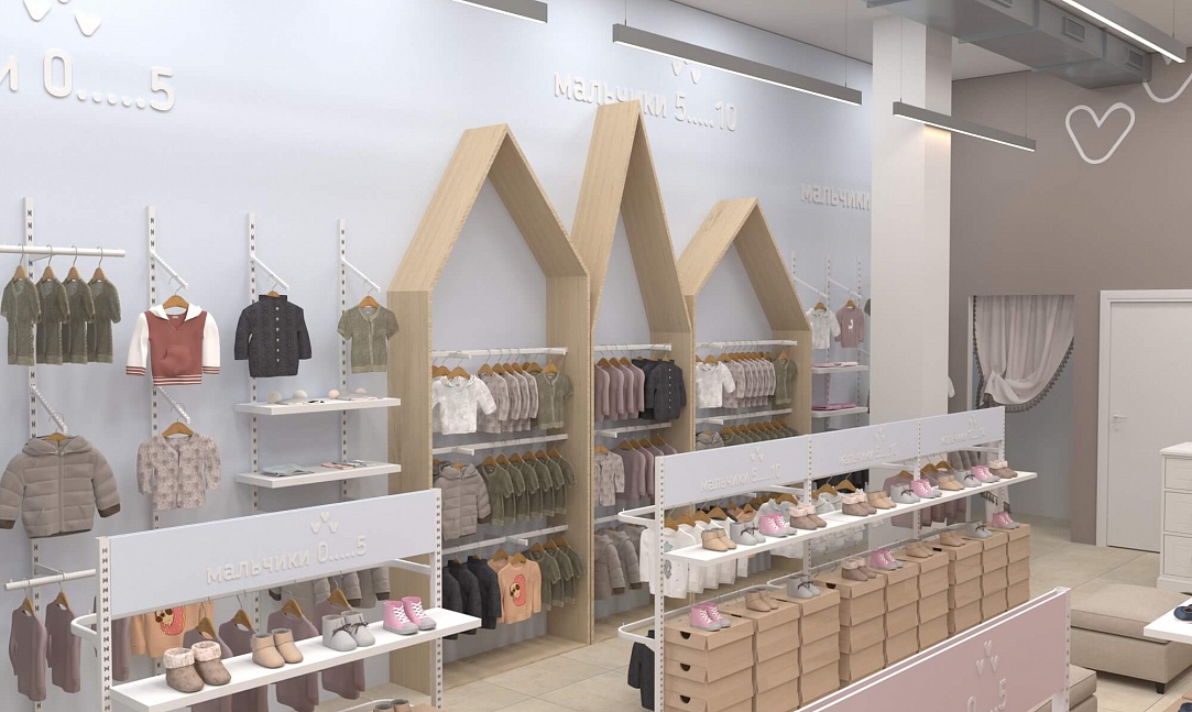 У практичной одежды должен быть соответствующий дизайн, достойный этому бренду детской одежды. Для его воплощения мы предусмотрели зоны для примерки как верхней одежды, так и обуви, а также добавили в проект собственное торговое оборудование. В дополнение ко всему были выбраны достаточно мягкие пастельные тона для покраски стен и фурнитуры, чтобы создать располагающую атмосферу в магазине и предоставить лучший опыт выбора и покупки одежды.