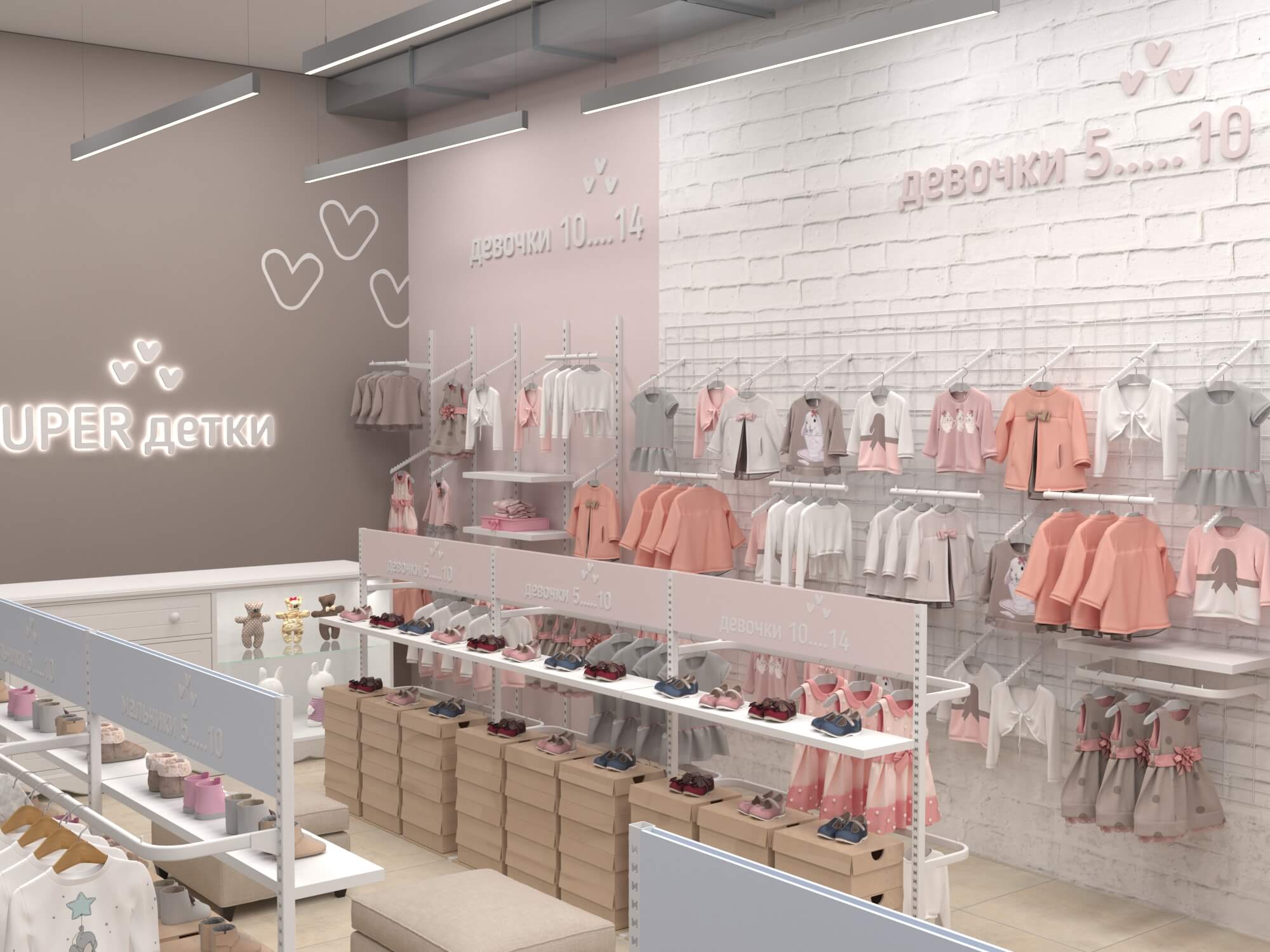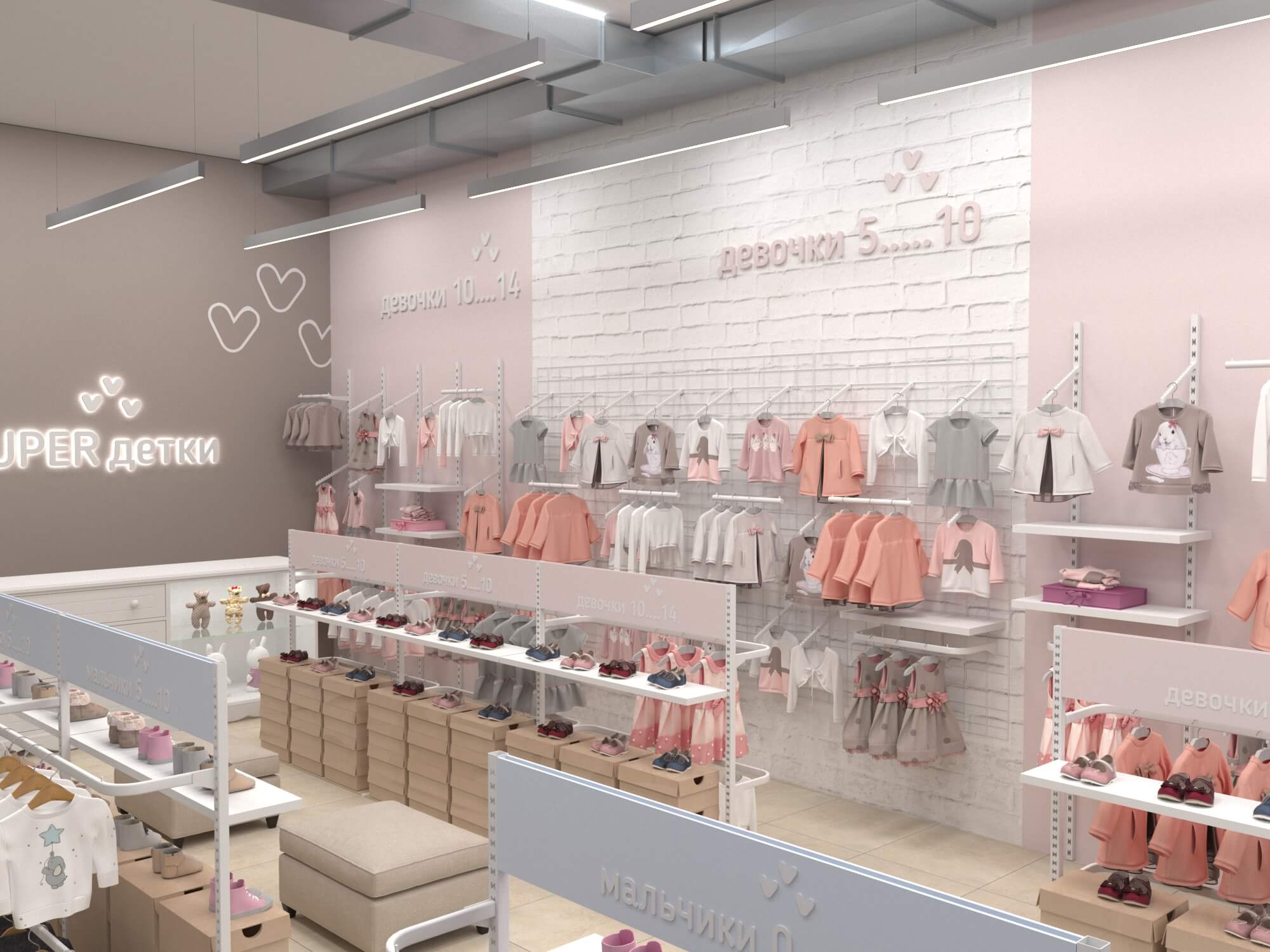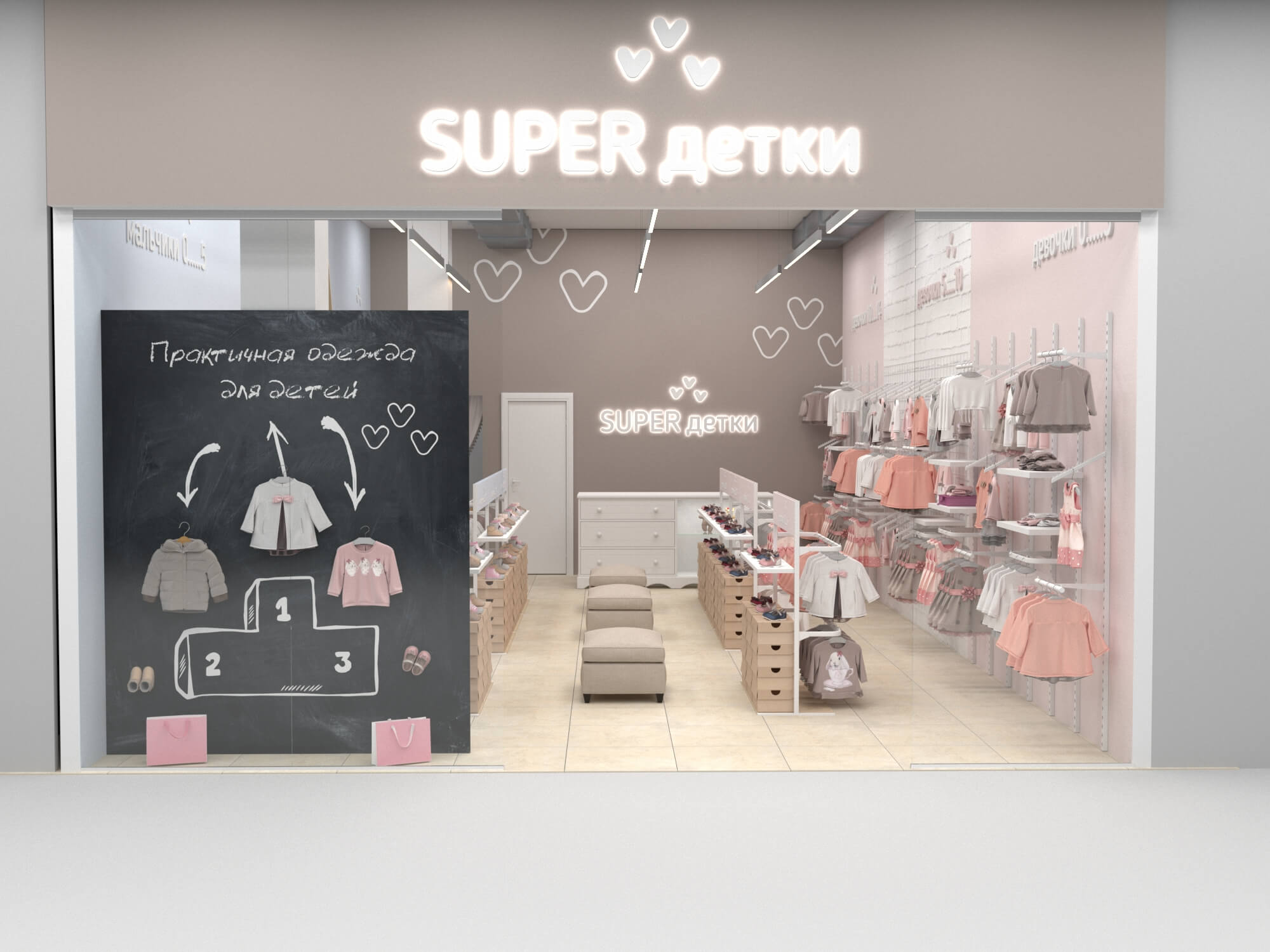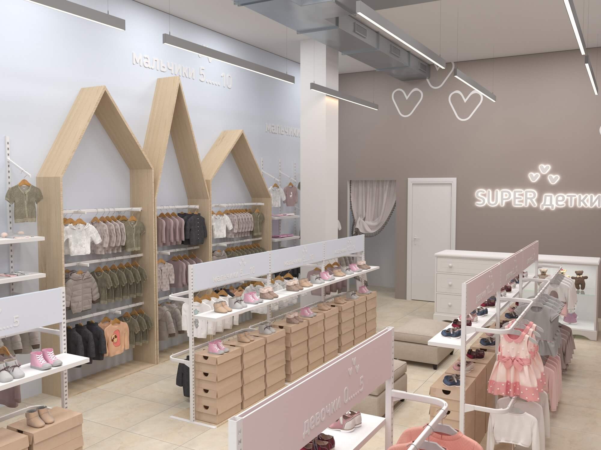 У практичной одежды должен быть соответствующий дизайн, достойный этому бренду детской одежды. Для его воплощения мы предусмотрели зоны для примерки как верхней одежды, так и обуви, а также добавили в проект собственное торговое оборудование. В дополнение ко всему были выбраны достаточно мягкие пастельные тона для покраски стен и фурнитуры, чтобы создать располагающую атмосферу в магазине и предоставить лучший опыт выбора и покупки одежды.