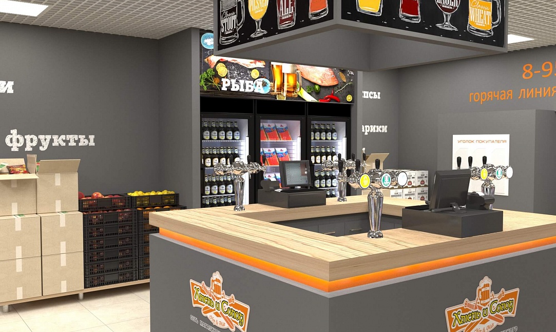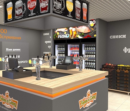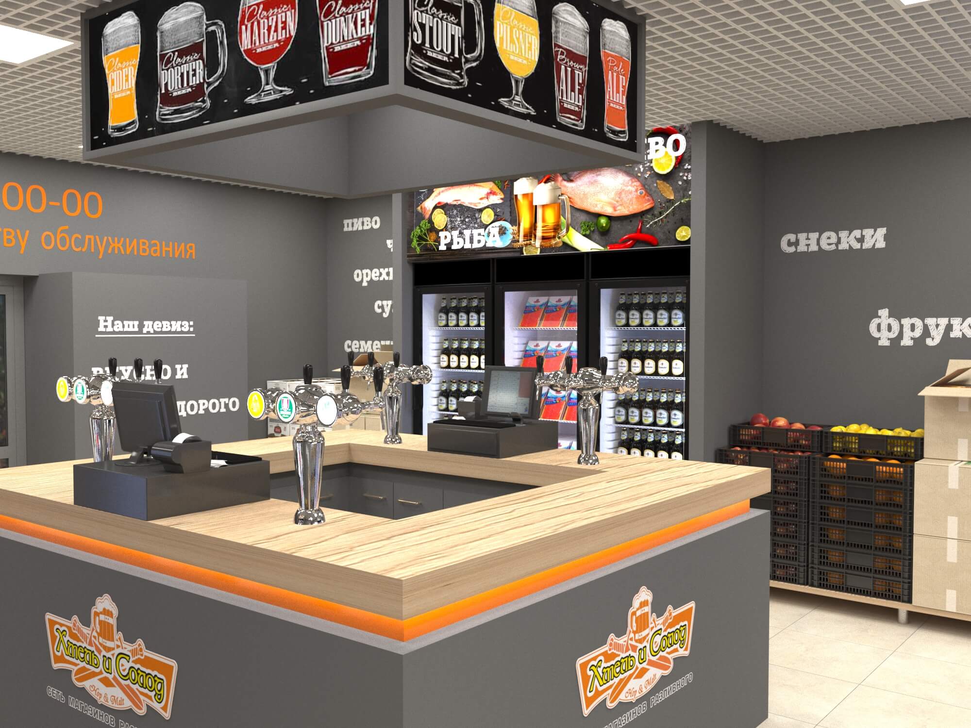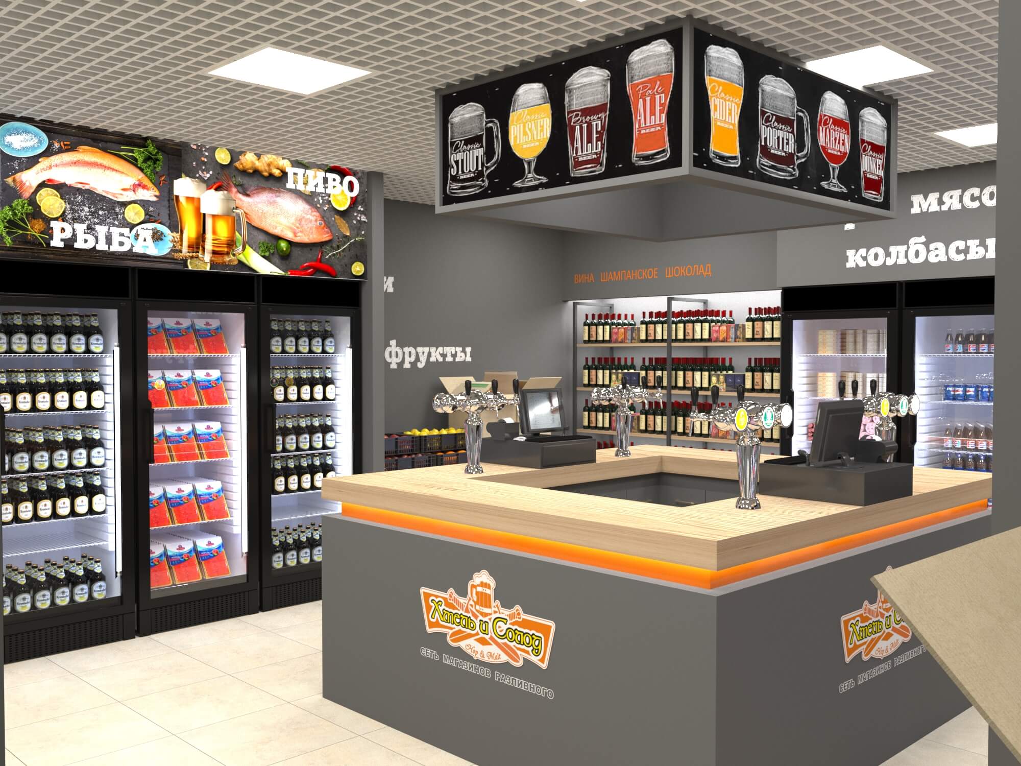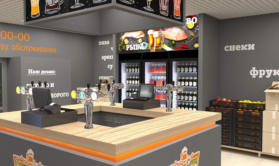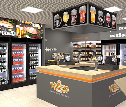 Вы любите проводить время с близкими и друзьями? Мы тоже, и поэтому хотели выразить свои чувства в представленном дизайн проекте, в котором есть всё необходимое торговое оборудование: стеллажи и холодильные камеры для алкогольной и пищевой продукции, барная стойка - касса, где можно приобрести немного разливного и оплатить приобретенные товары. А также в виде маленького штриха мы добавили небольшую подсветку, чтобы сделать выделяющимся будущий интерьер магазина разливного.