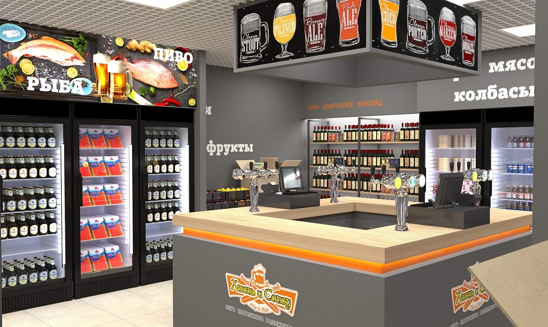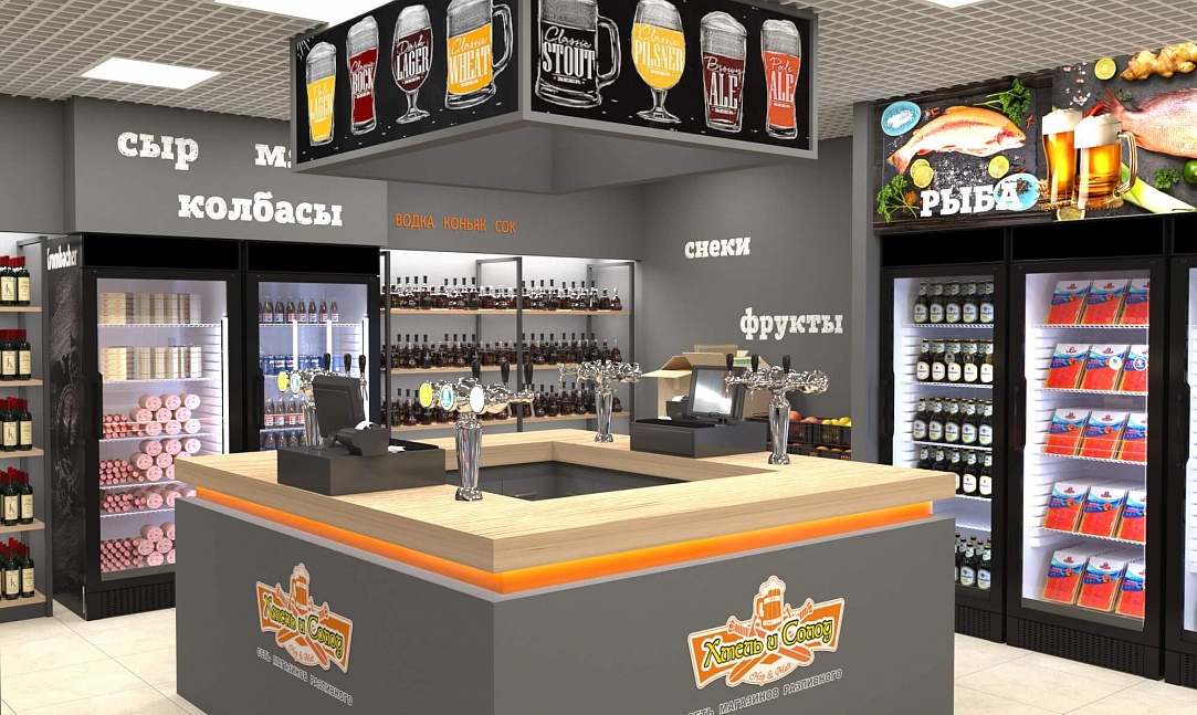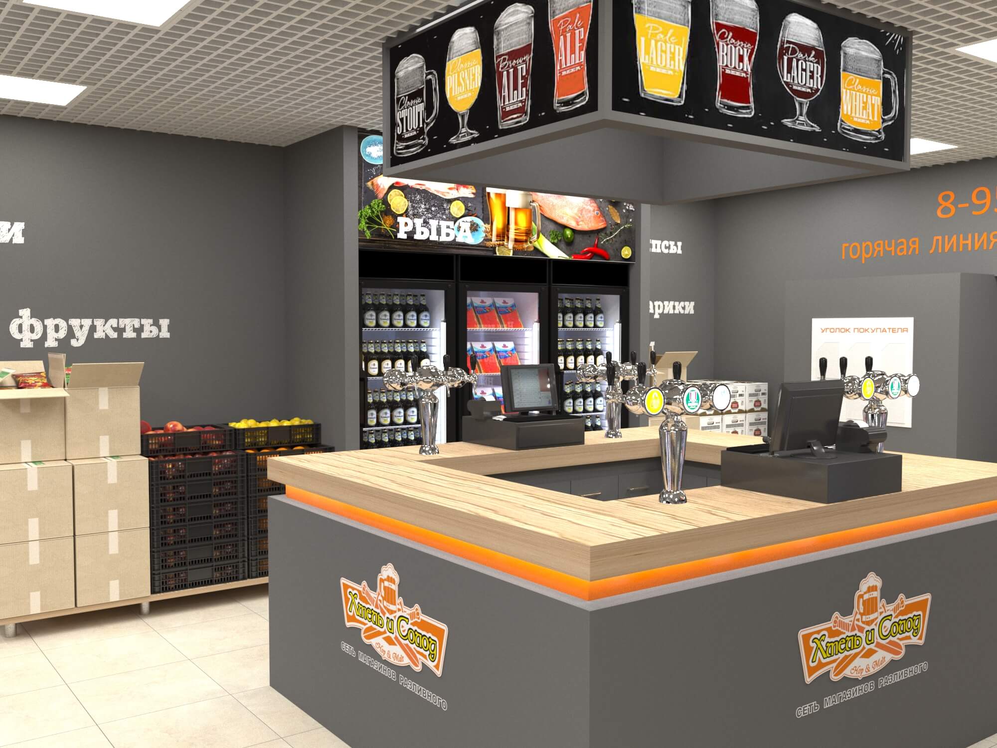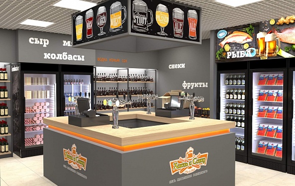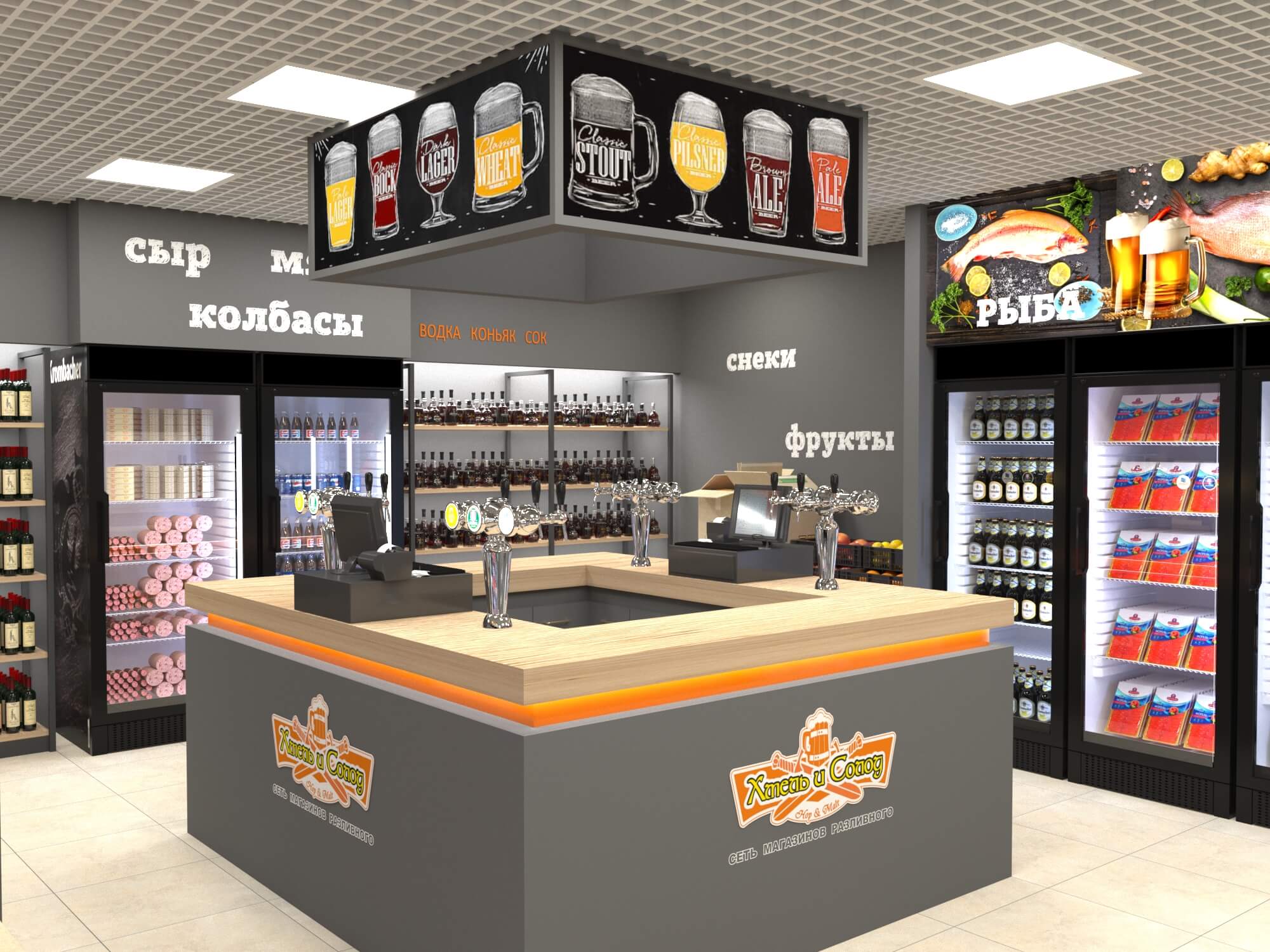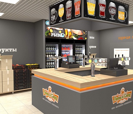 Вы любите проводить время с близкими и друзьями? Мы тоже, и поэтому хотели выразить свои чувства в представленном дизайн проекте, в котором есть всё необходимое торговое оборудование: стеллажи и холодильные камеры для алкогольной и пищевой продукции, барная стойка - касса, где можно приобрести немного разливного и оплатить приобретенные товары. А также в виде маленького штриха мы добавили небольшую подсветку, чтобы сделать выделяющимся будущий интерьер магазина разливного.