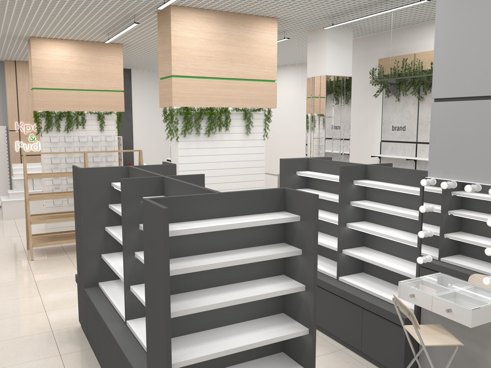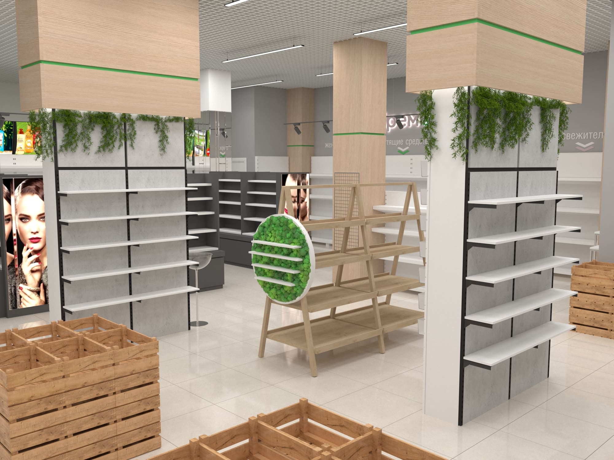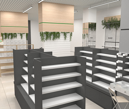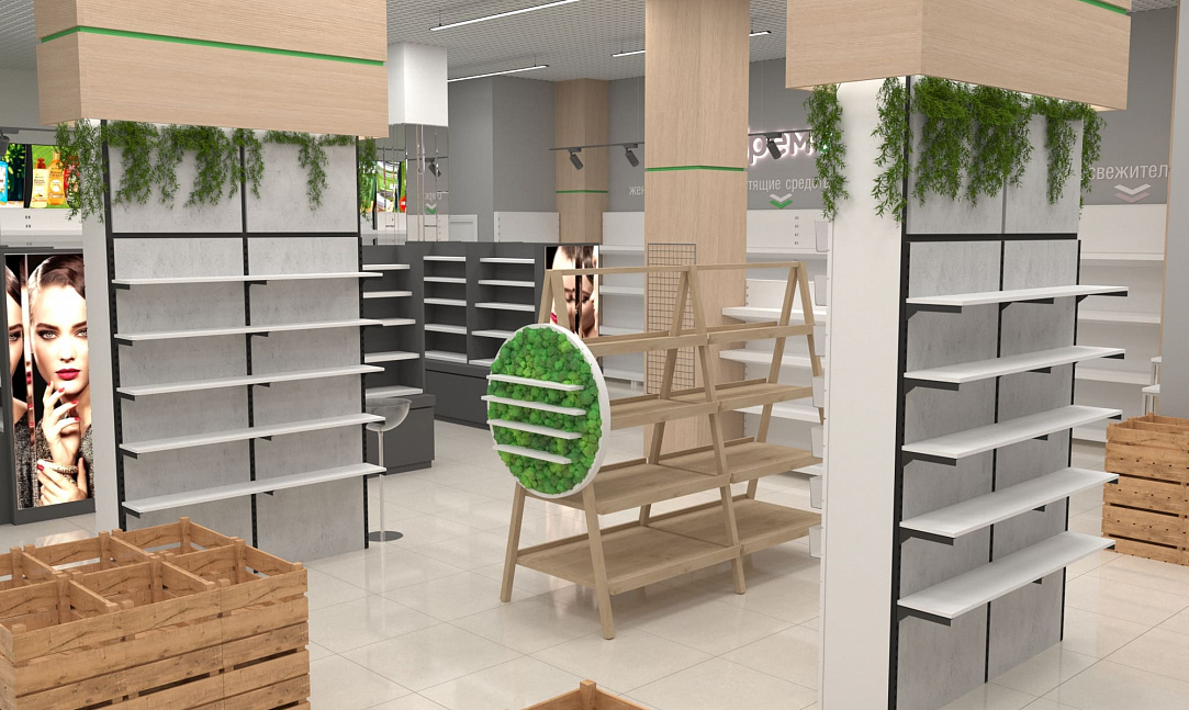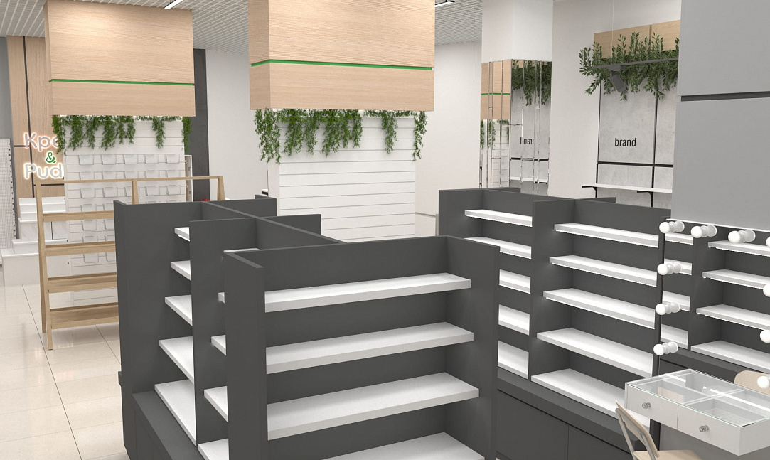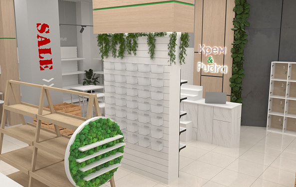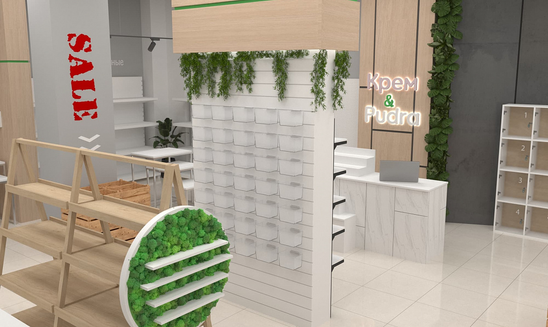 Помимо функциональных стоек с экономпанелями, покрытых живой растительностью, использовались стеллажи с гримёрными зеркалами собственного производства. Мы расположили маршрутизаторы в центрах каждой из групп товаров, чтобы посетители могли воспользоваться локальным Wi-Fi и узнать больше о приобретаемой продукции. А также яркие световые панели с чётким отображением соответствующей зоны товаров