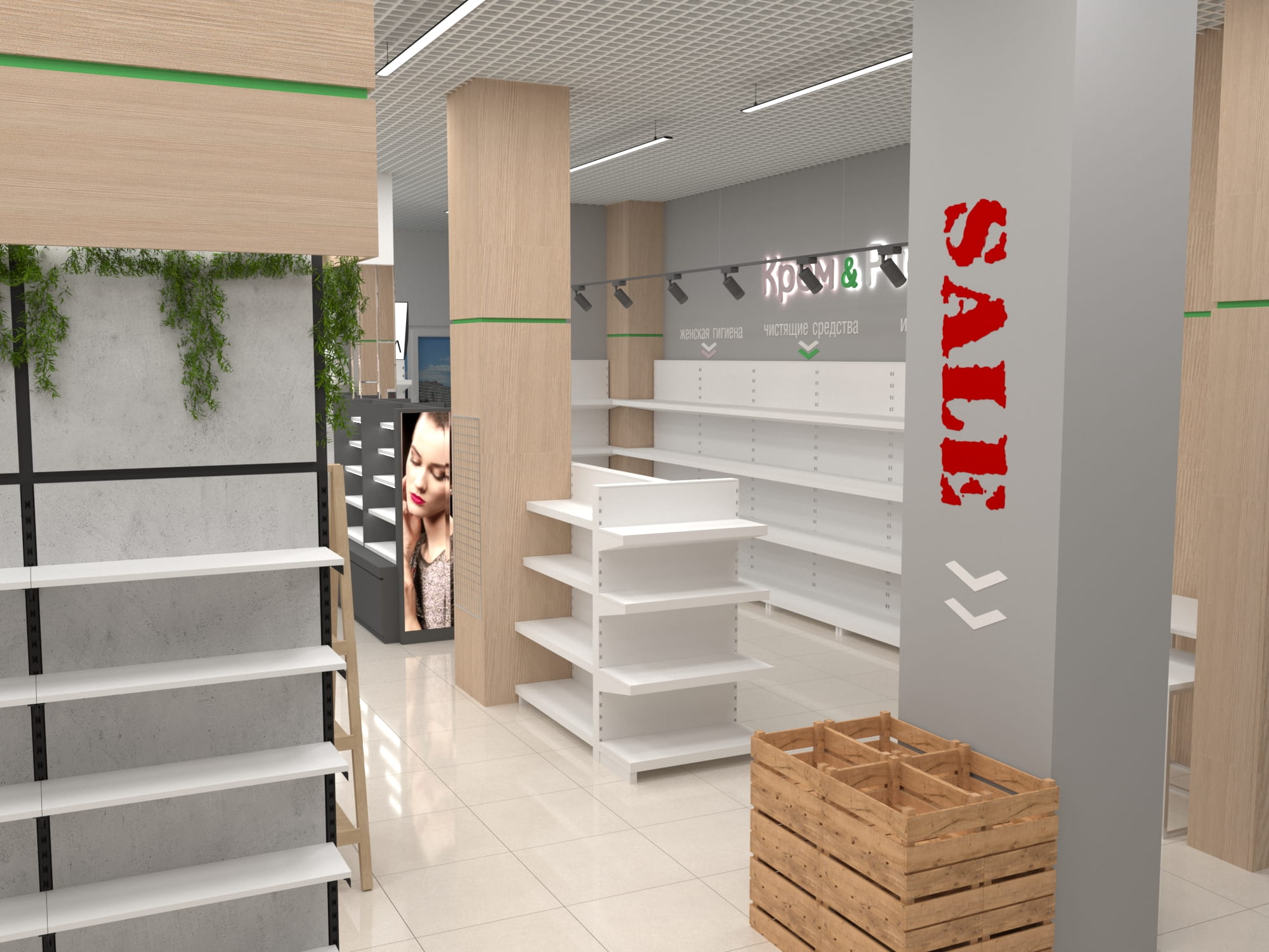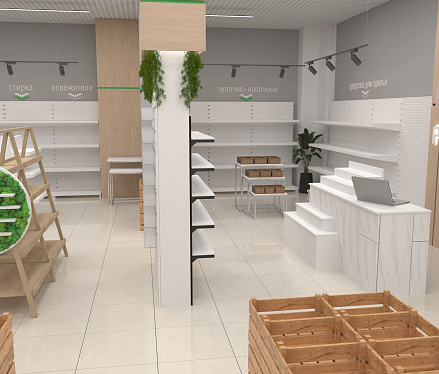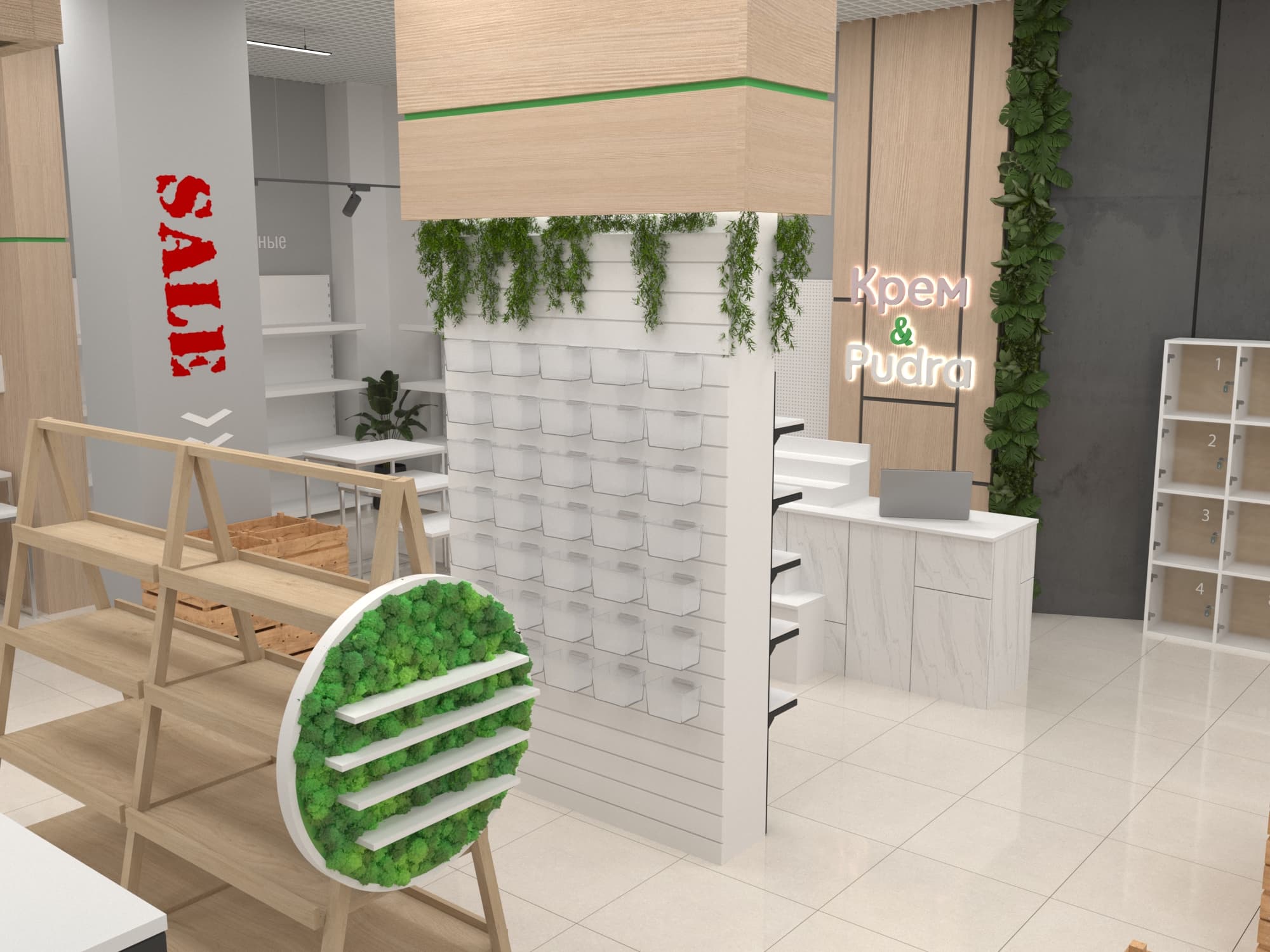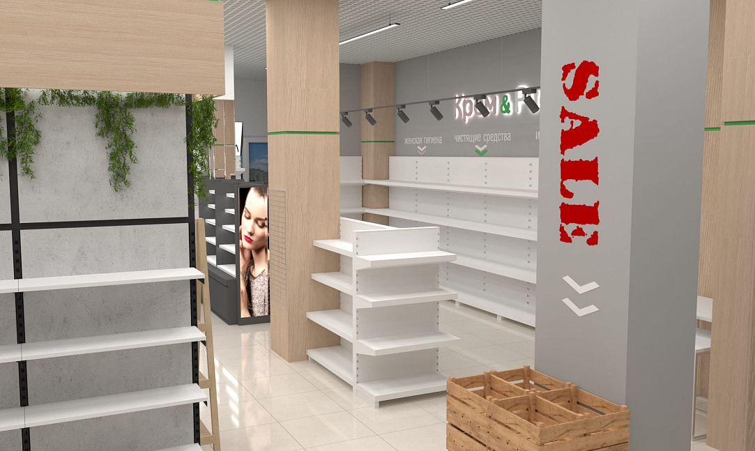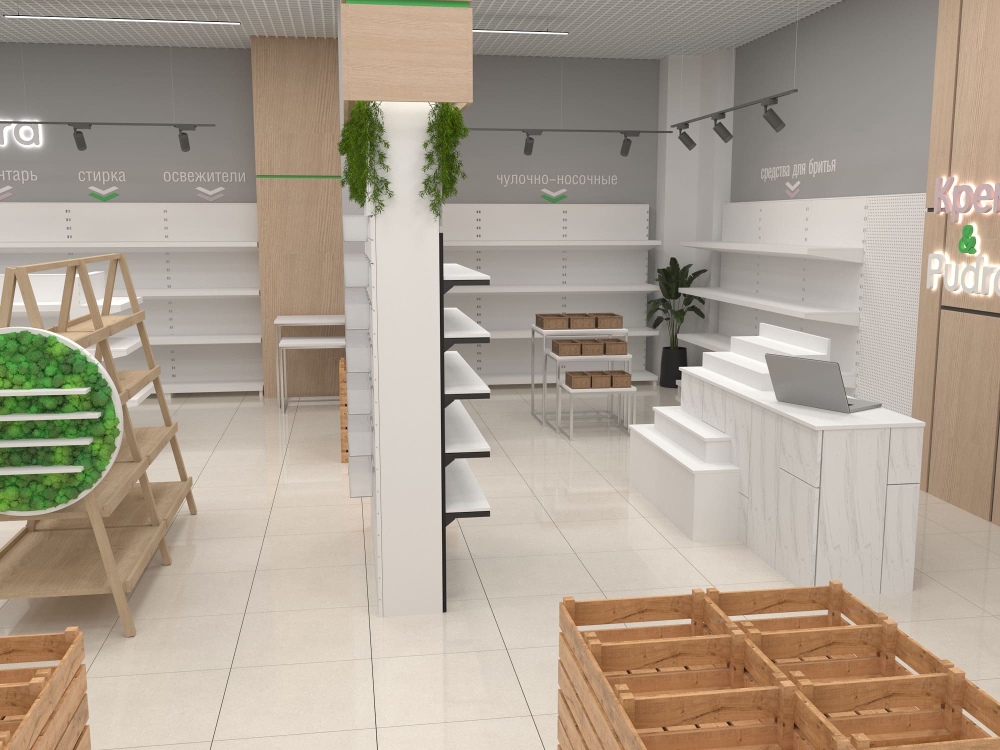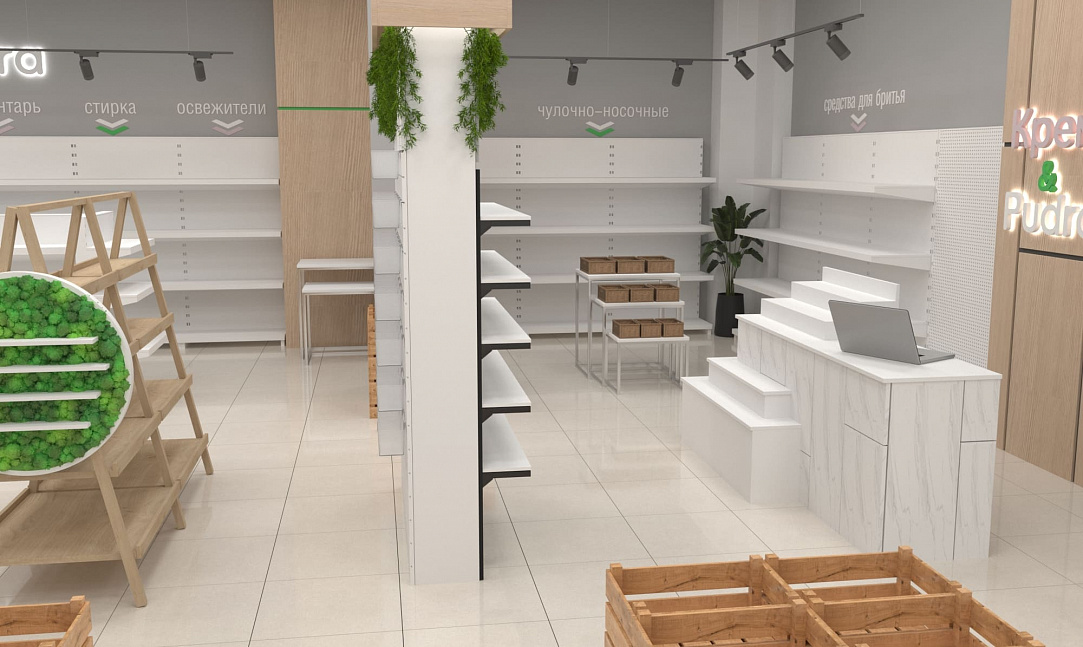 Помимо функциональных стоек с экономпанелями, покрытых живой растительностью, использовались стеллажи с гримёрными зеркалами собственного производства. Мы расположили маршрутизаторы в центрах каждой из групп товаров, чтобы посетители могли воспользоваться локальным Wi-Fi и узнать больше о приобретаемой продукции. А также яркие световые панели с чётким отображением соответствующей зоны товаров