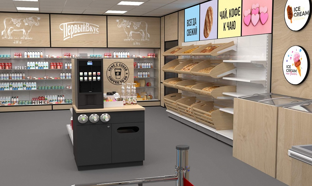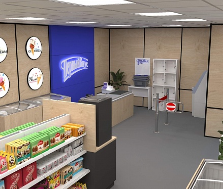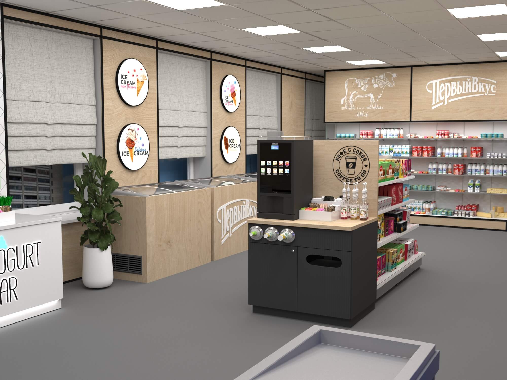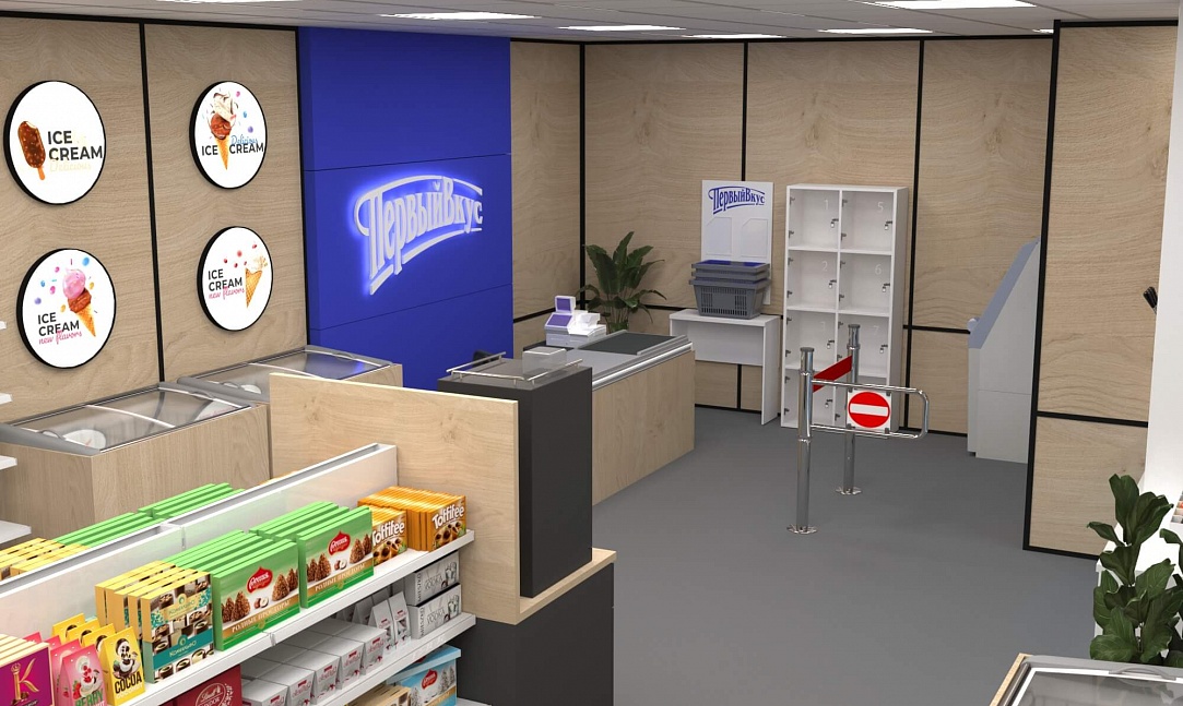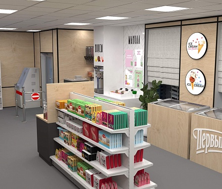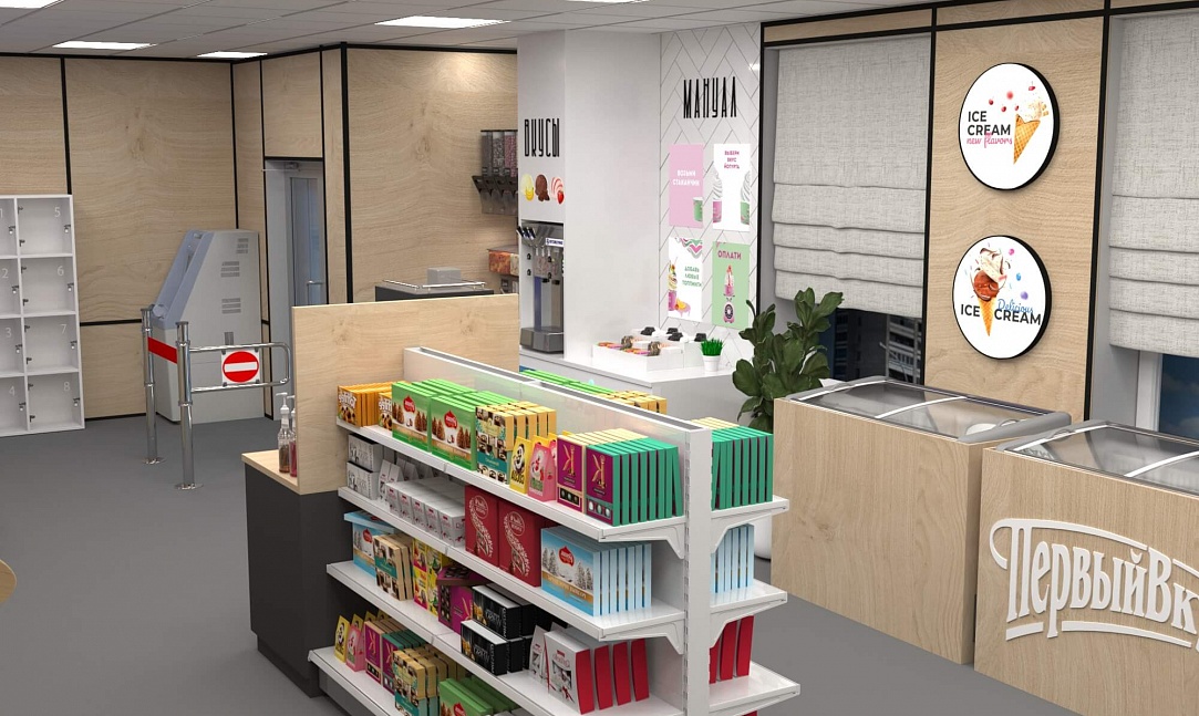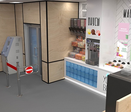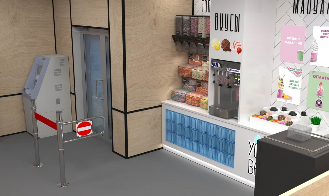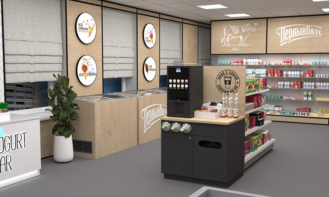 Задача - разработать ребрендинг существующего магазина, сделать кофе зону и зону по продаже замороженного йогурта.