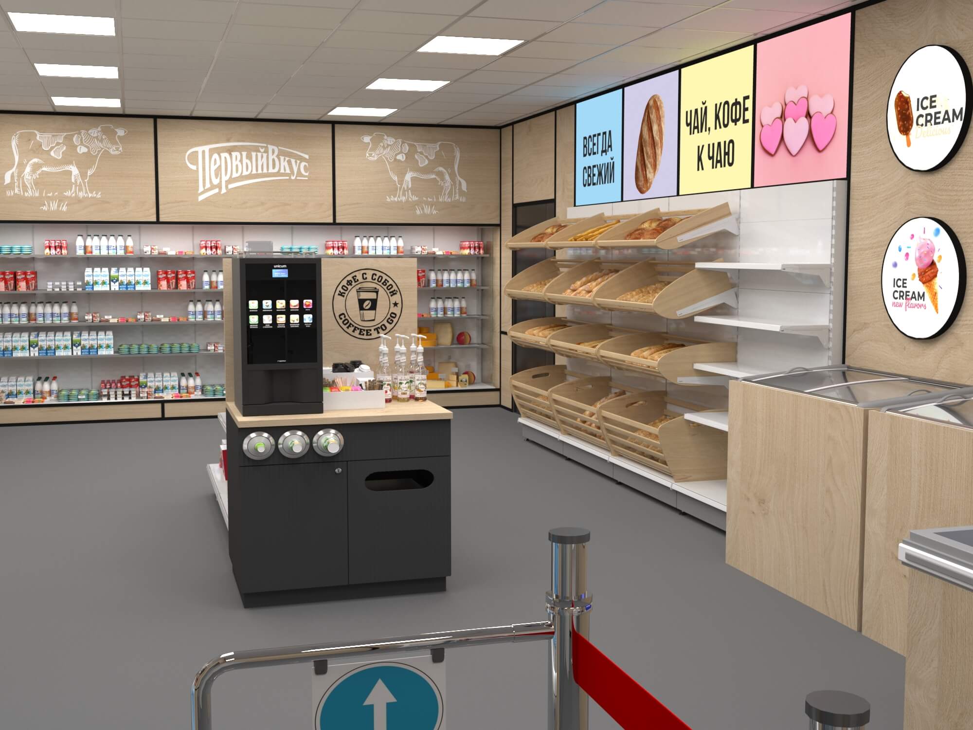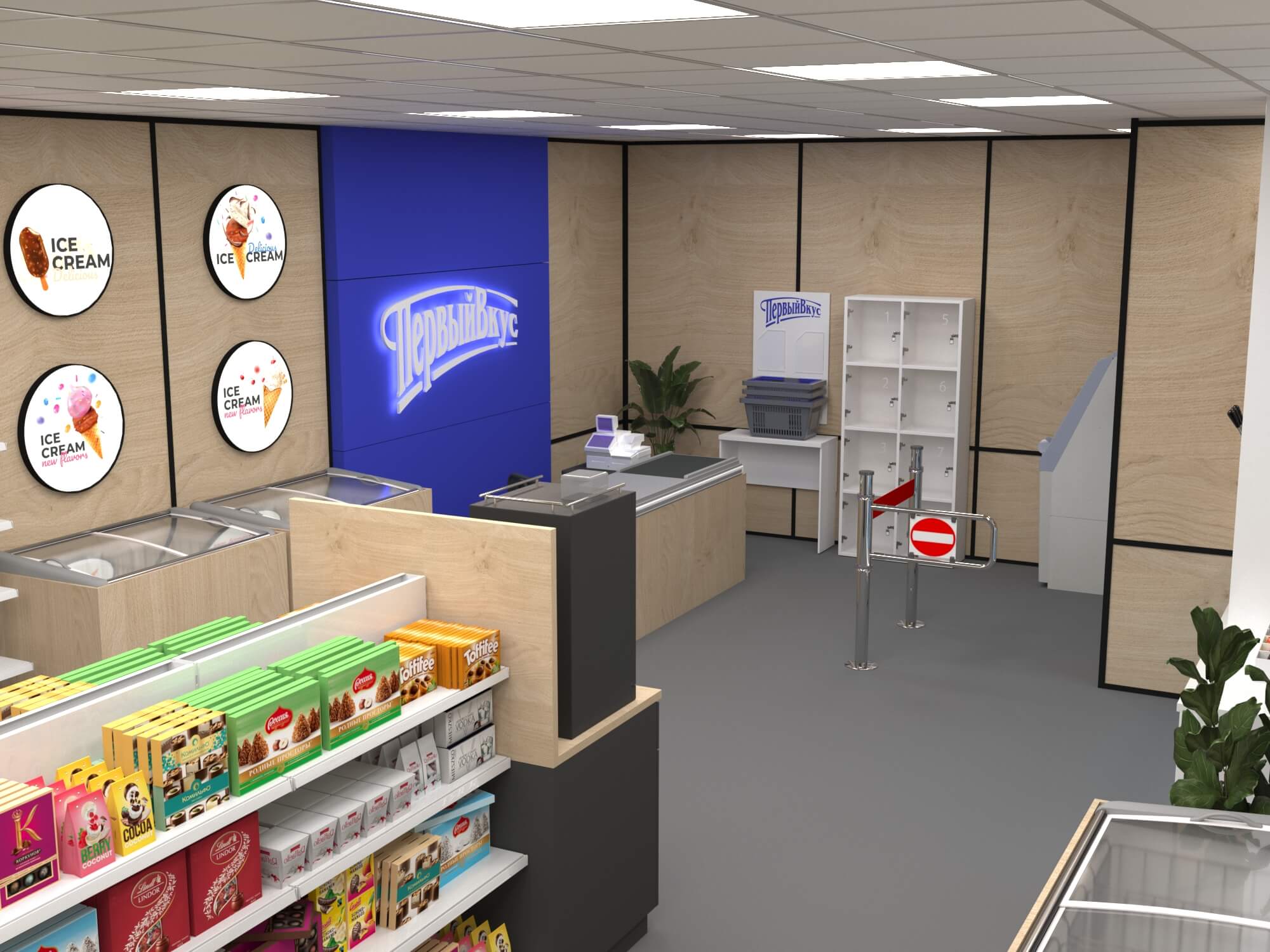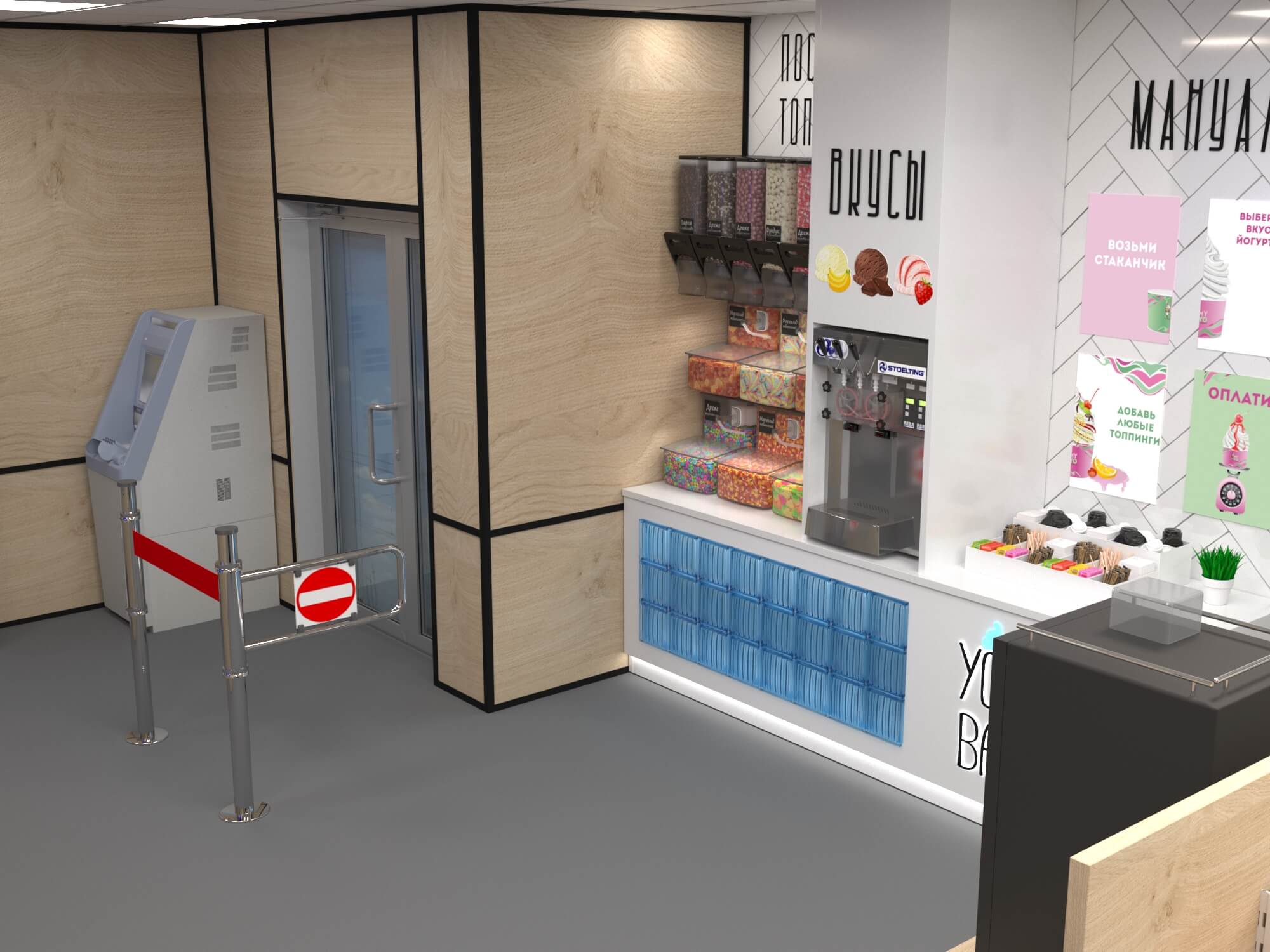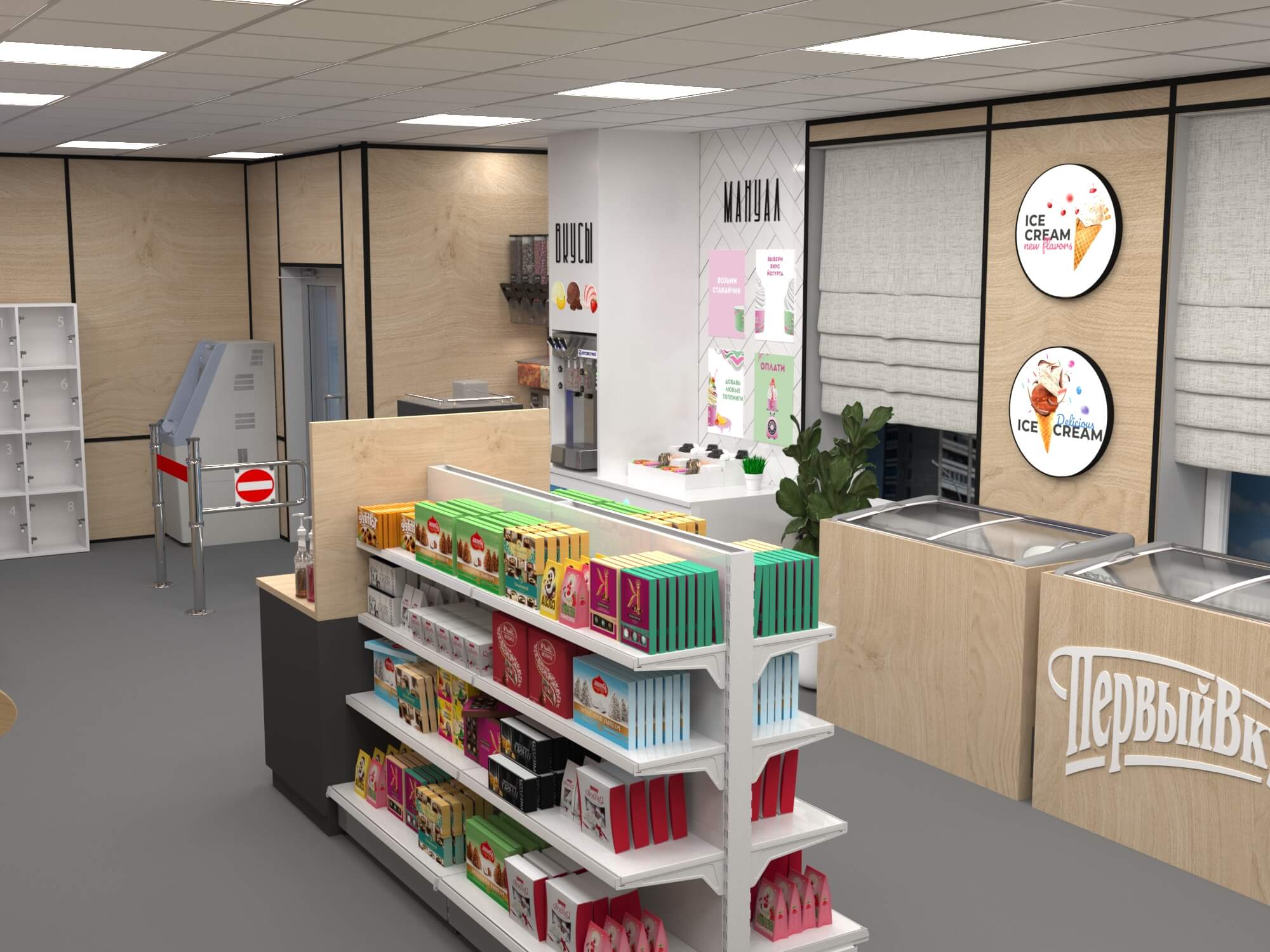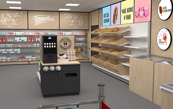 Задача - разработать ребрендинг существующего магазина, сделать кофе зону и зону по продаже замороженного йогурта.