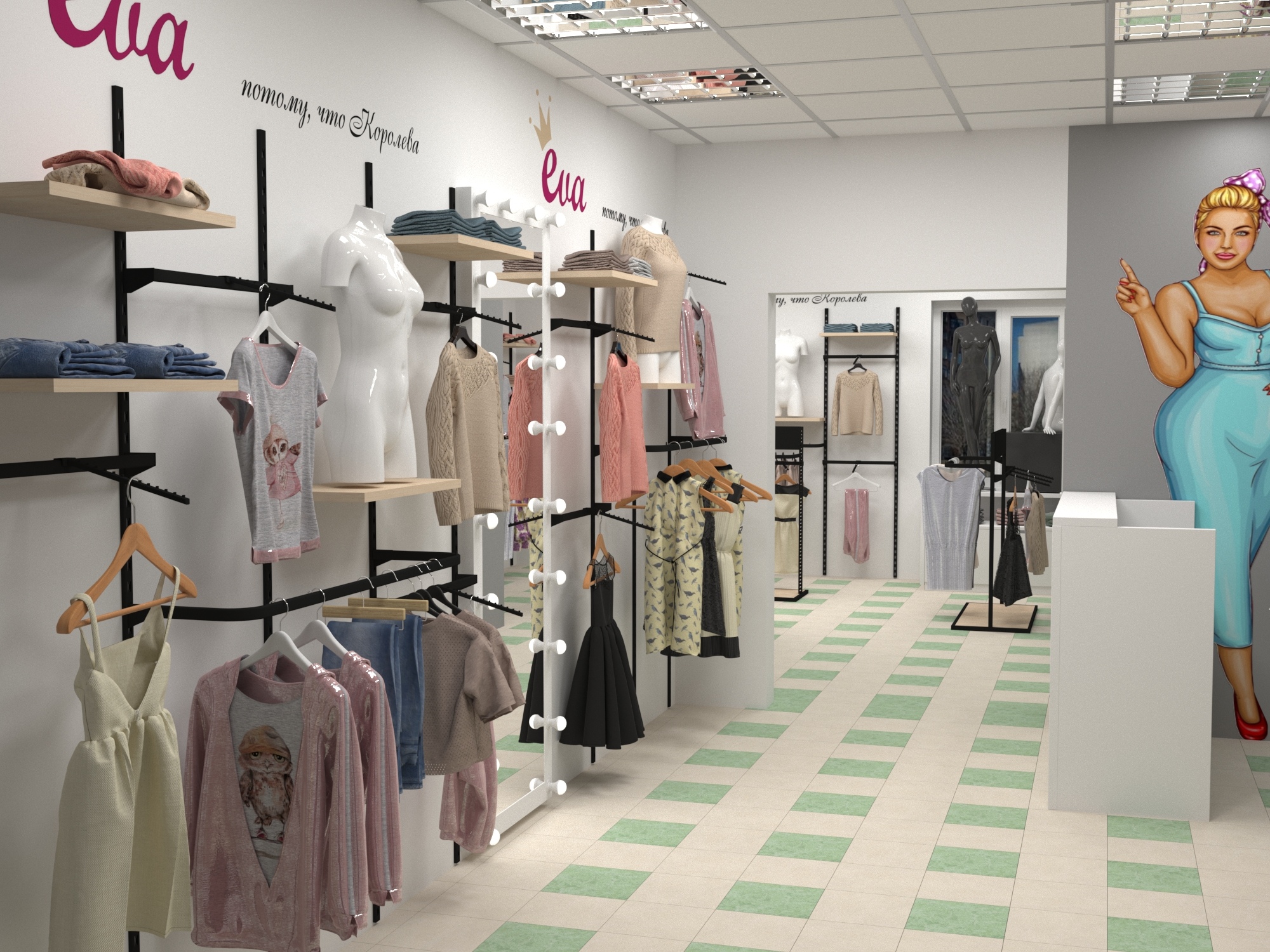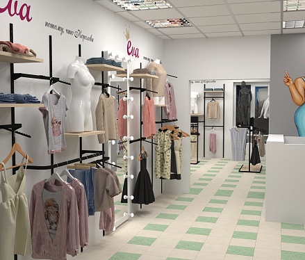 Представленный дизайн проект магазина женской одежды демонстрирует то, что грамотно спроектированное помещение способно преобразить любое место. На небольшой площади наши специалисты сумели разместить всё необходимое торговое оборудование: устойчивые к длительной эксплуатации стеллажи и полки, вместительные примерочные, манекены и т.д.. Таким образом, вместо неудобного и тесного места заказчик получил желаемое видение своего будущего бизнеса.