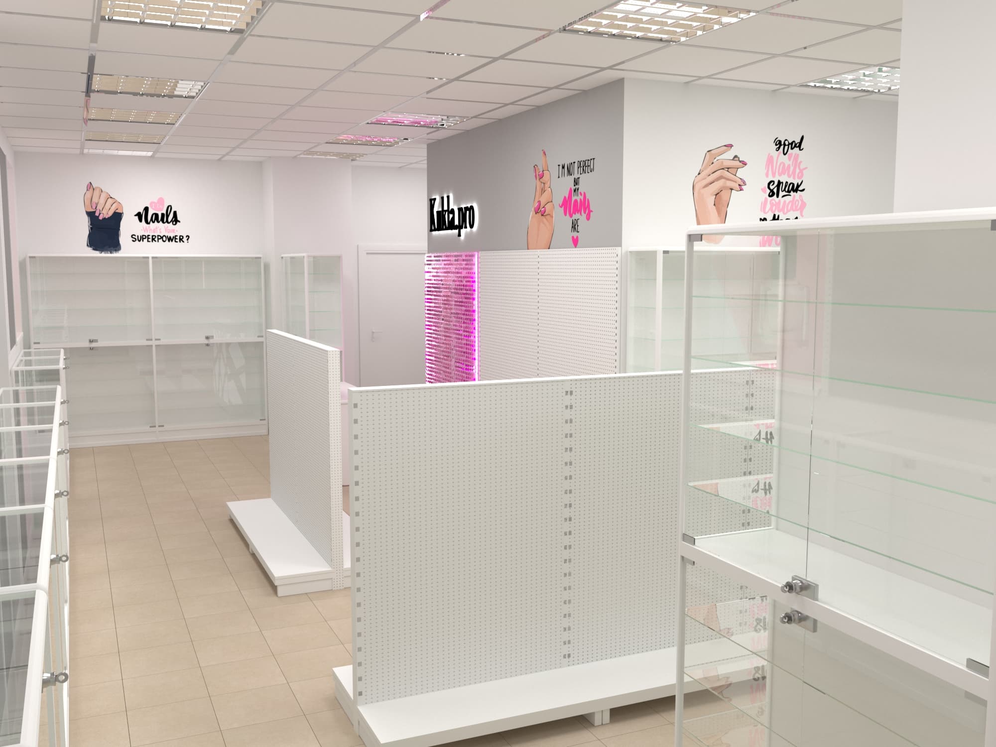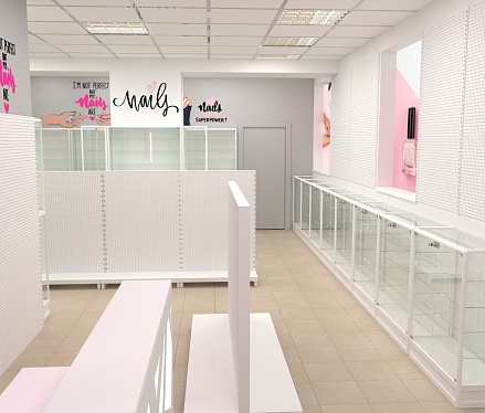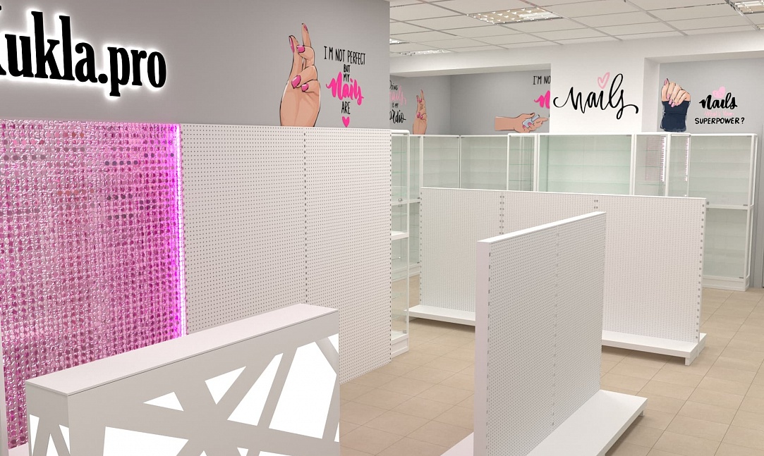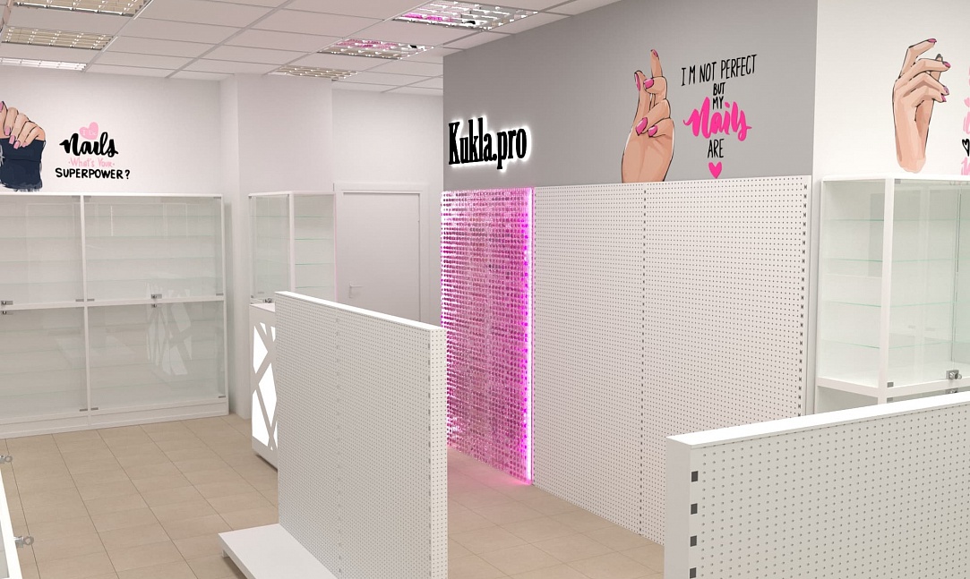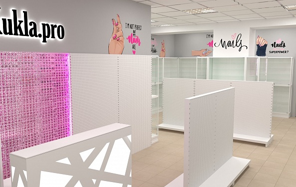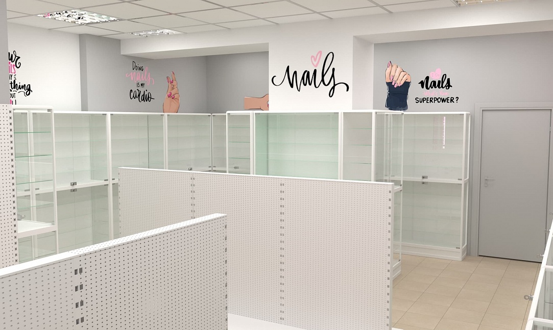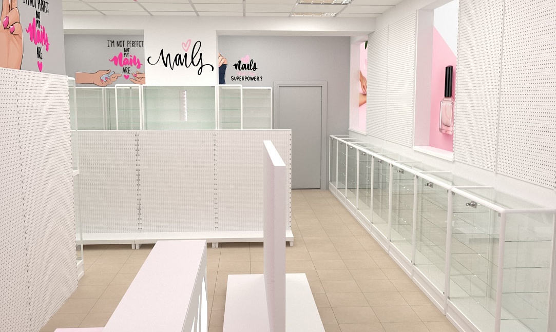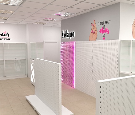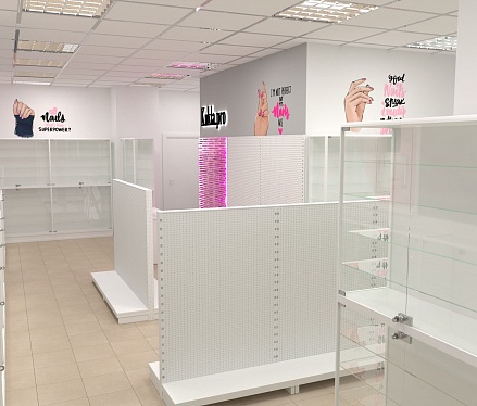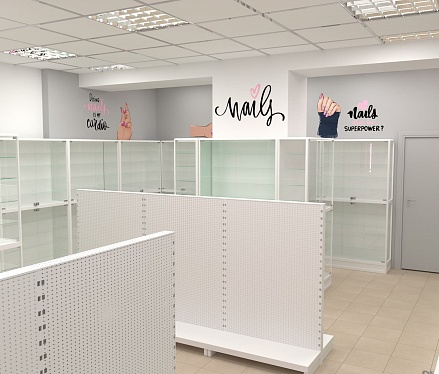 Нашей командой был разработан дизайн-проект специализированного магазина товаров для создания маникюра и работы с ногтями. Чтобы предоставить максимальный выбор потребителю и визуально облегчить помещения использовались белые эконом стенды с перфорированной панелью под крючки и светлые витрины с остеклением. Данное торговое оборудование в совокупности с расставленными цветовыми акцентами самого бренда позволили создать современный образ для такого уникального места.