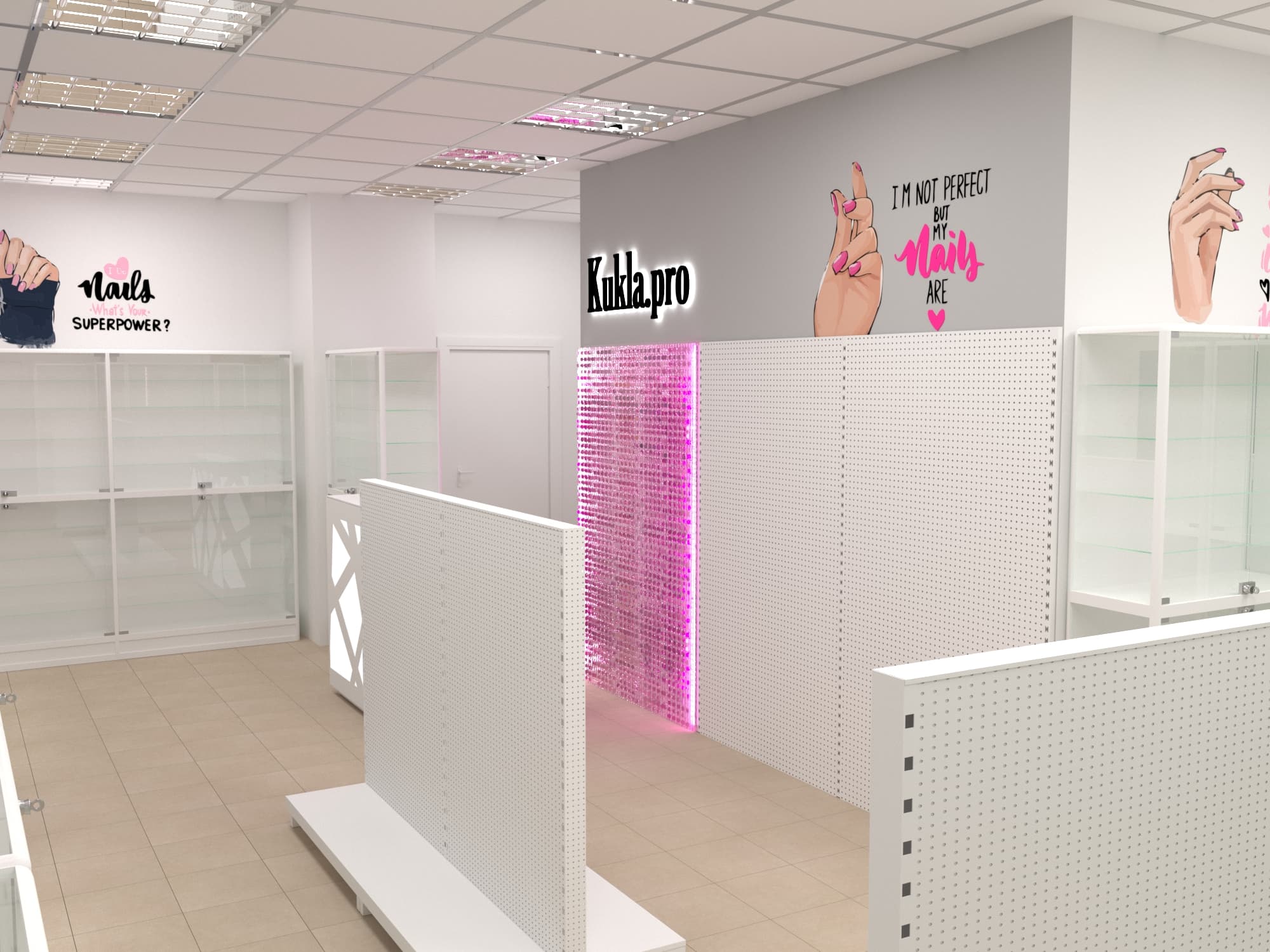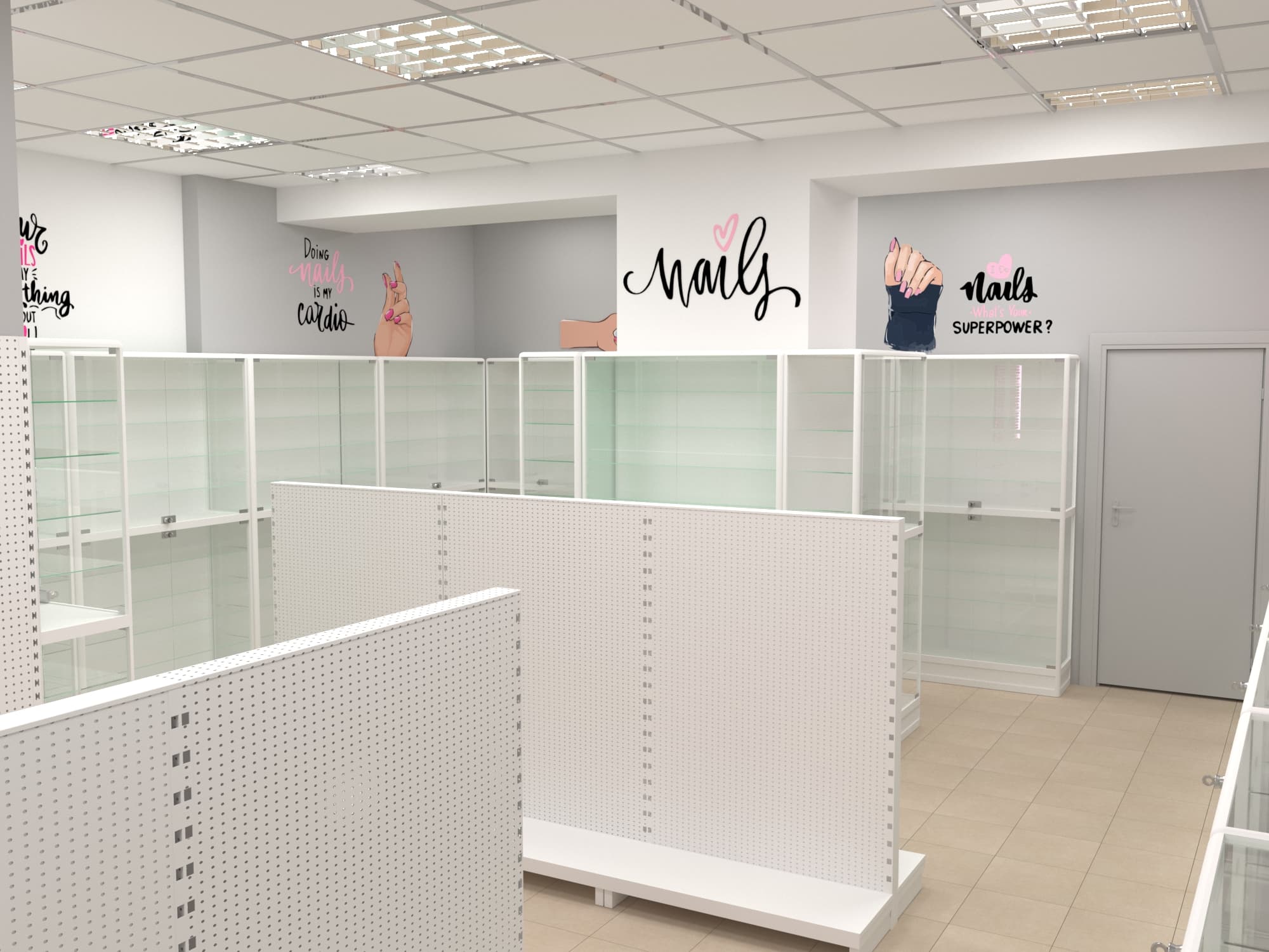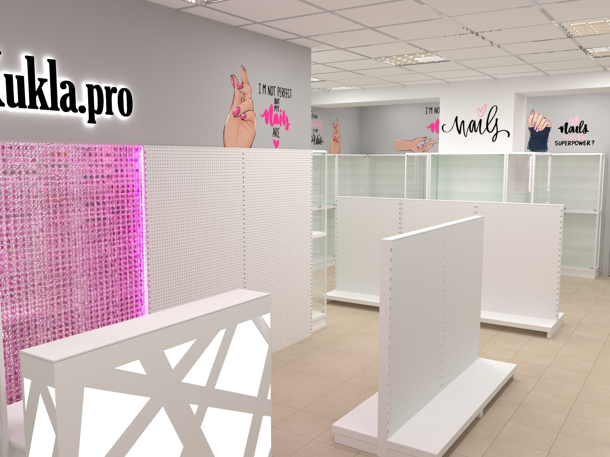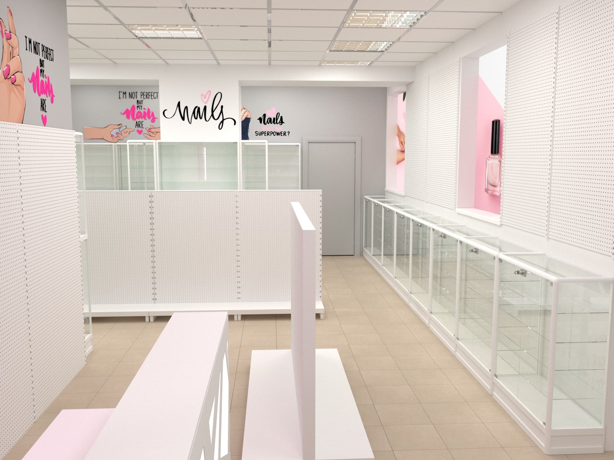 Нашей командой был разработан дизайн-проект специализированного магазина товаров для создания маникюра и работы с ногтями. Чтобы предоставить максимальный выбор потребителю и визуально облегчить помещения использовались белые эконом стенды с перфорированной панелью под крючки и светлые витрины с остеклением. Данное торговое оборудование в совокупности с расставленными цветовыми акцентами самого бренда позволили создать современный образ для такого уникального места.