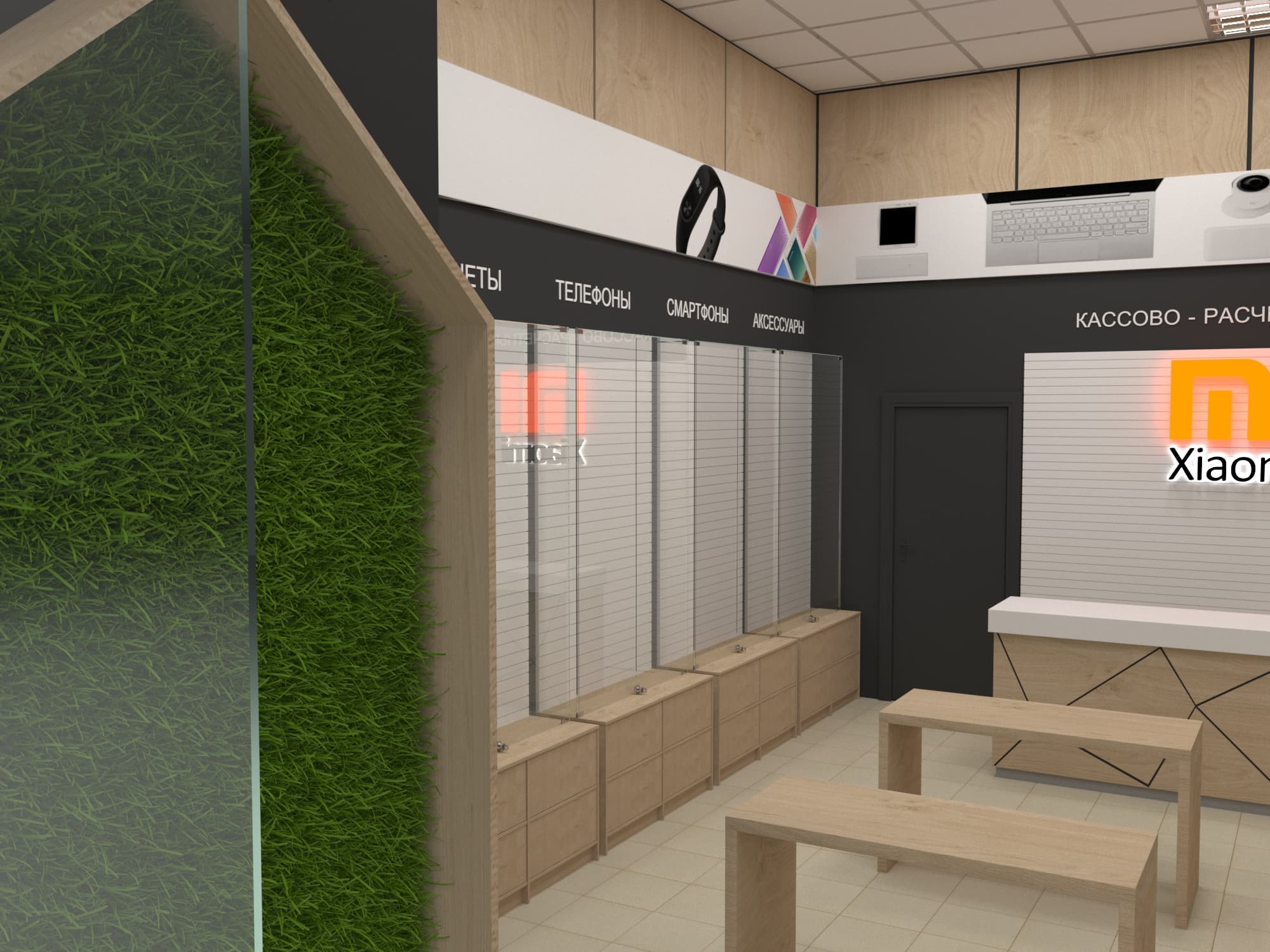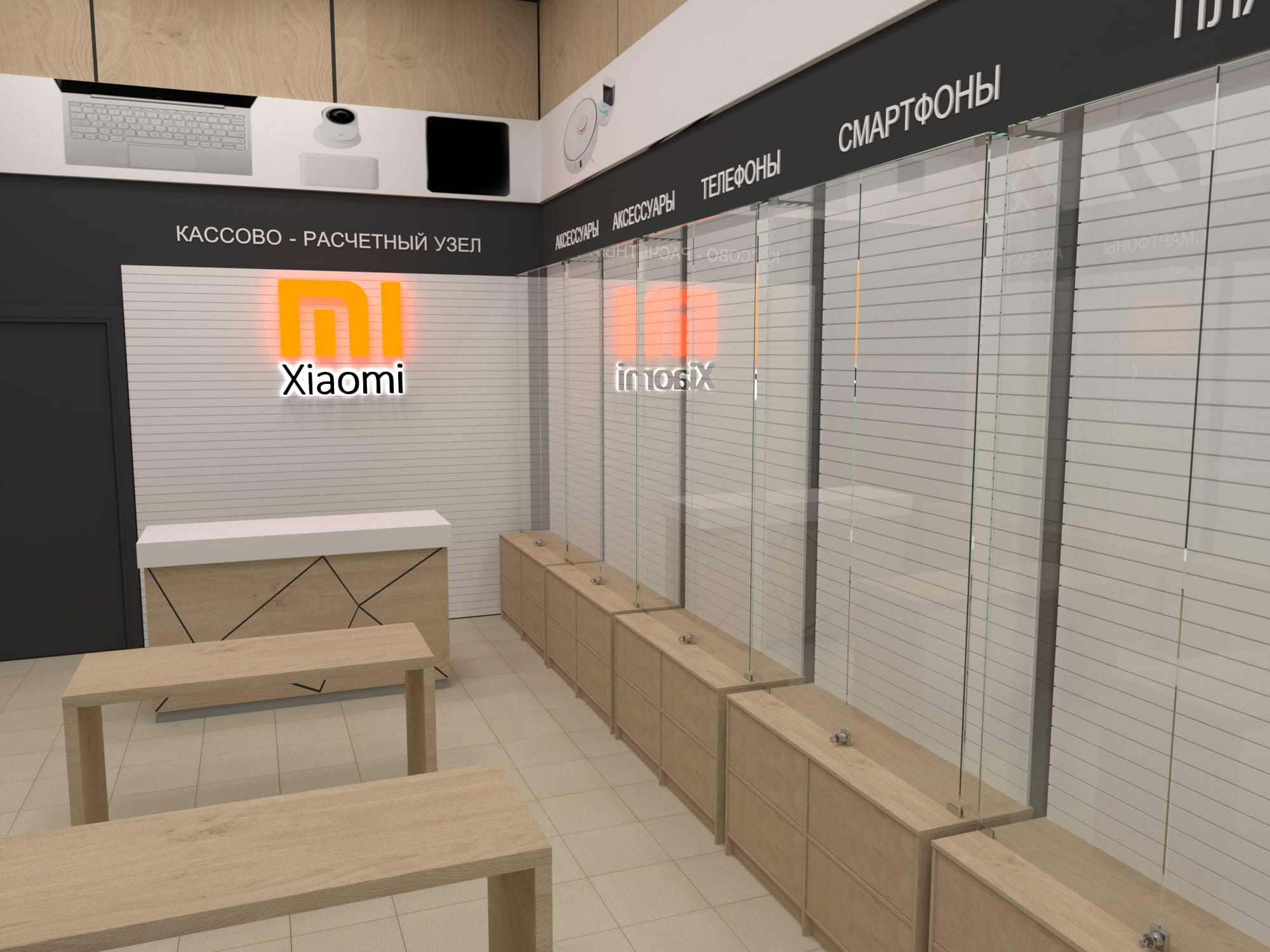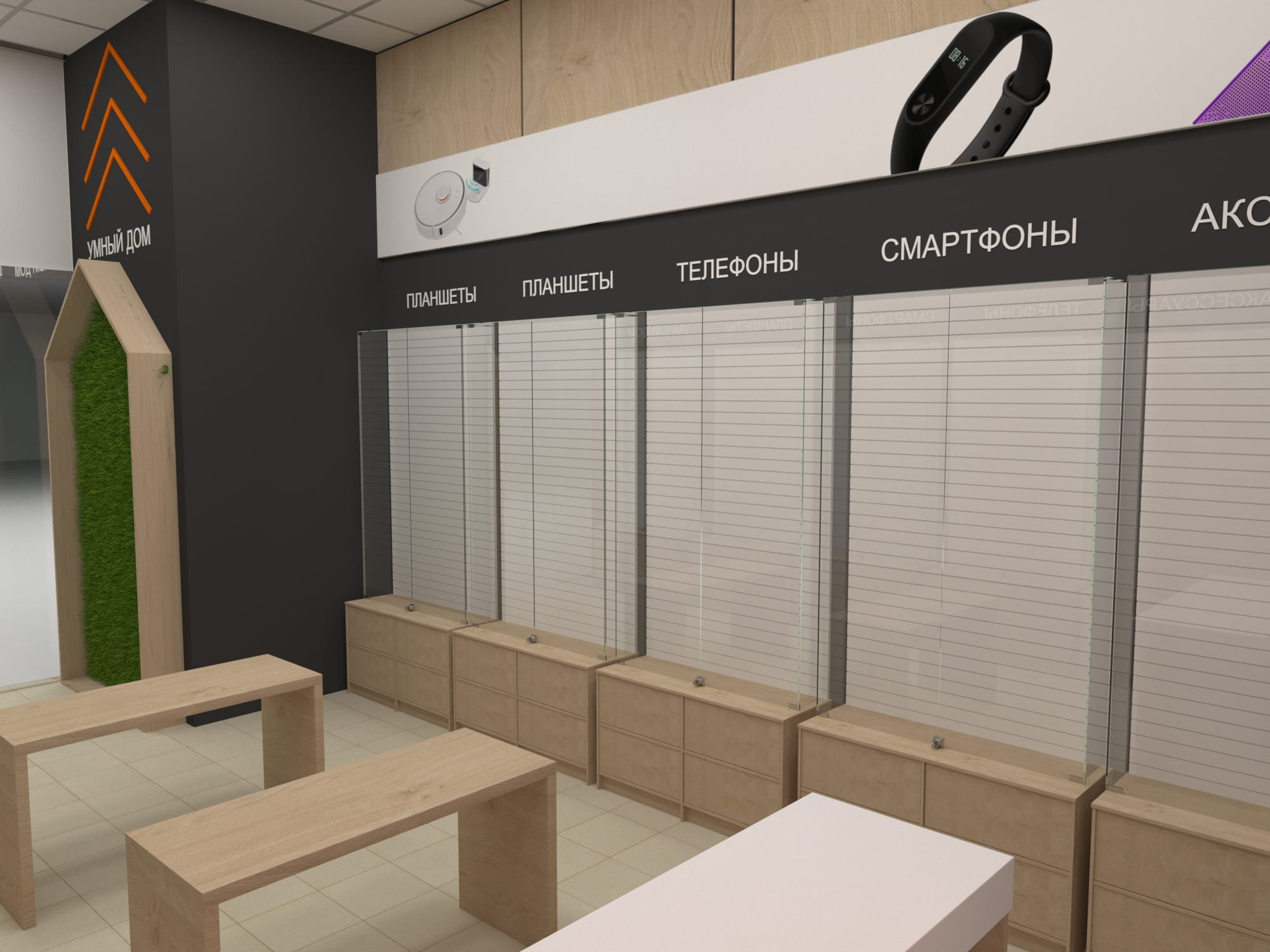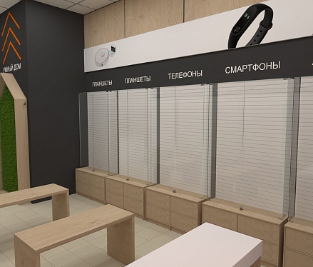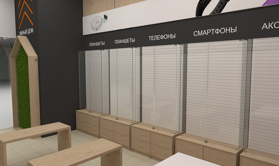 Новый интерьер предусматривает возможность бесконтактного взаимодействия с гаджетами на специализированных стойках, а также размещение основной продукции, сгруппированной по классам устройств.