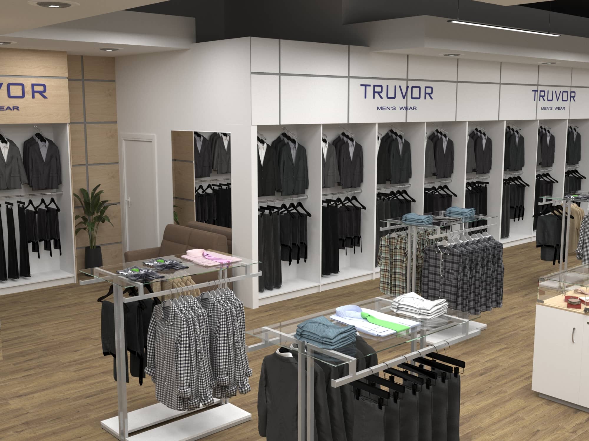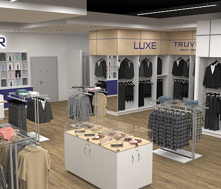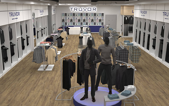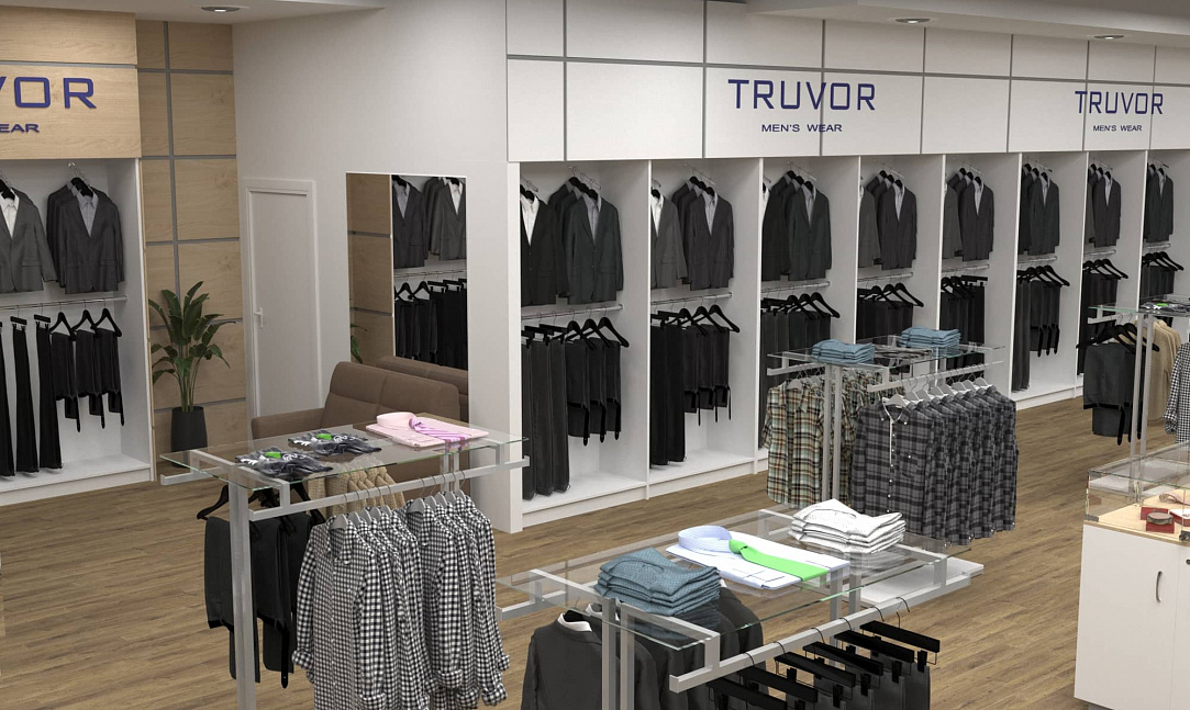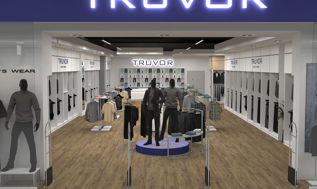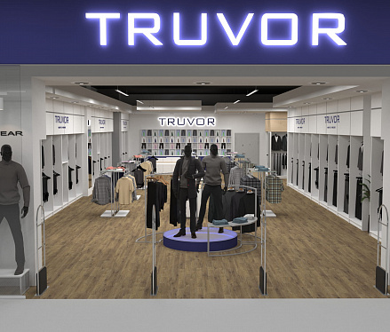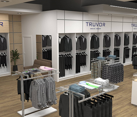 Дизайн магазина мужской одежды "Truvor"("Трувор") сочетает в себе элементы выдержанной лаконичности и функциональности. Мы помним о ценности времени для каждого клиента, поэтому расположили всю одежду так, чтобы она логично располагалась на своих местах. Для этого использовались сборные конструкции-стойки для одежды, капсульные отделения под костюмы и островные витрины для аксессуаров. Фасады торгового павильона покрыты акриловым пластиком с брендовой символикой и мультипанелями ГКЛ. А в центре помещения расположился световой подиум для манекенов, используемый при демонстрации новых коллекций одежды.
