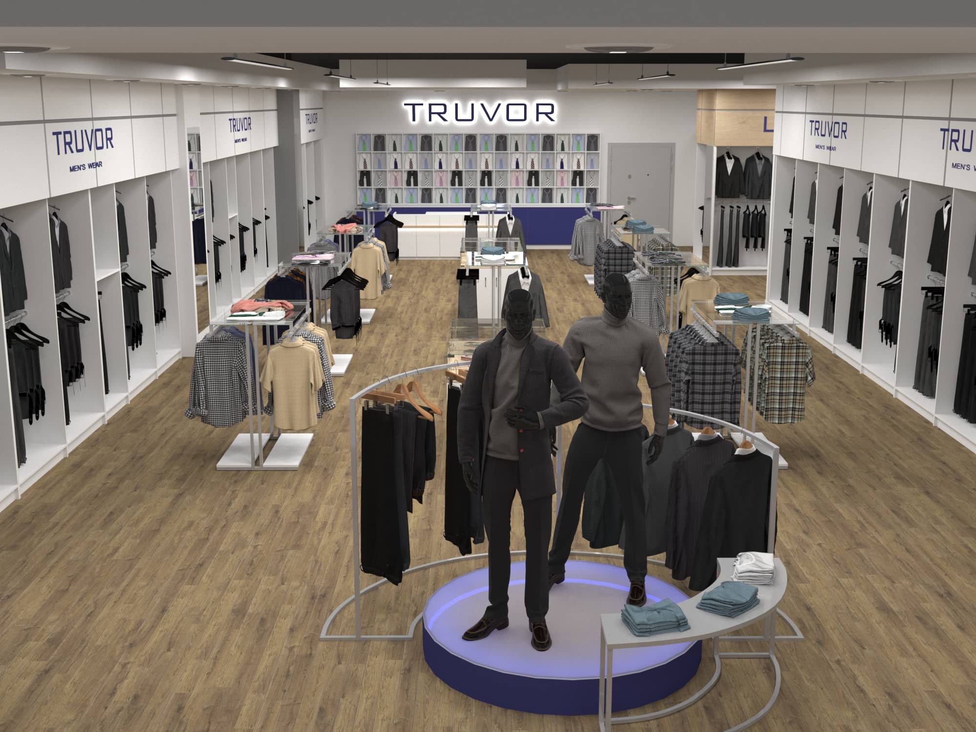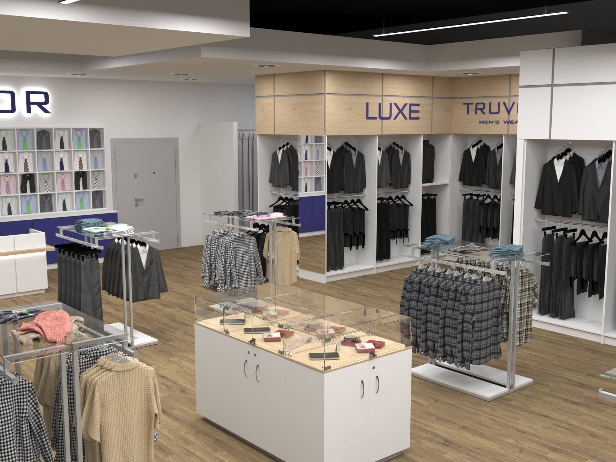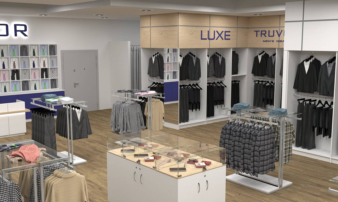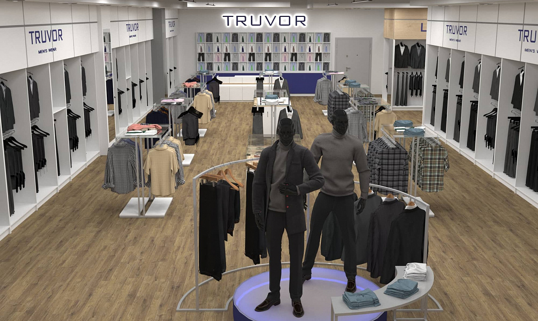 Дизайн магазина мужской одежды "Truvor"("Трувор") сочетает в себе элементы выдержанной лаконичности и функциональности. Мы помним о ценности времени для каждого клиента, поэтому расположили всю одежду так, чтобы она логично располагалась на своих местах. Для этого использовались сборные конструкции-стойки для одежды, капсульные отделения под костюмы и островные витрины для аксессуаров. Фасады торгового павильона покрыты акриловым пластиком с брендовой символикой и мультипанелями ГКЛ. А в центре помещения расположился световой подиум для манекенов, используемый при демонстрации новых коллекций одежды.
