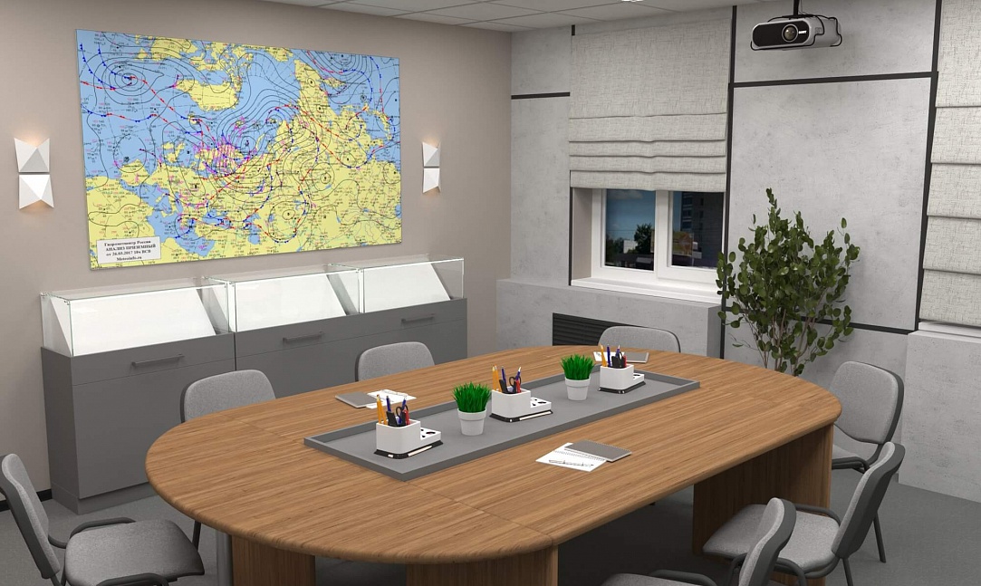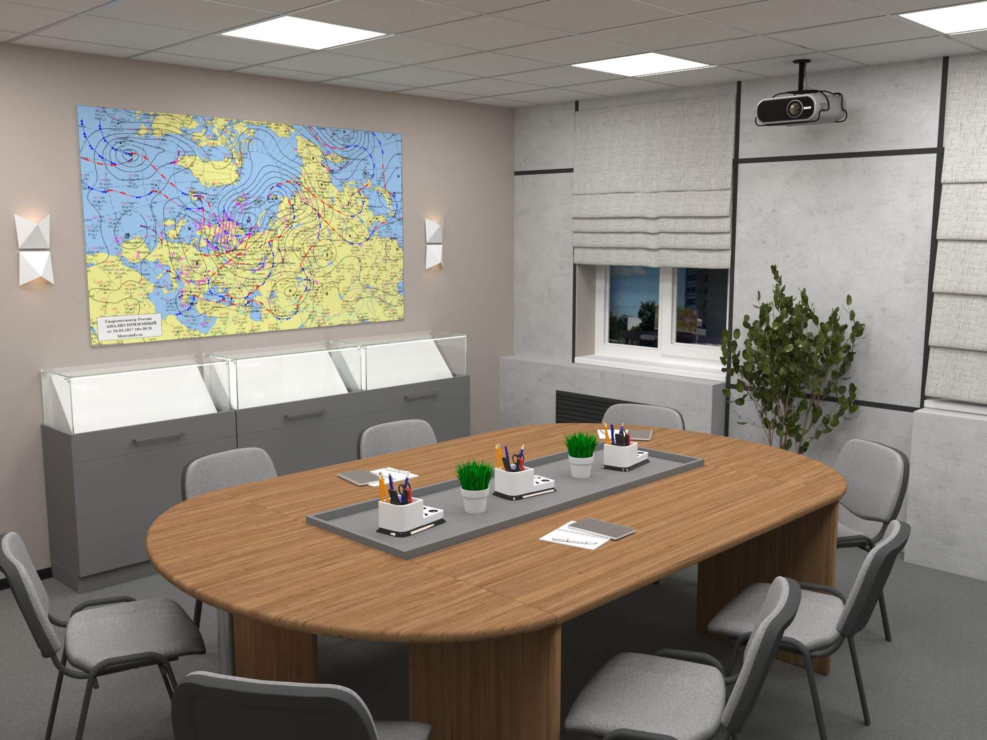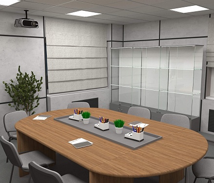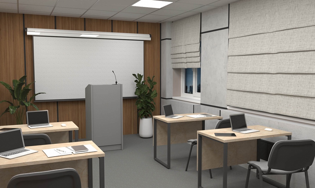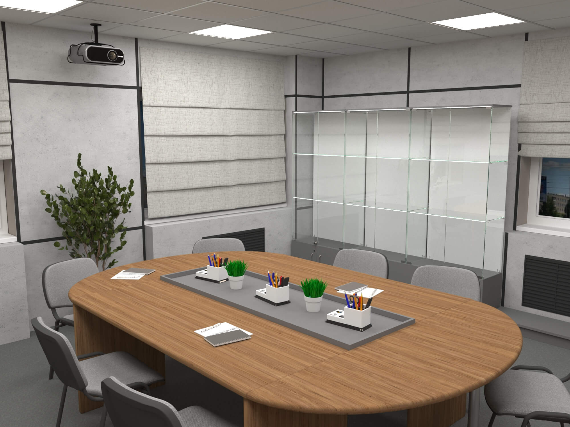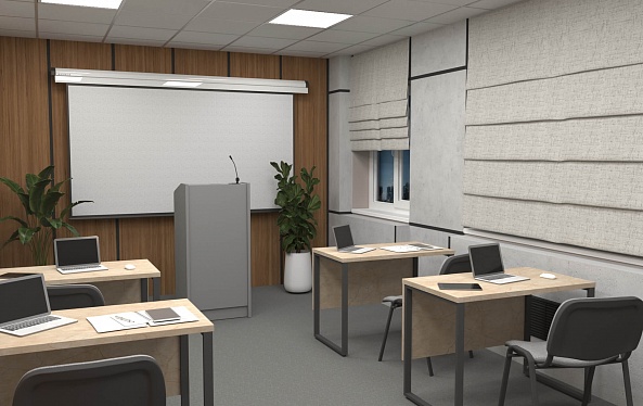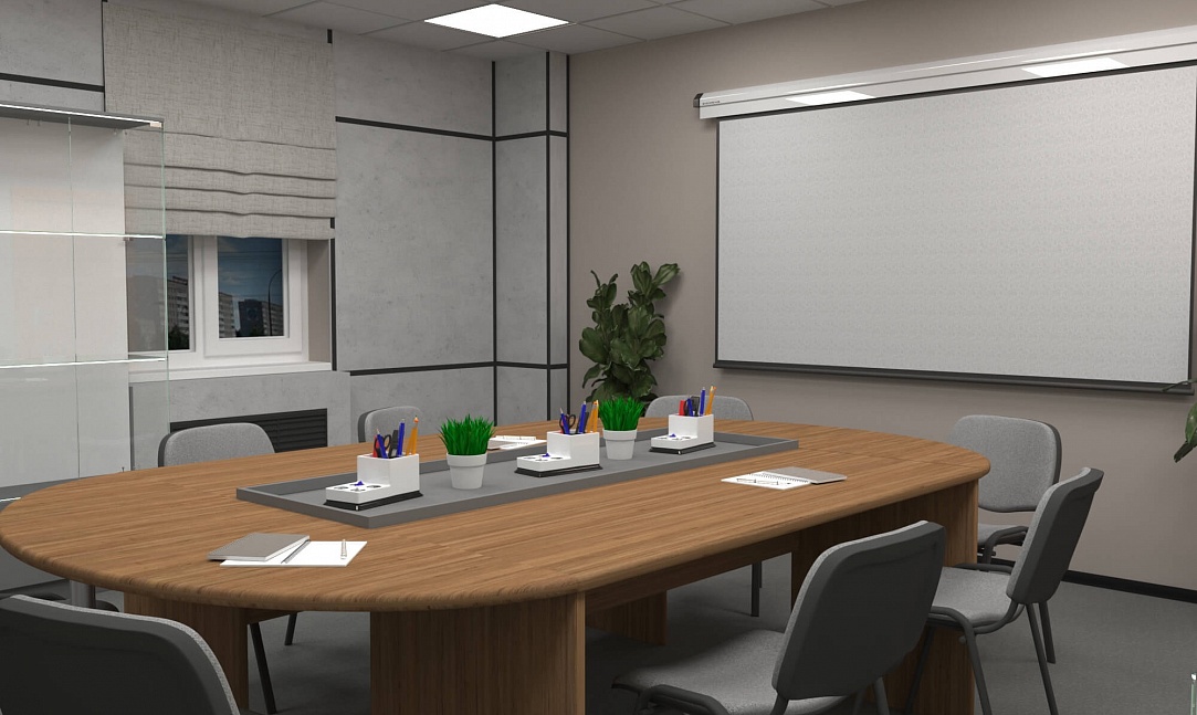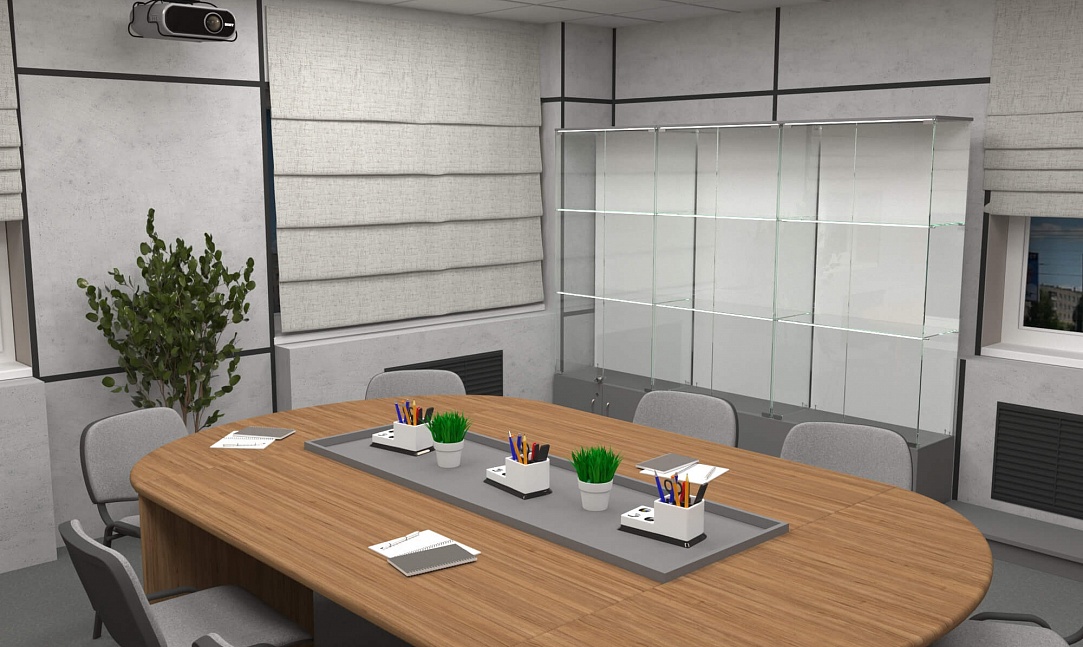 Задача - разработать дизайн конференц кабинета, закрыть существующие батареи и разместить рабочие места с трибуной, также разработать дизайн музея