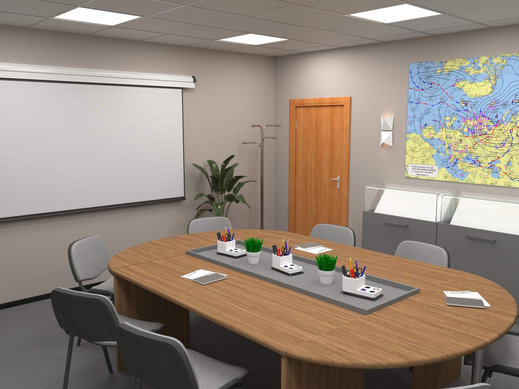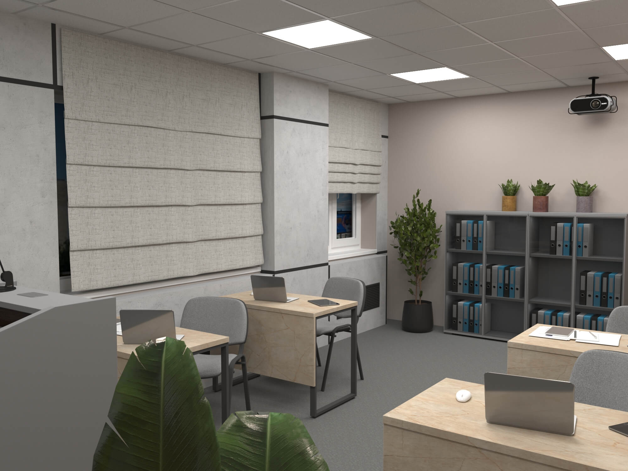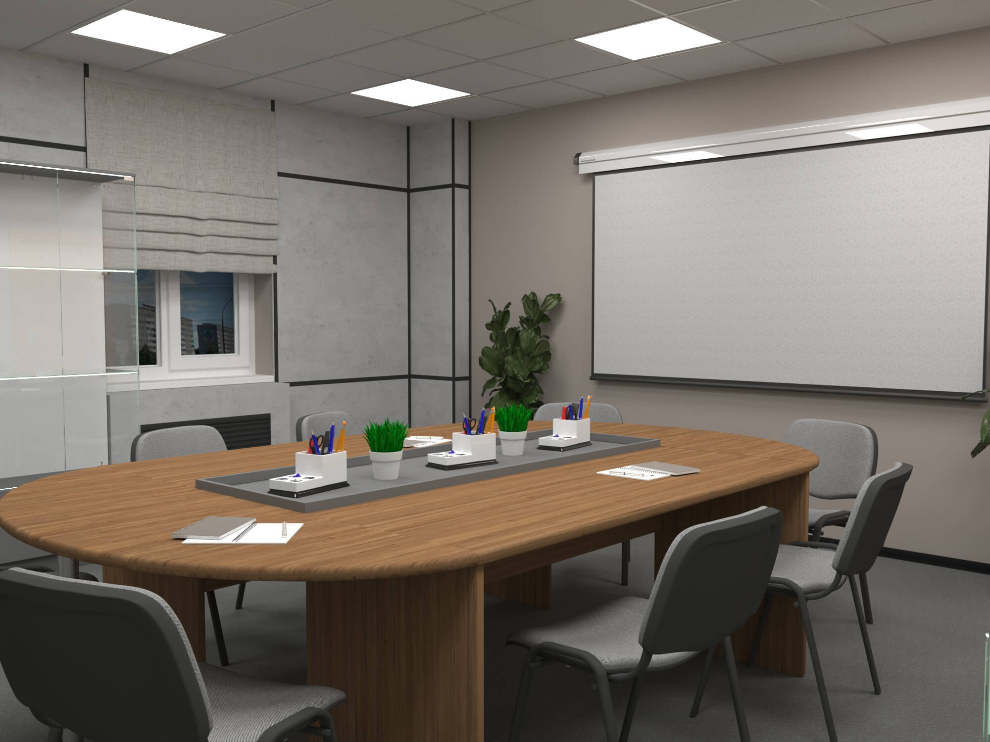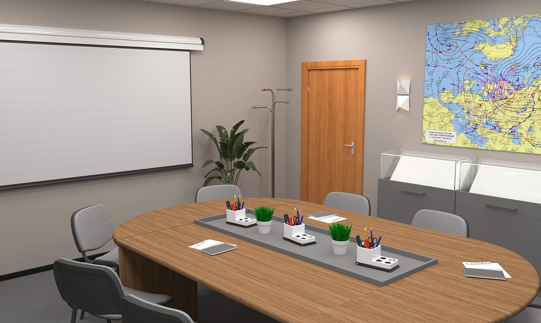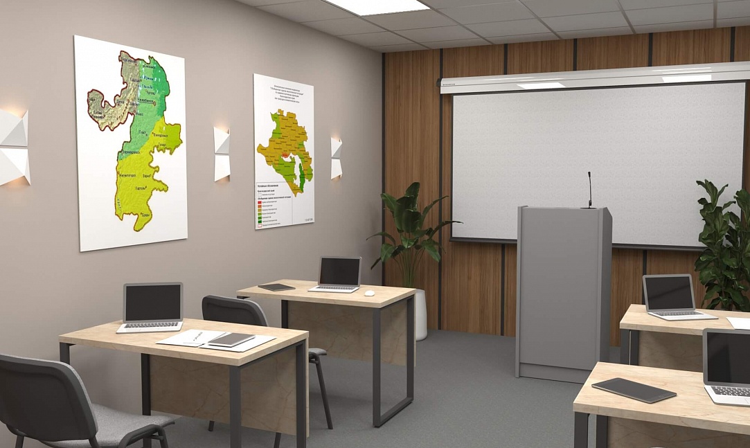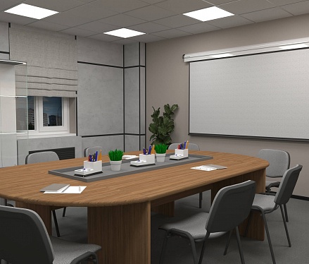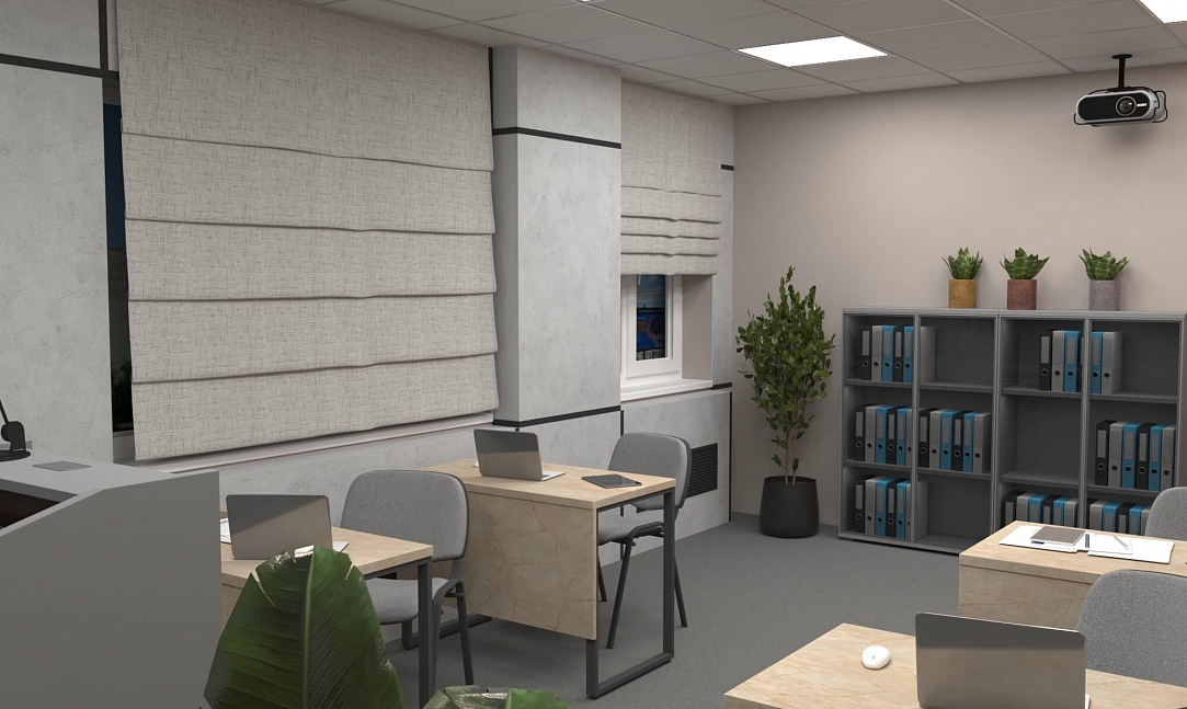 Задача - разработать дизайн конференц кабинета, закрыть существующие батареи и разместить рабочие места с трибуной, также разработать дизайн музея