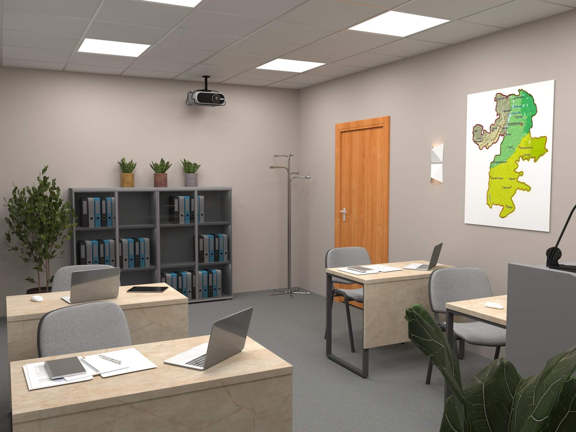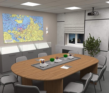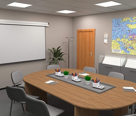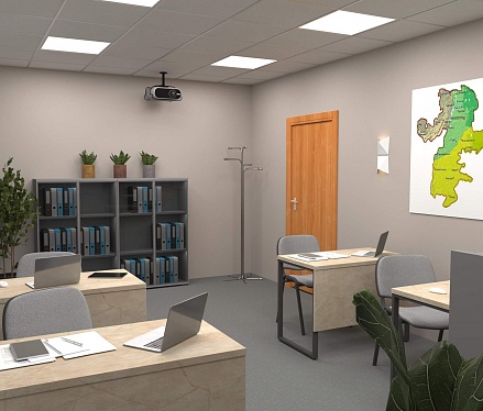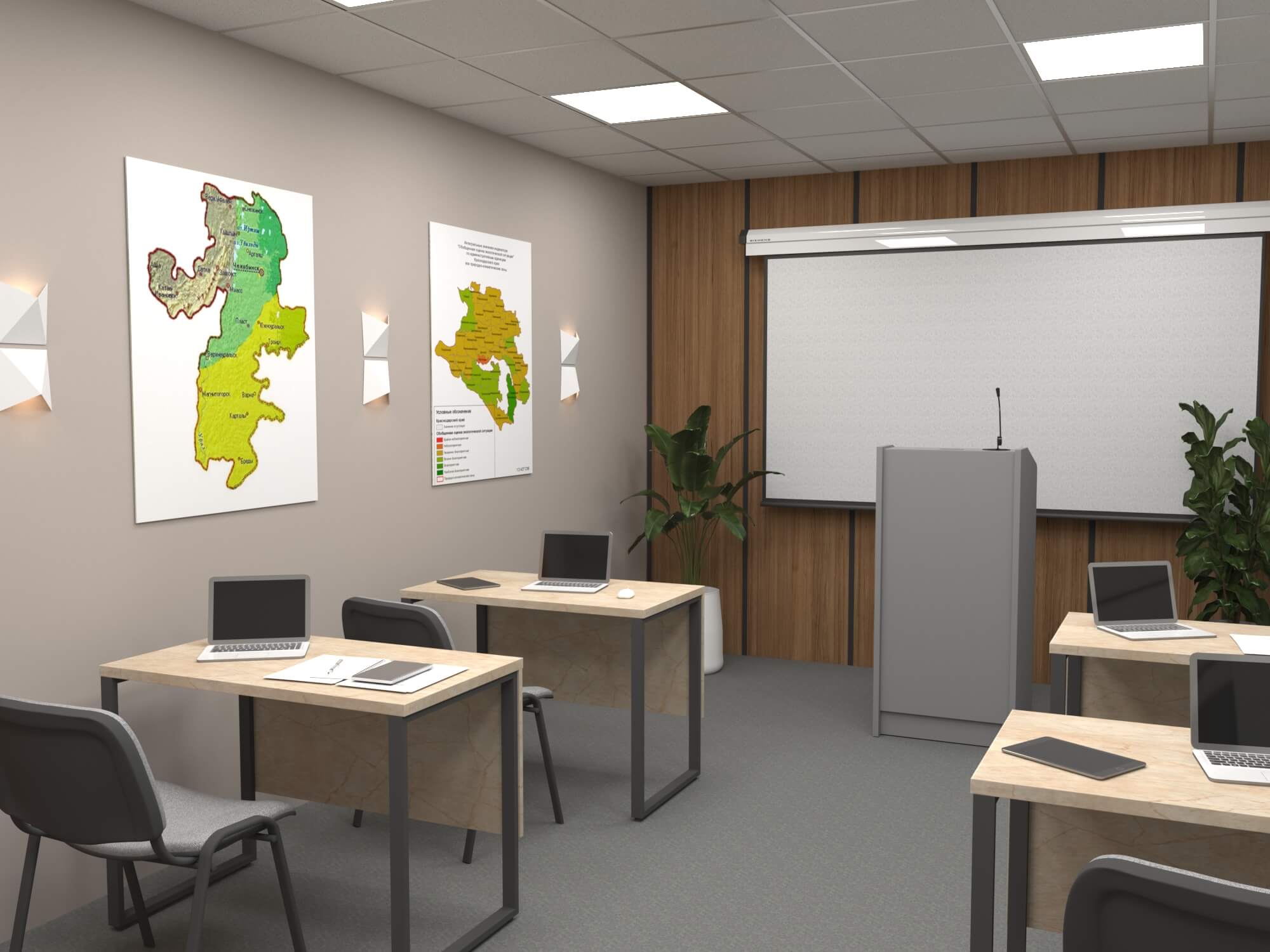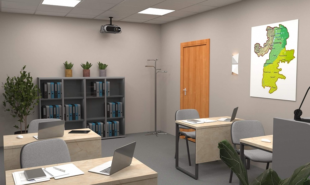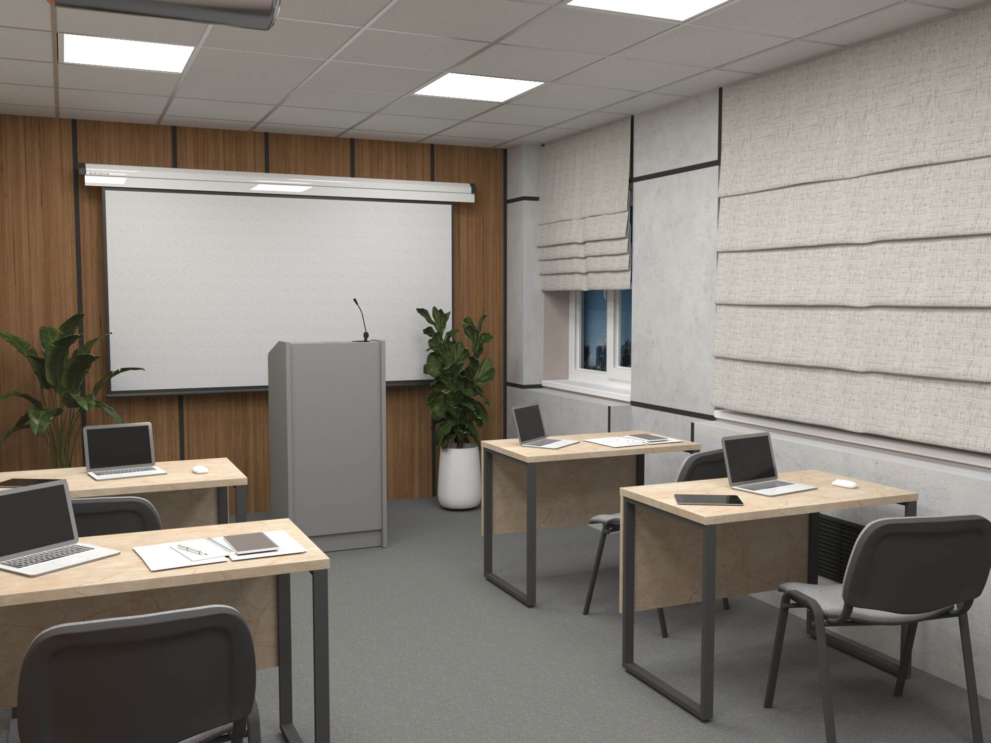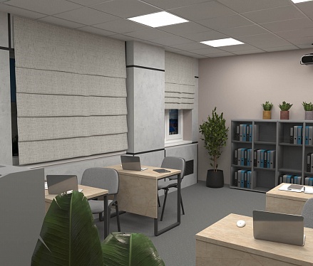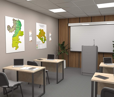 Задача - разработать дизайн конференц кабинета, закрыть существующие батареи и разместить рабочие места с трибуной, также разработать дизайн музея