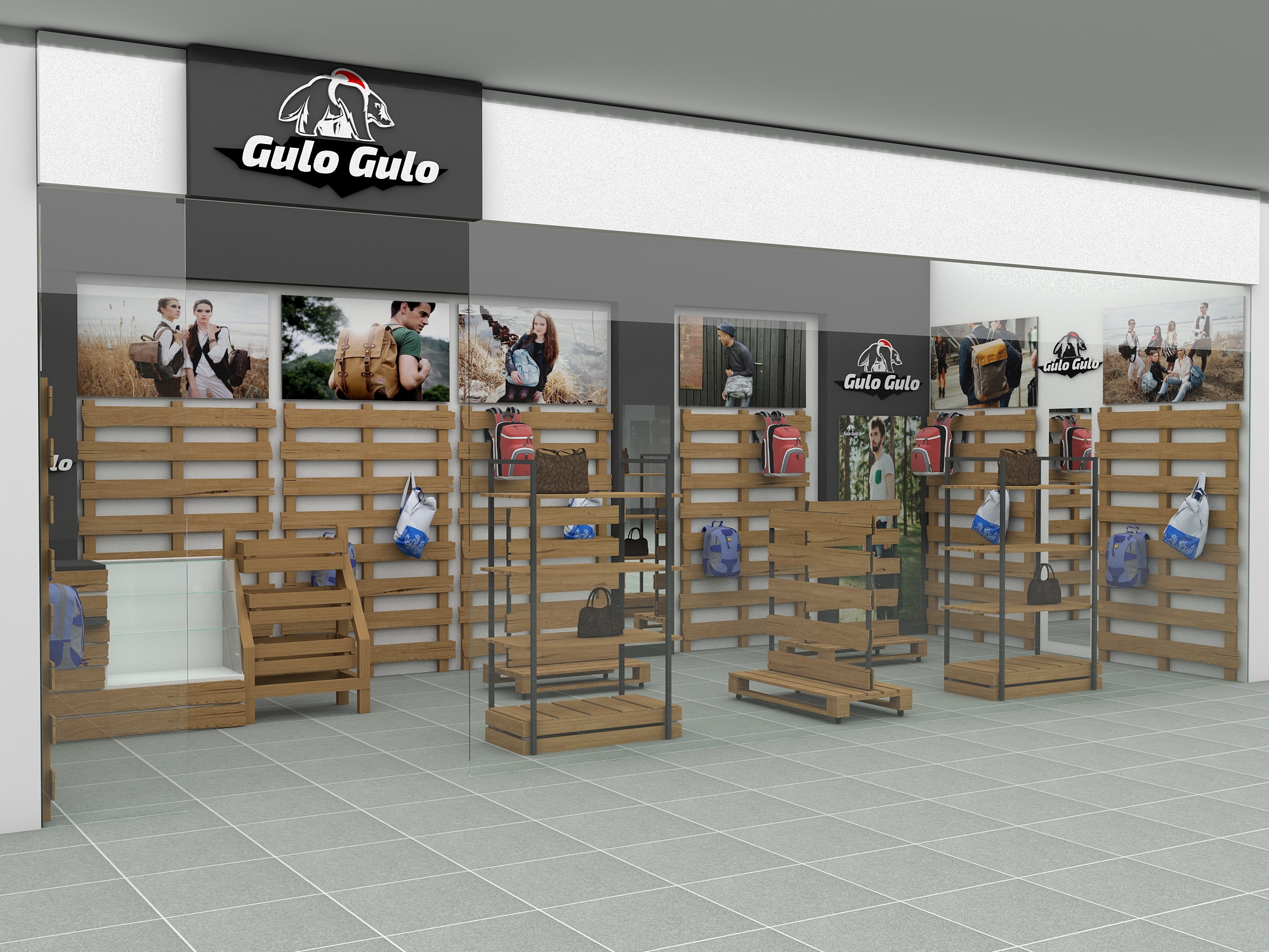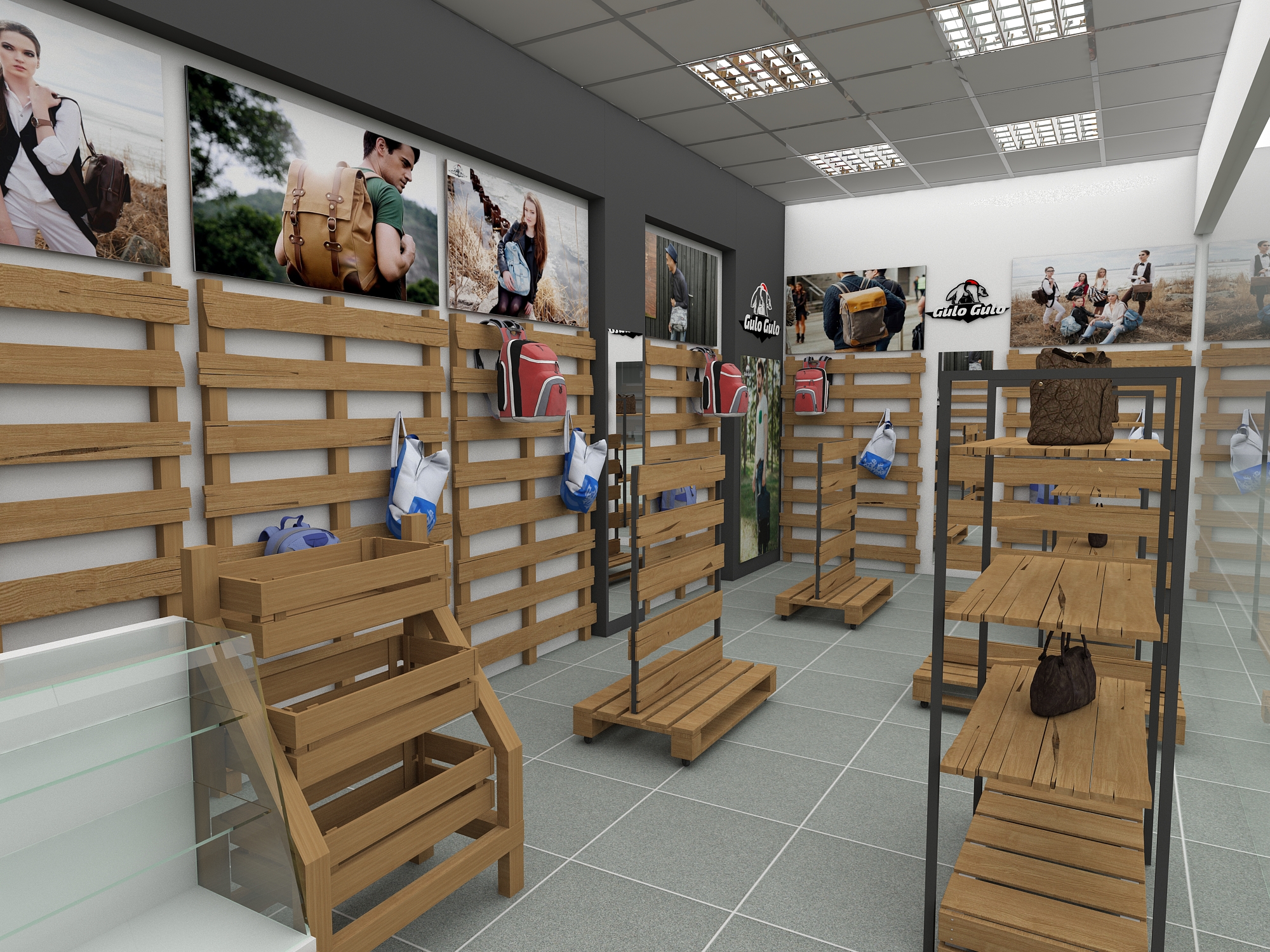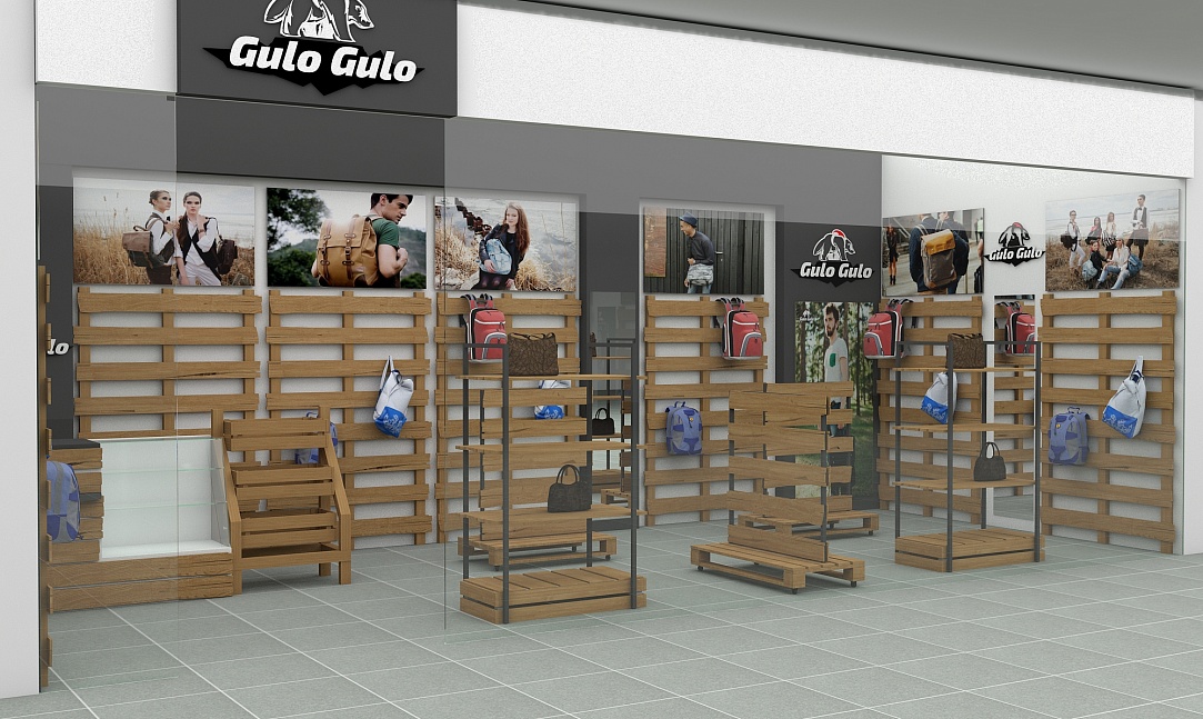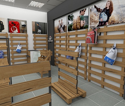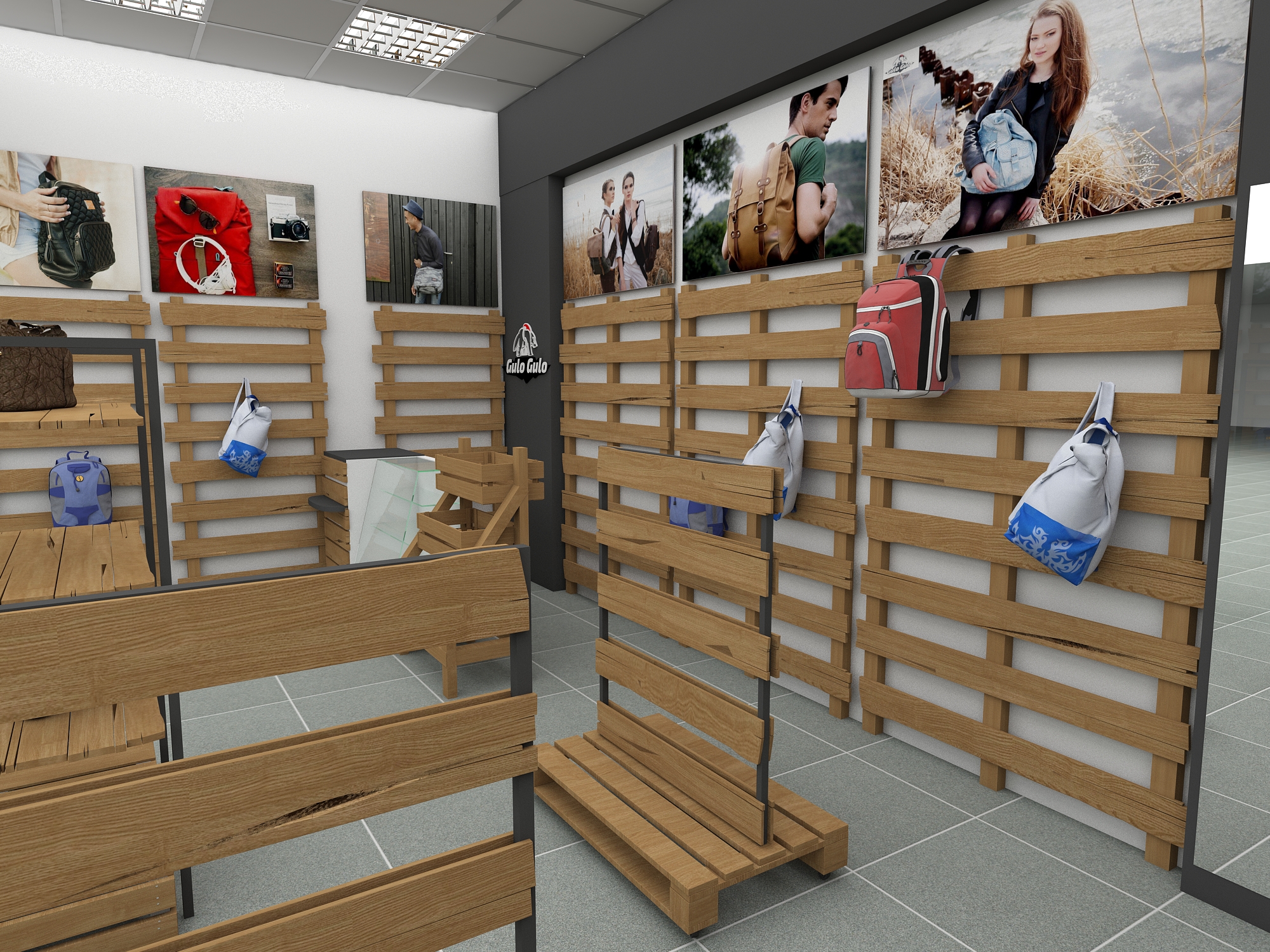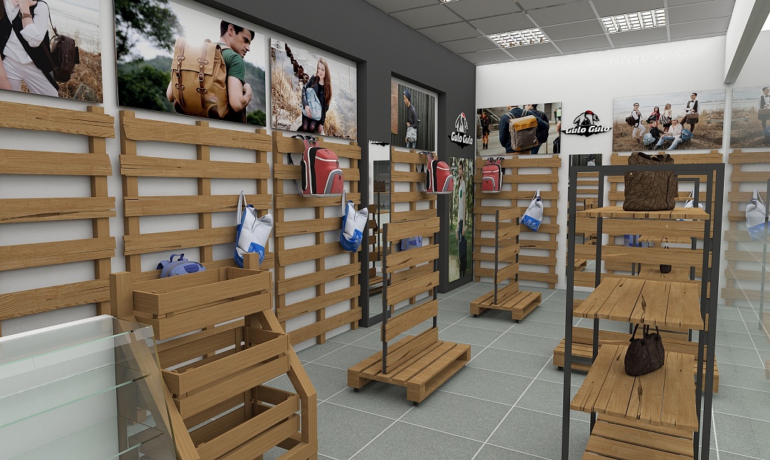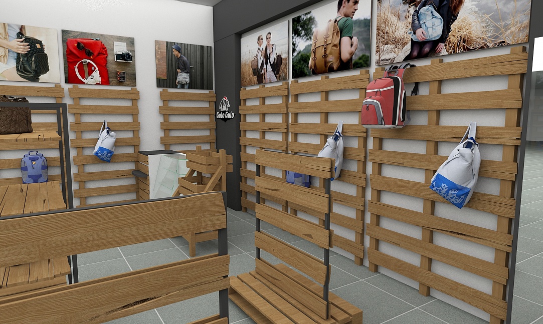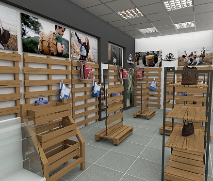 Задача - разработать дизайн интерьера магазина рюкзаков в кантри стиле.