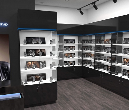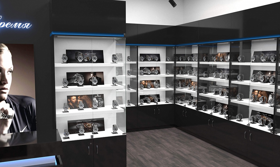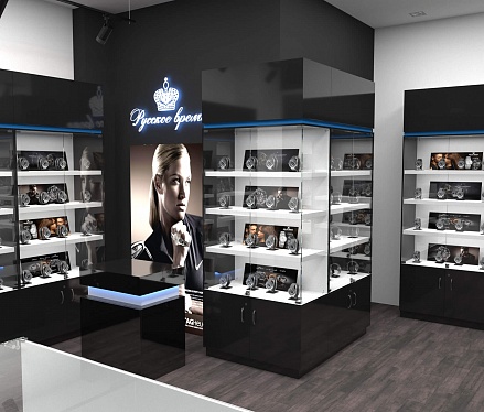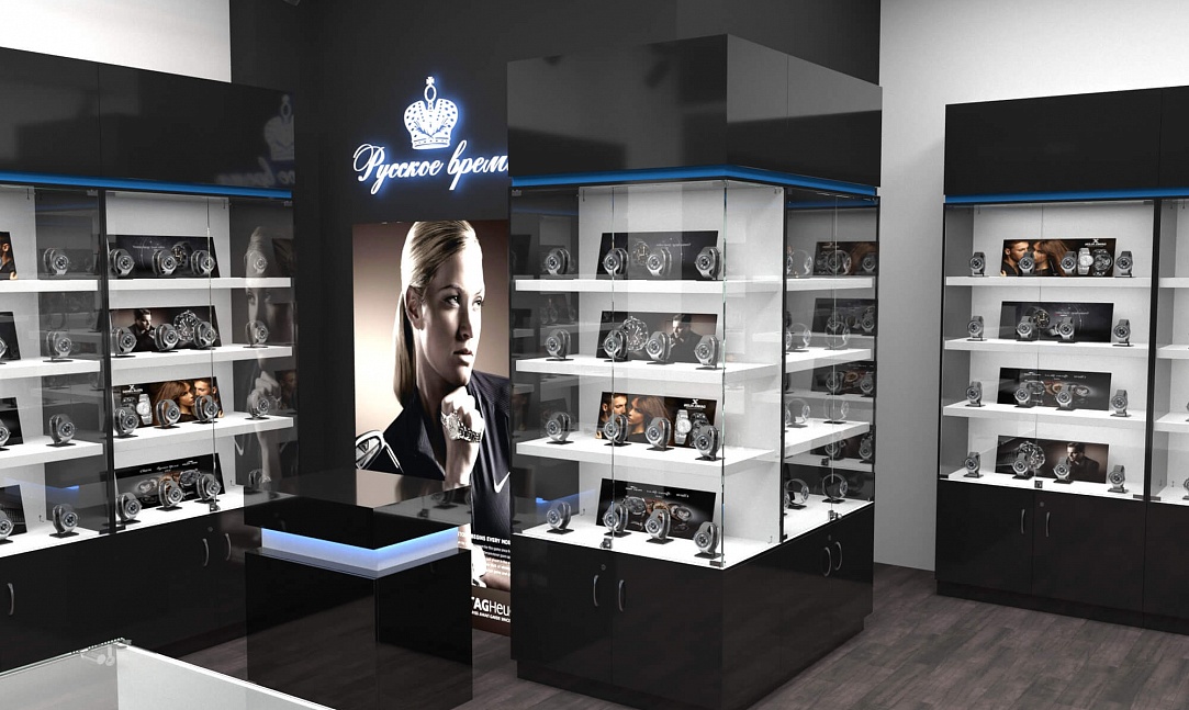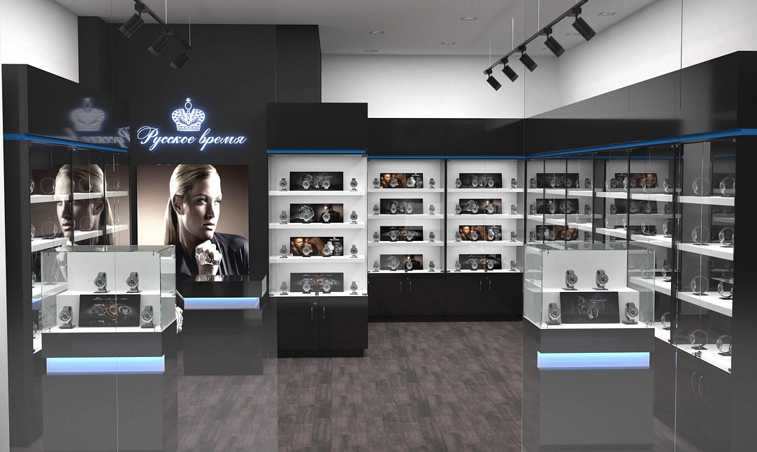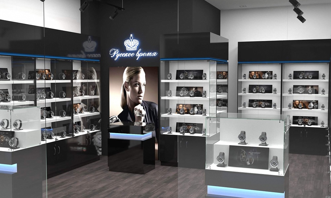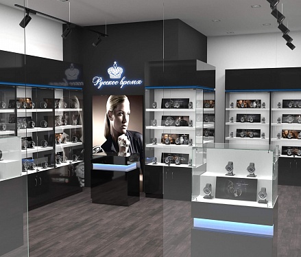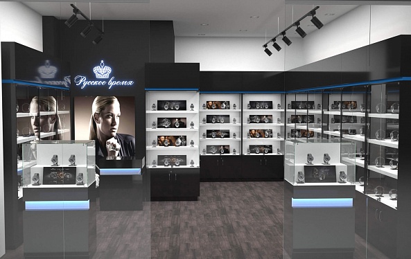 Задача - разработать дизайн торговой площади для магазина часов "Русское время"