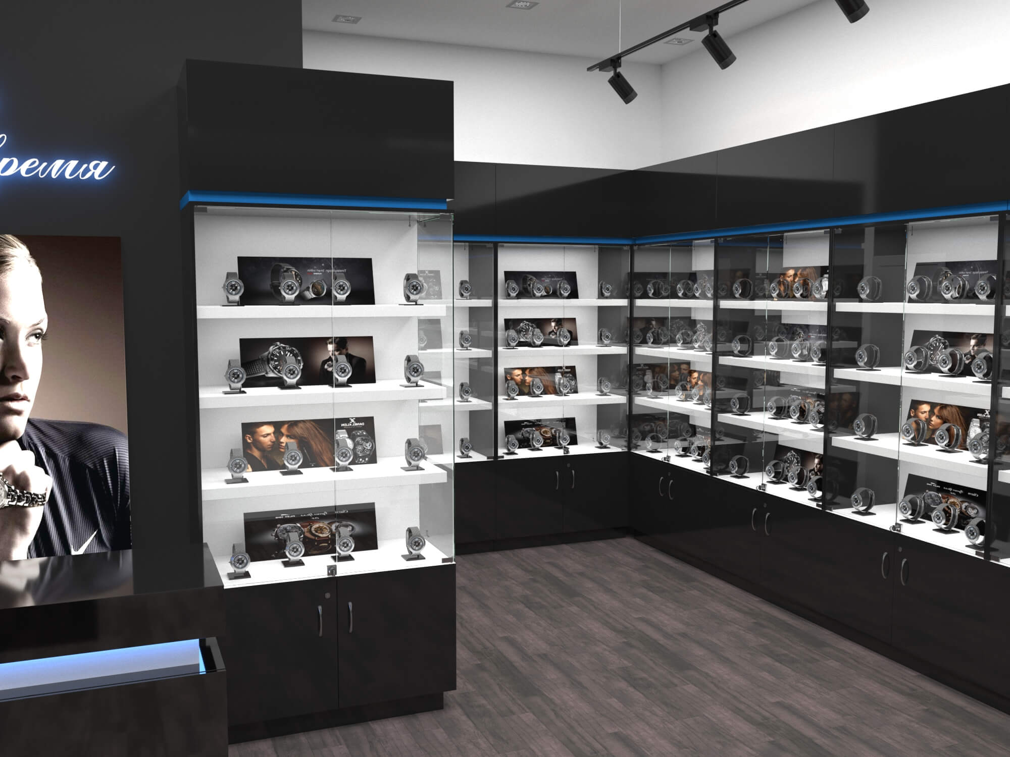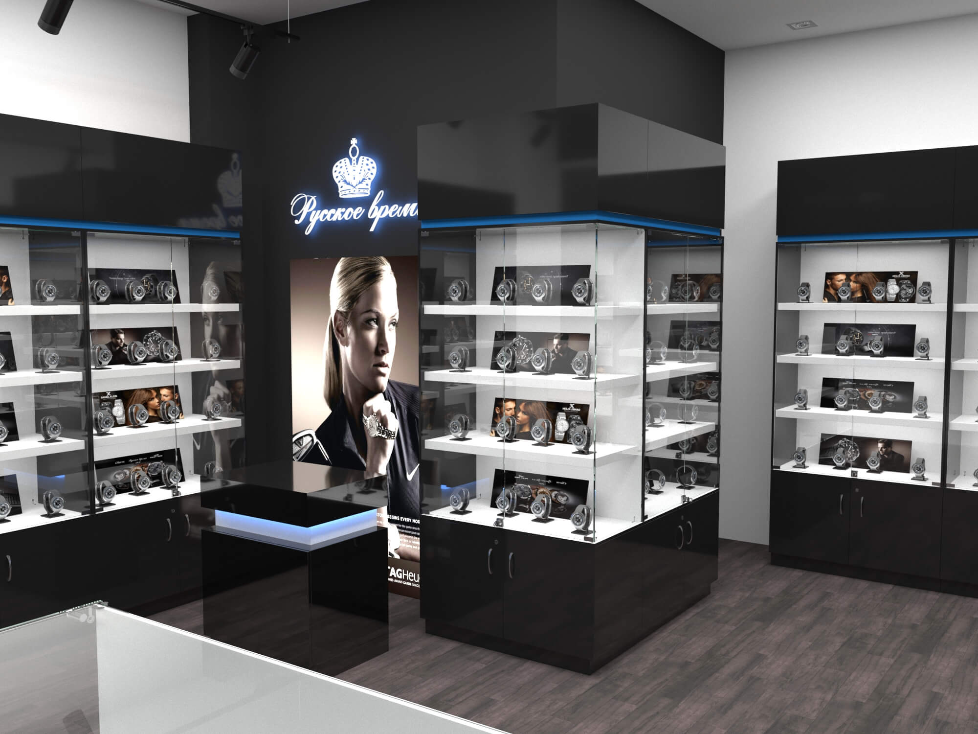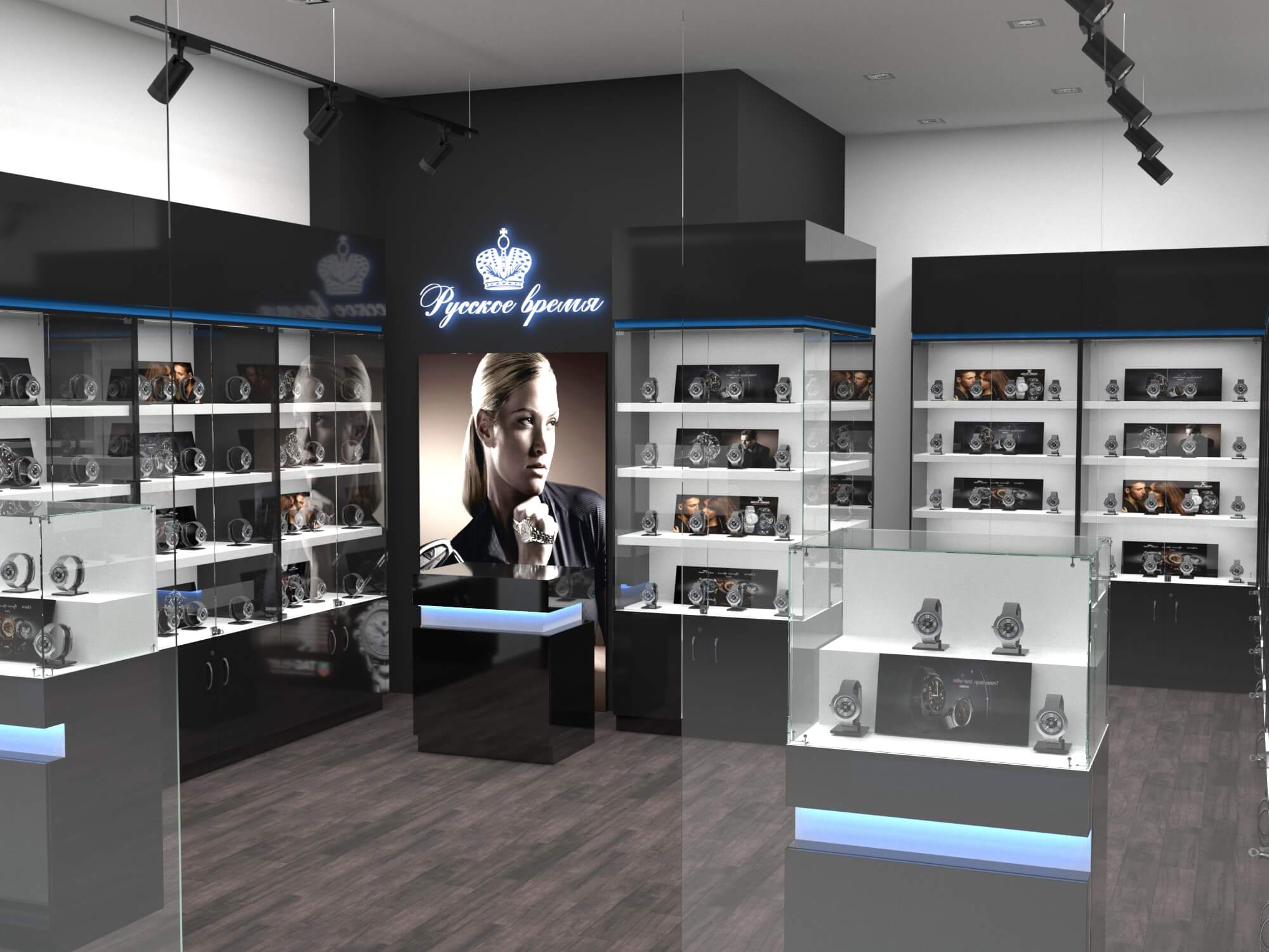 Задача - разработать дизайн торговой площади для магазина часов "Русское время"