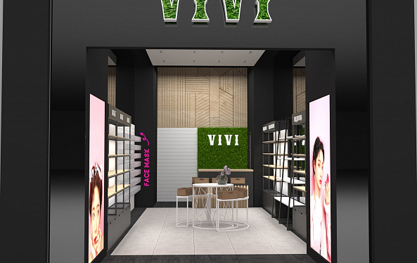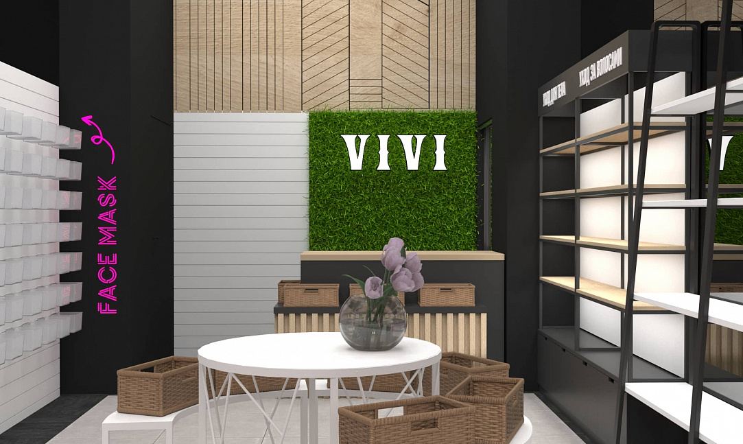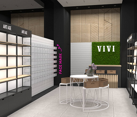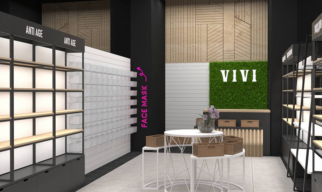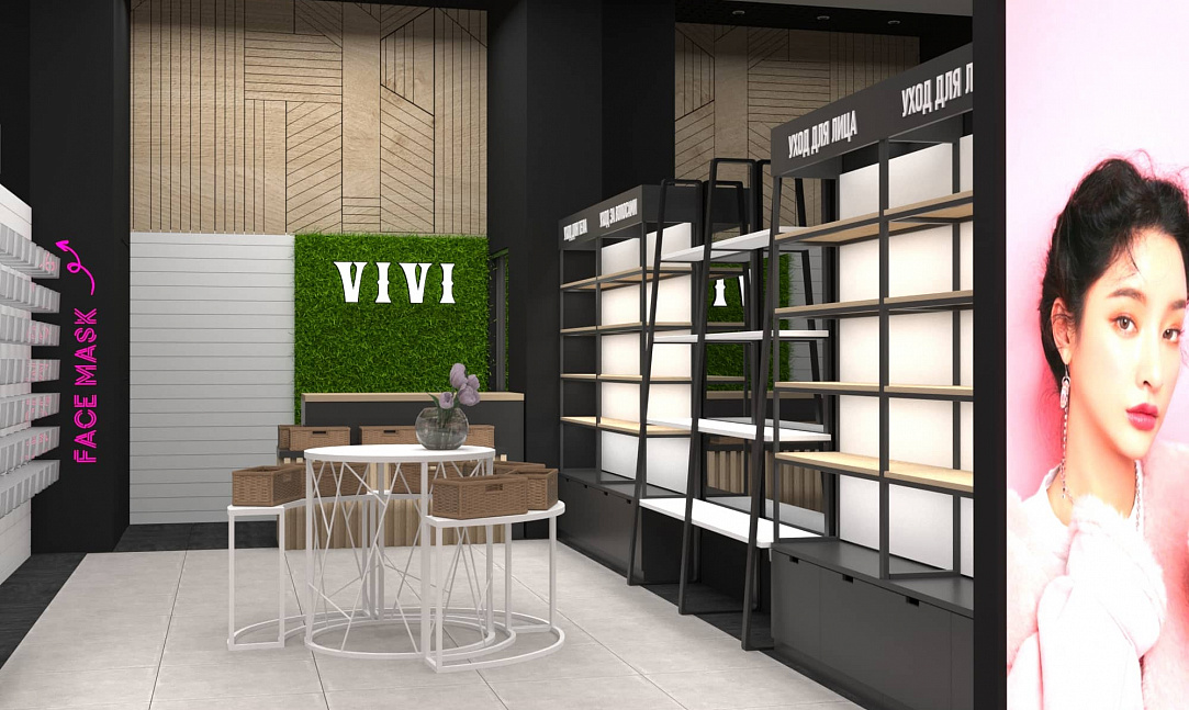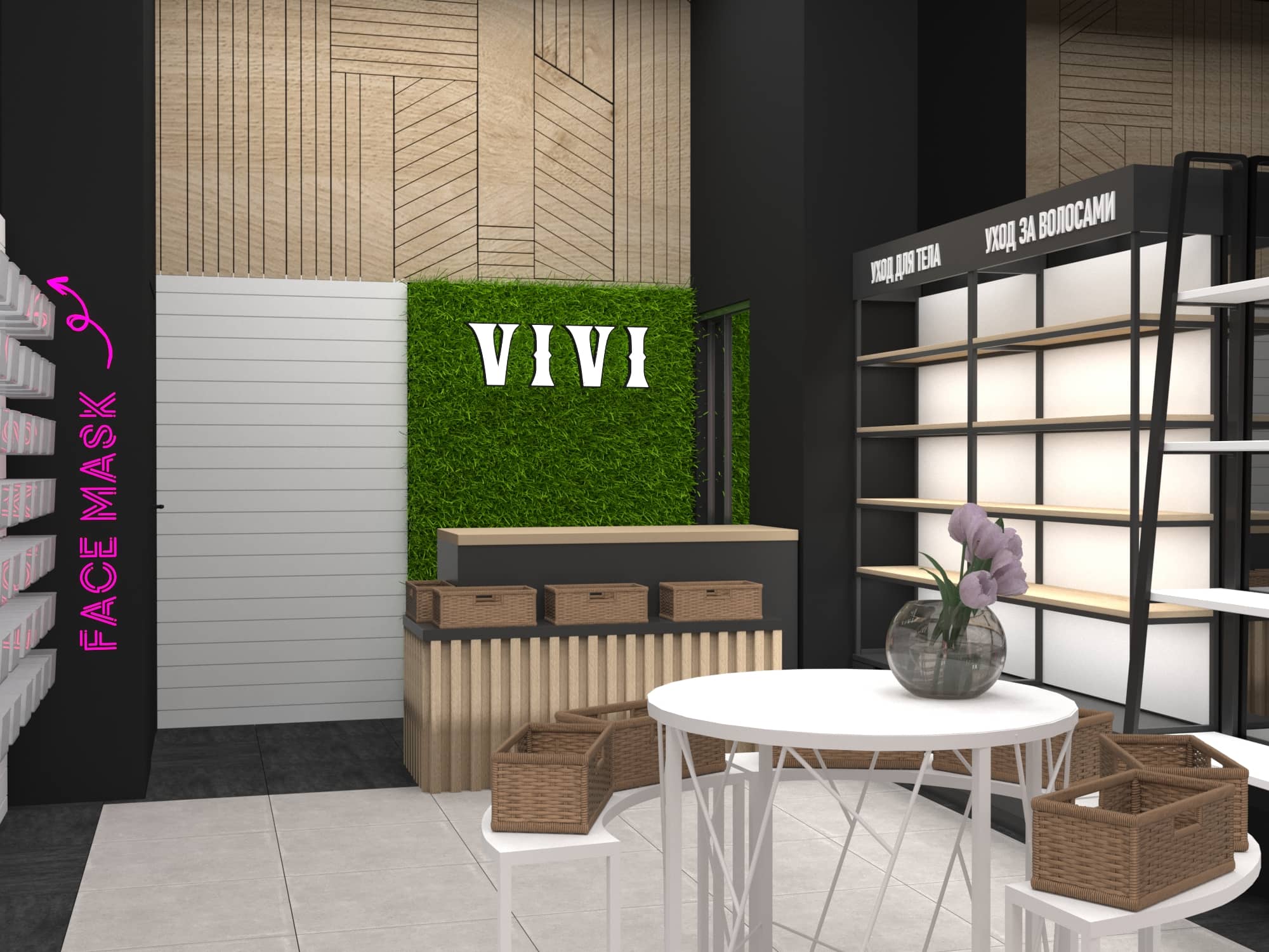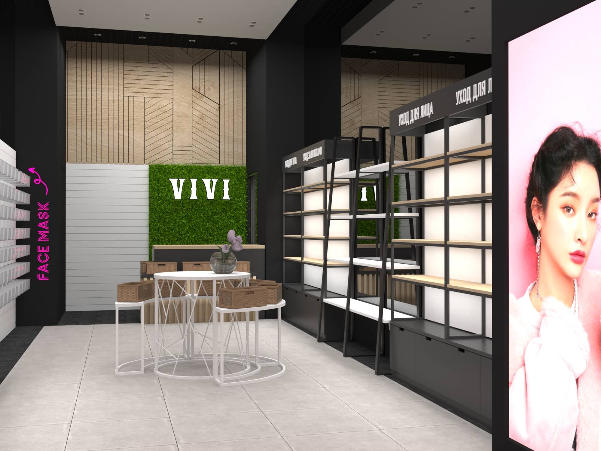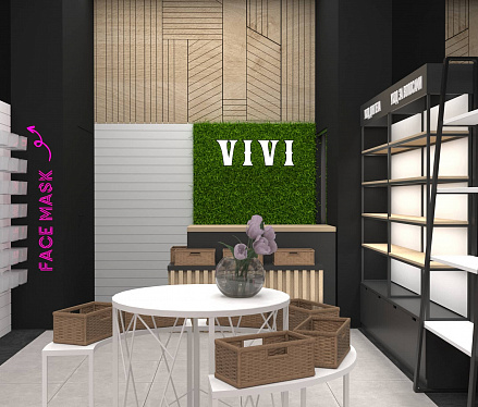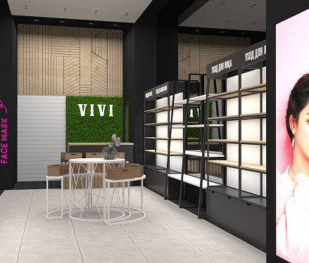 Для магазина корейской косметики "VIVI" был разработан собственный дизайн в фирменном стиле.Интерьер помещения содержит в себе фирменный цвета компании "VIVI-cosmetics",которые гармонично переплетены друг с другом и проходят через все его элементы.
