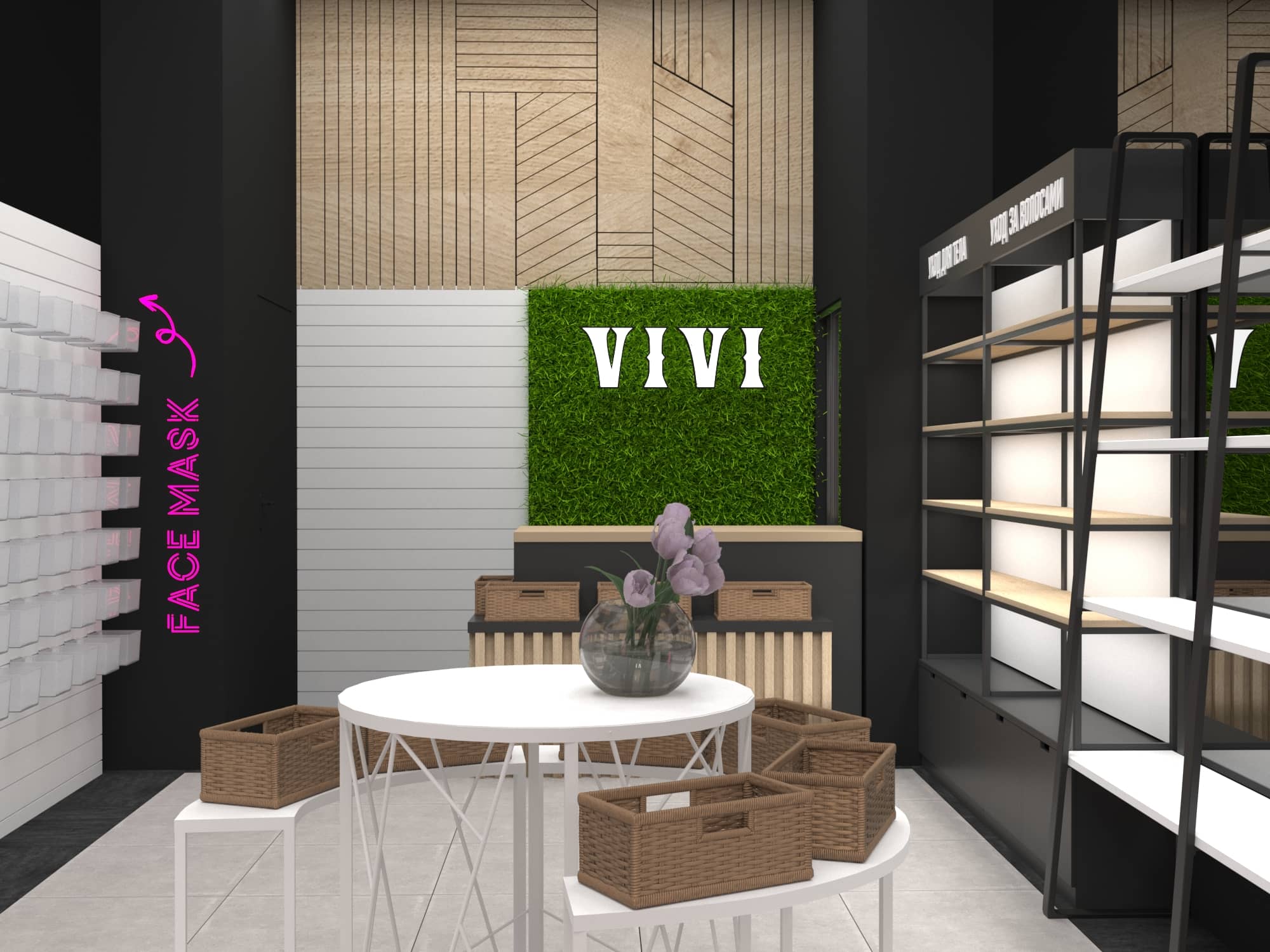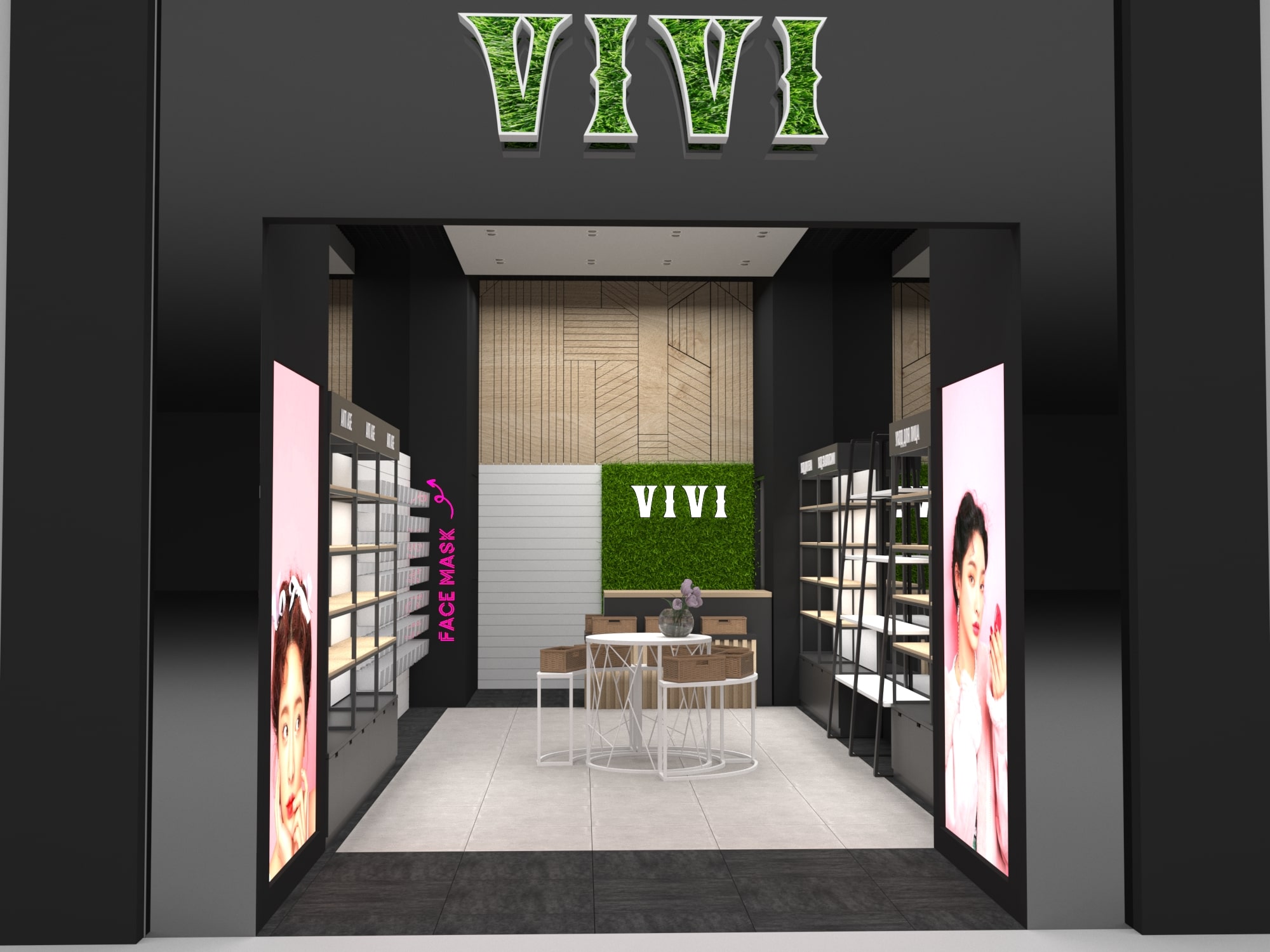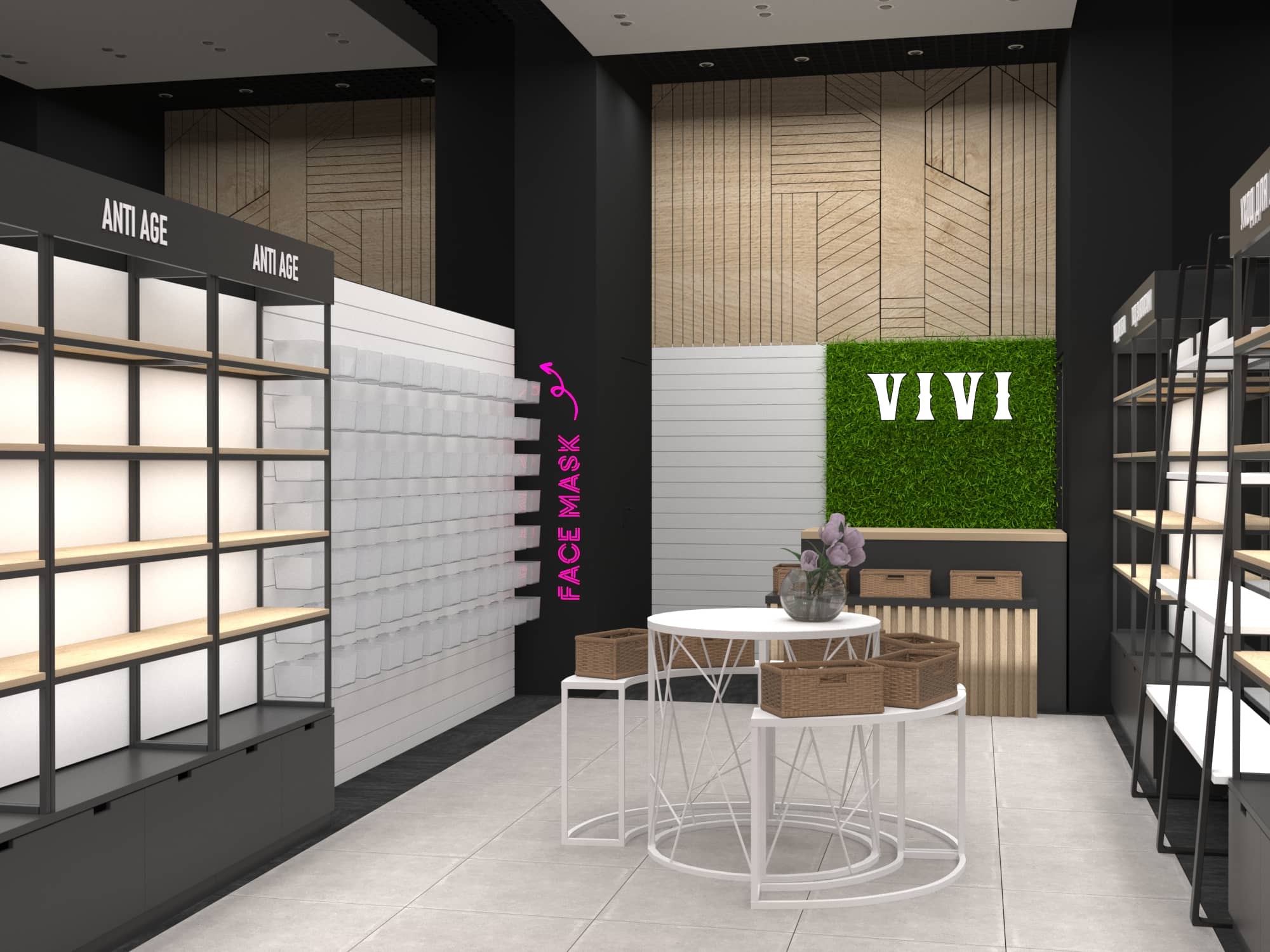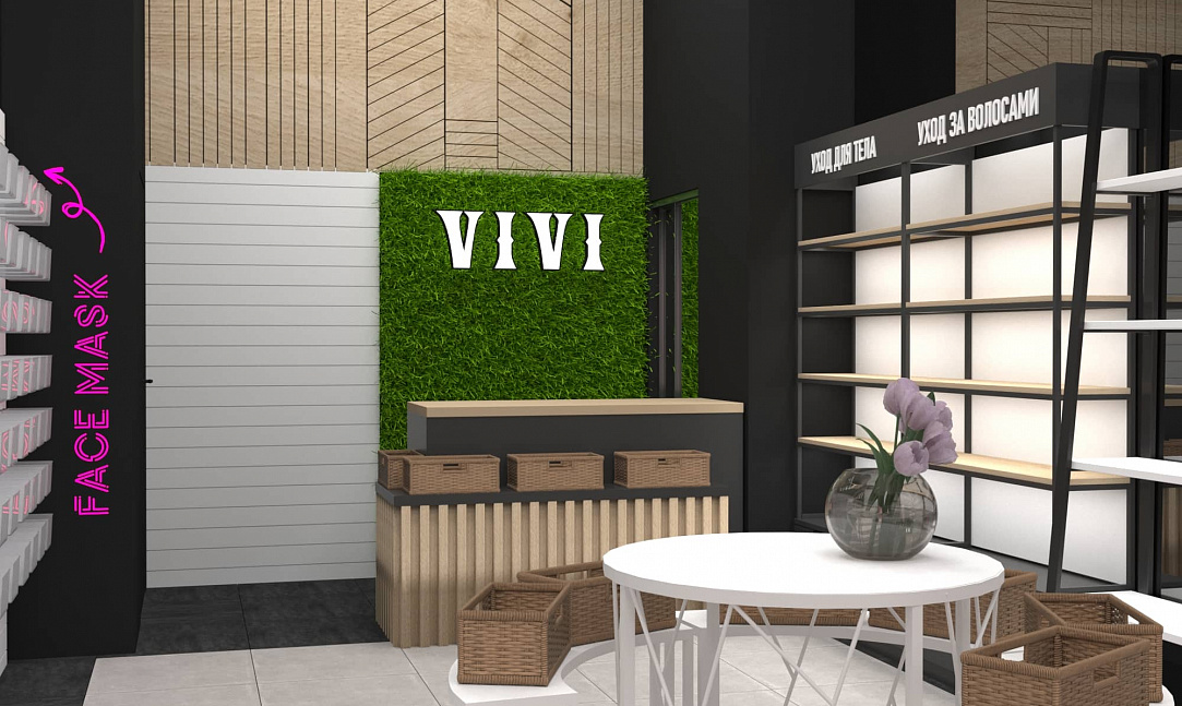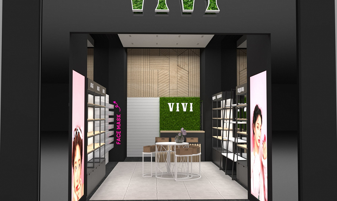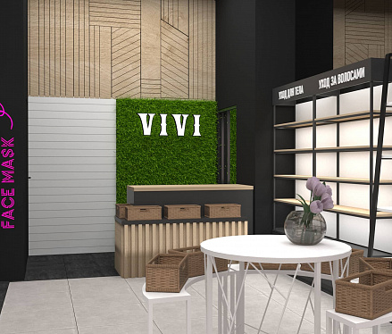 Для магазина корейской косметики "VIVI" был разработан собственный дизайн в фирменном стиле.Интерьер помещения содержит в себе фирменный цвета компании "VIVI-cosmetics",которые гармонично переплетены друг с другом и проходят через все его элементы.