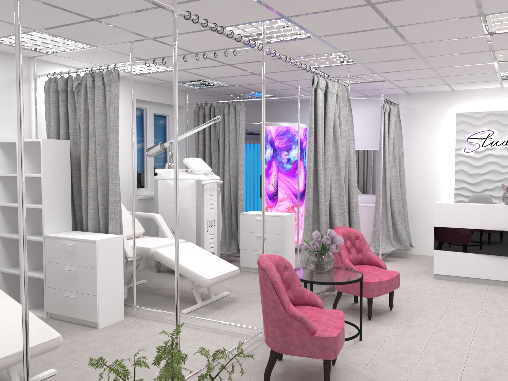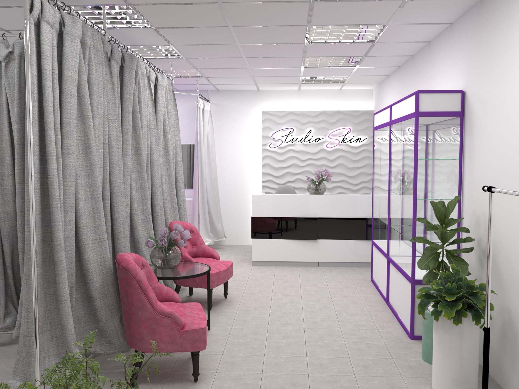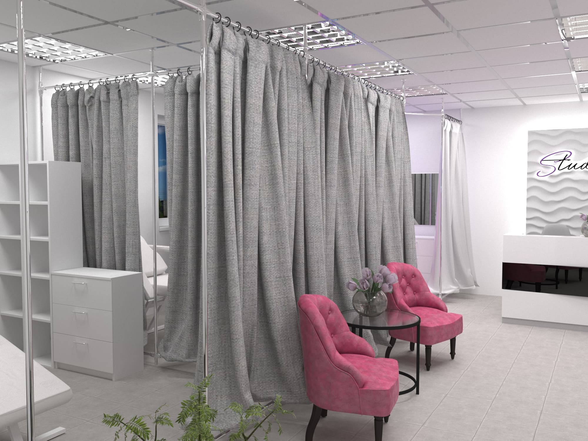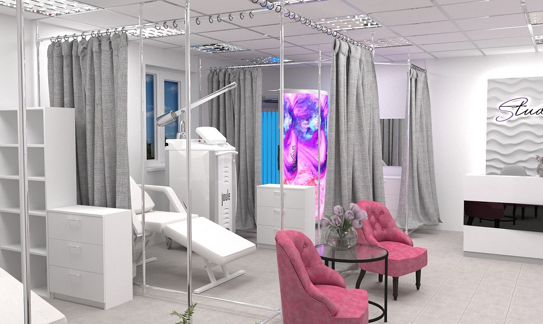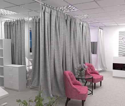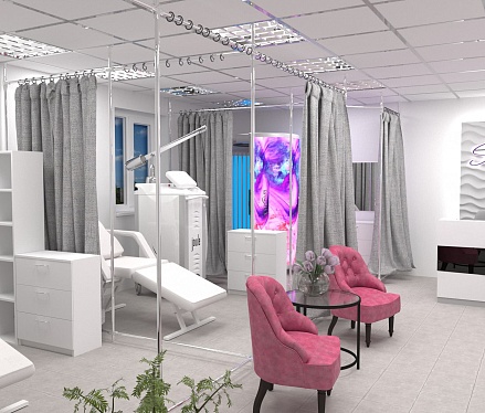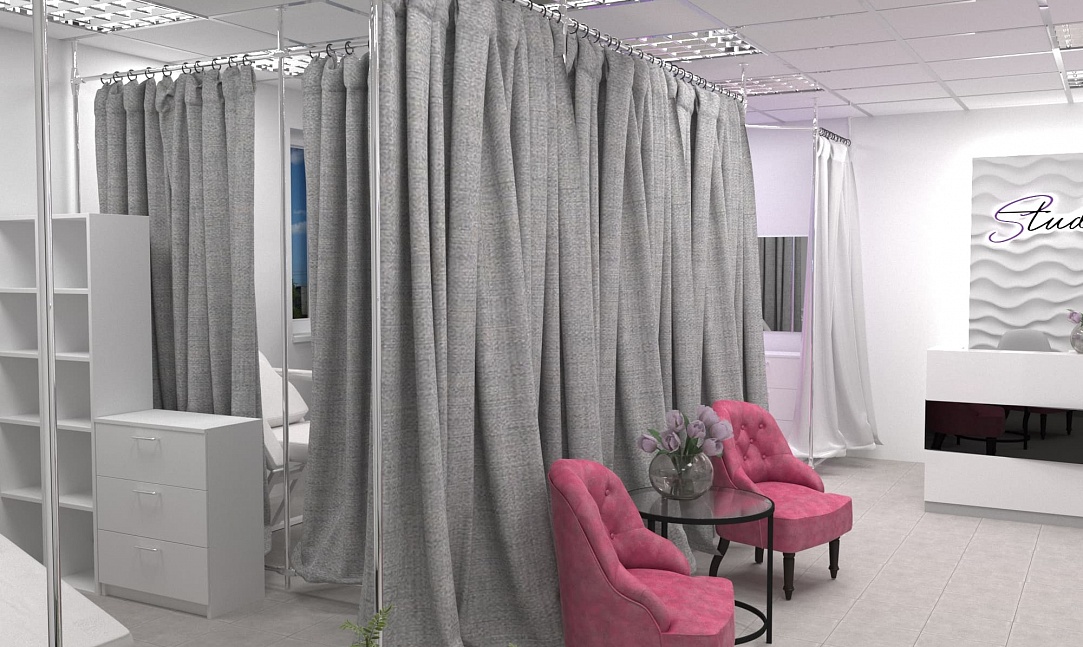 Все тайные и полезные процедуры пройдут крайне комфортно для клиента и незаметно для глаз посторонних. Это, наверное самое важное, что следует учитывать при создании дизайна интерьера салонов красоты такого типа. Для этого мы предусмотрели возможность скрыть происходящее за крупными занавесками из плотной ткани и предоставили мастеру вместе с клиентом всё для спокойной работы: мягкие кресла, качественное освещение и эргономичные системы хранения.