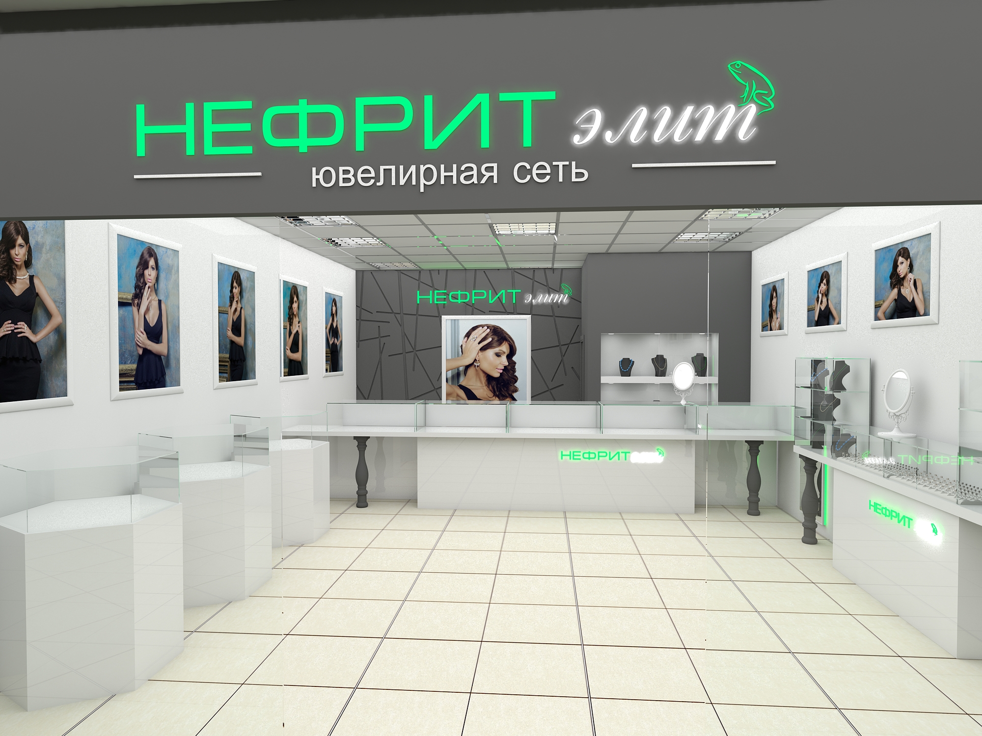 Задача - разработать дизайн интерьера салона ювелирного магазина в зеленых цветах.
