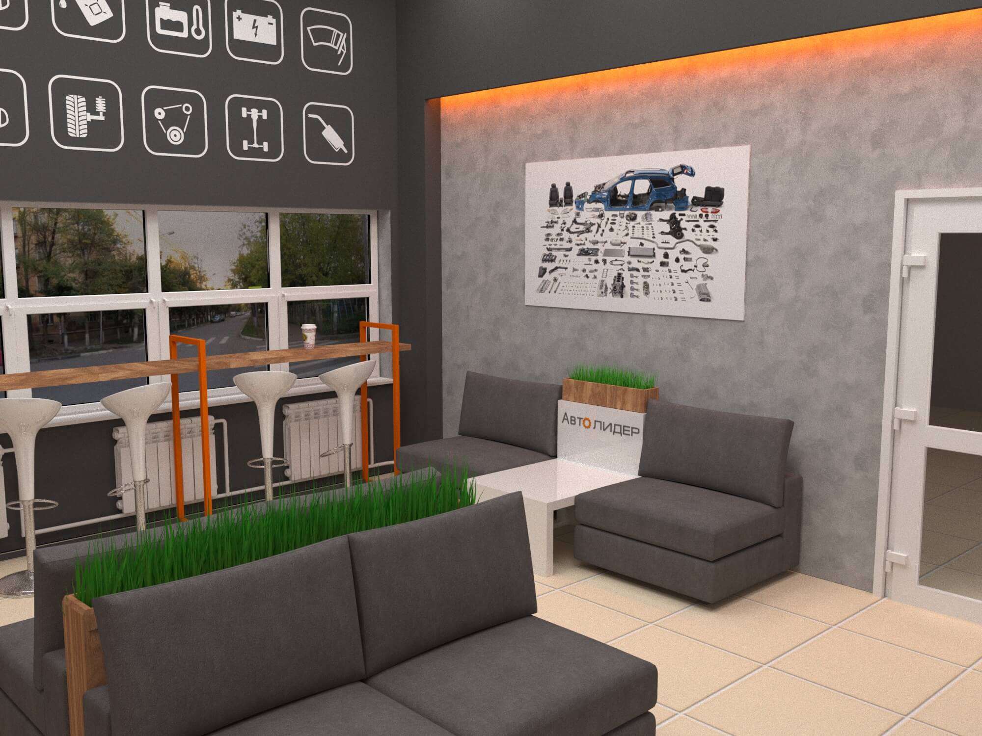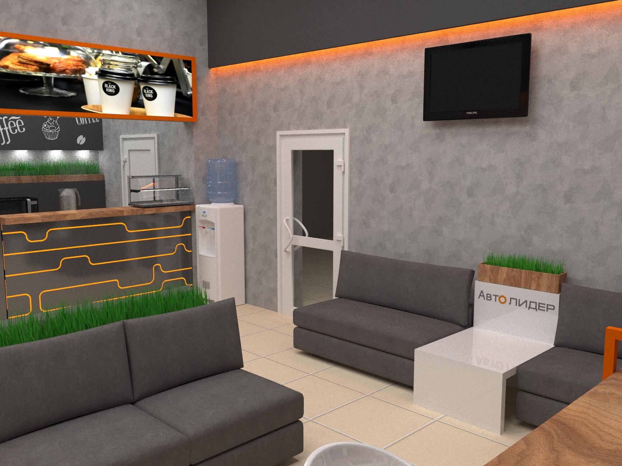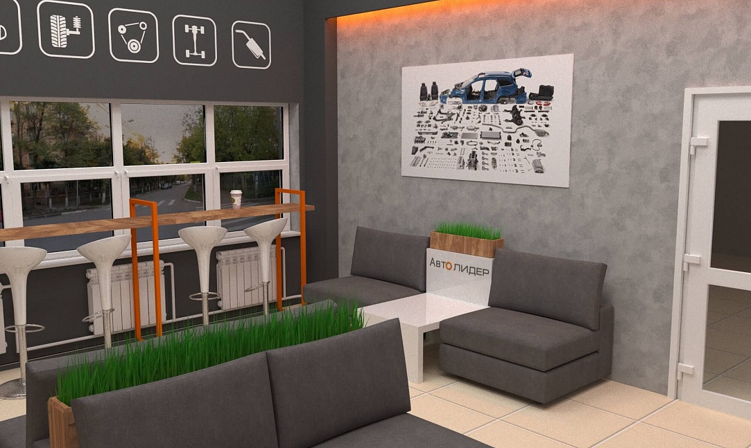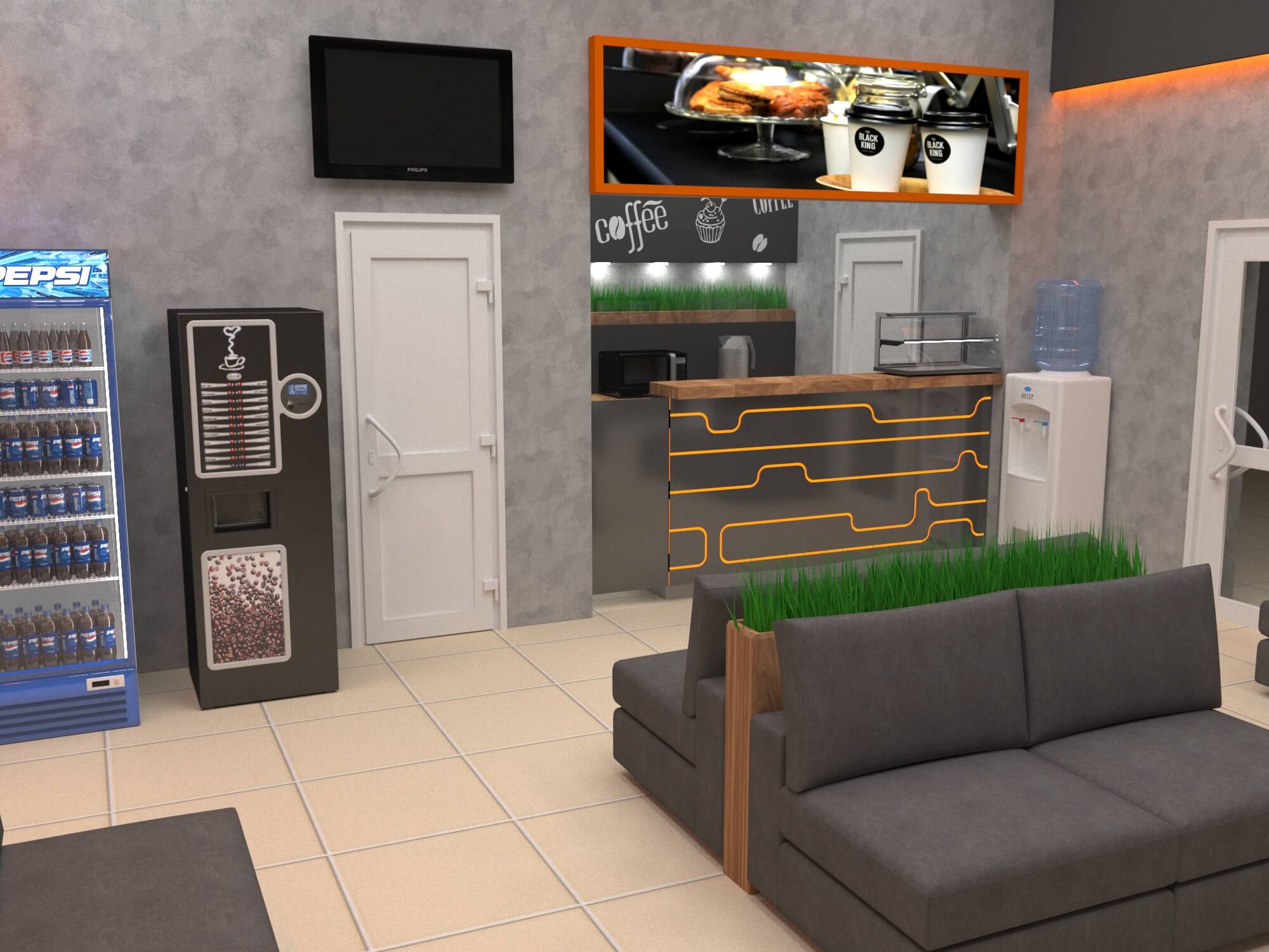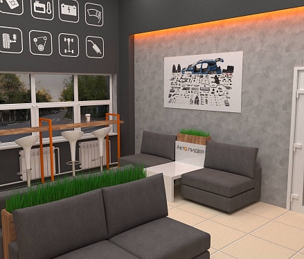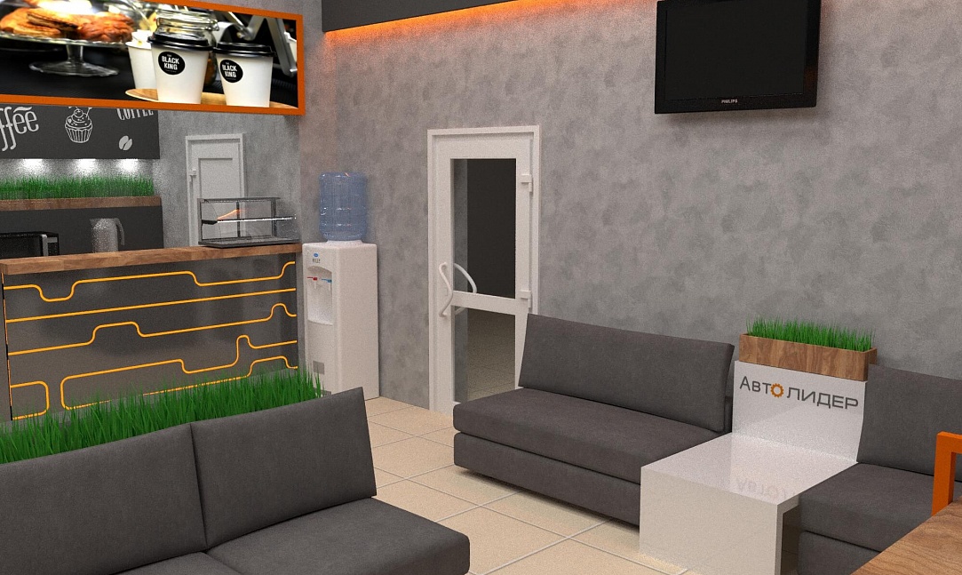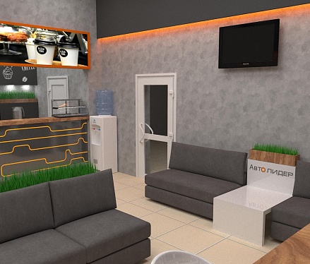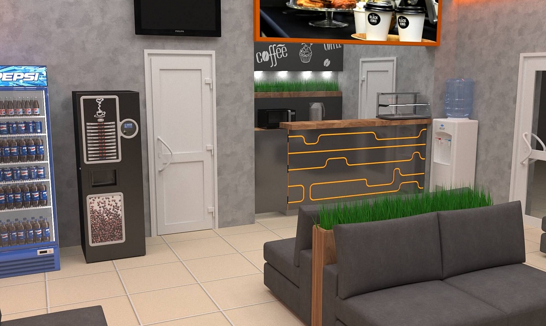 Зона ожидания для клиентов выполнена в строгих тонах с присутствием выделяющихся на этом фоне элементов.Про комфорт также никто не забыл,в данную зону гармонично вписаны автоматы с напитками,а также удобная мебель,эффектно вписывающаяся в интерьер.