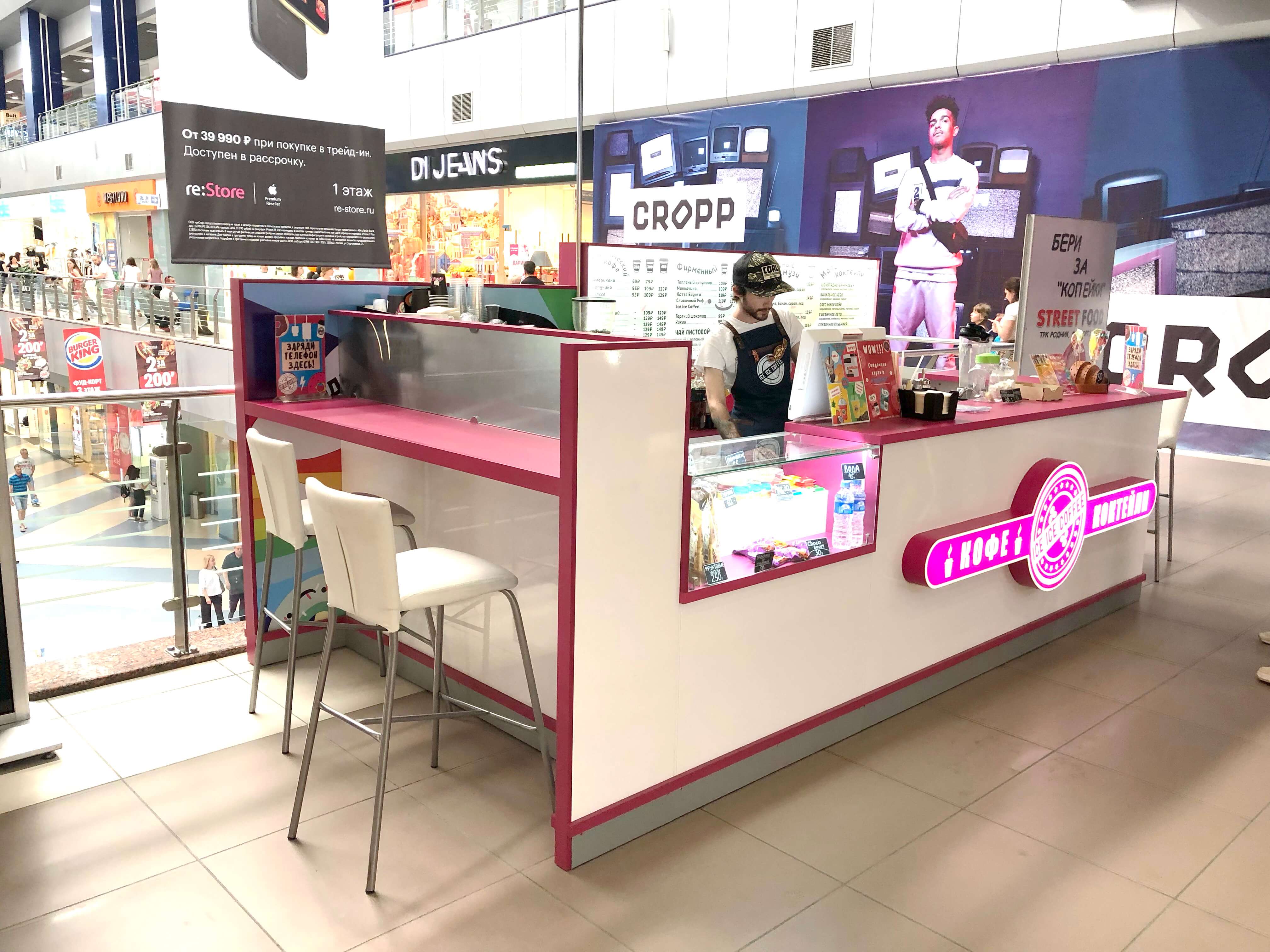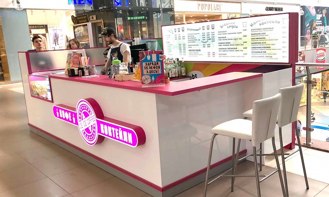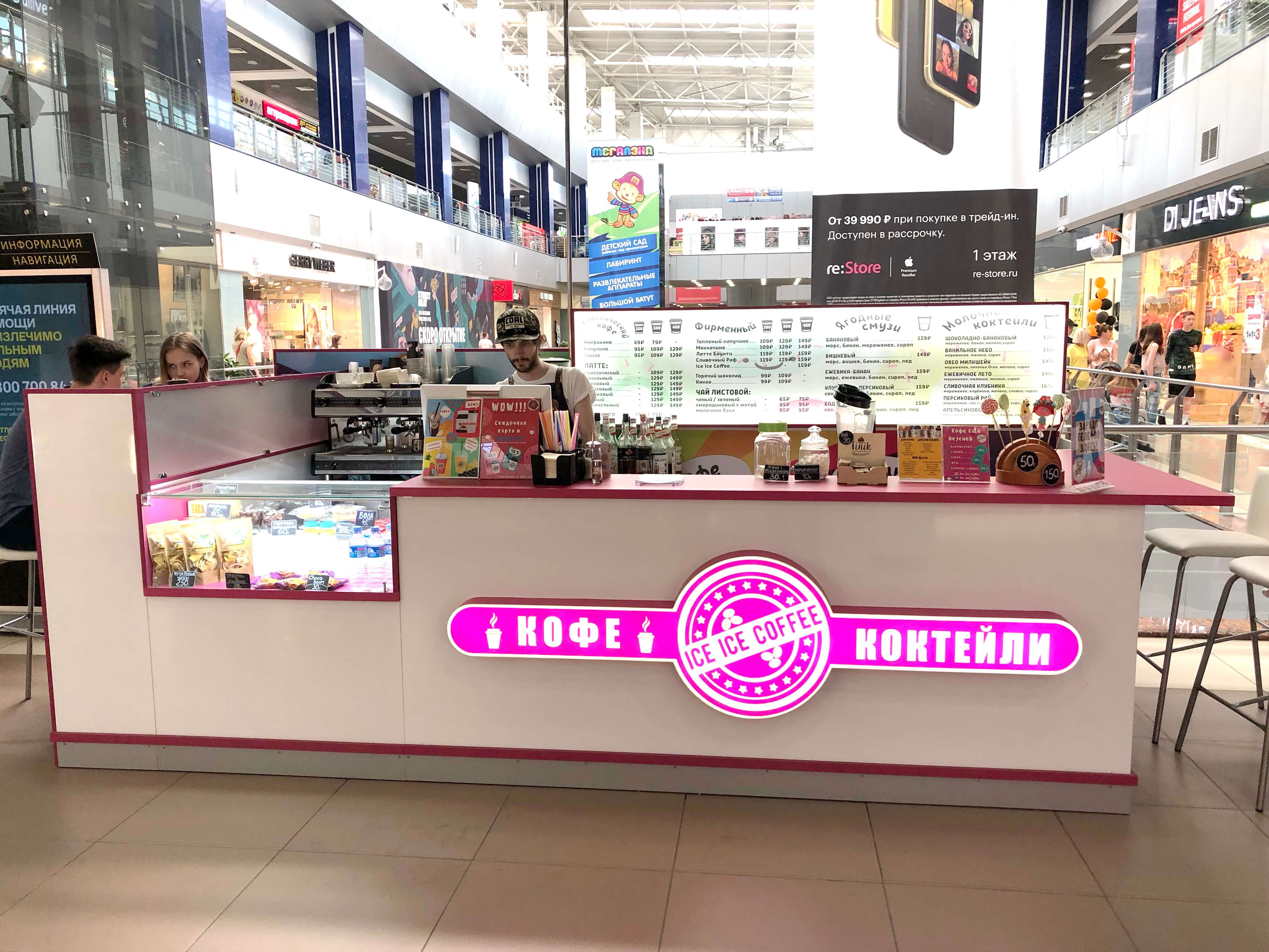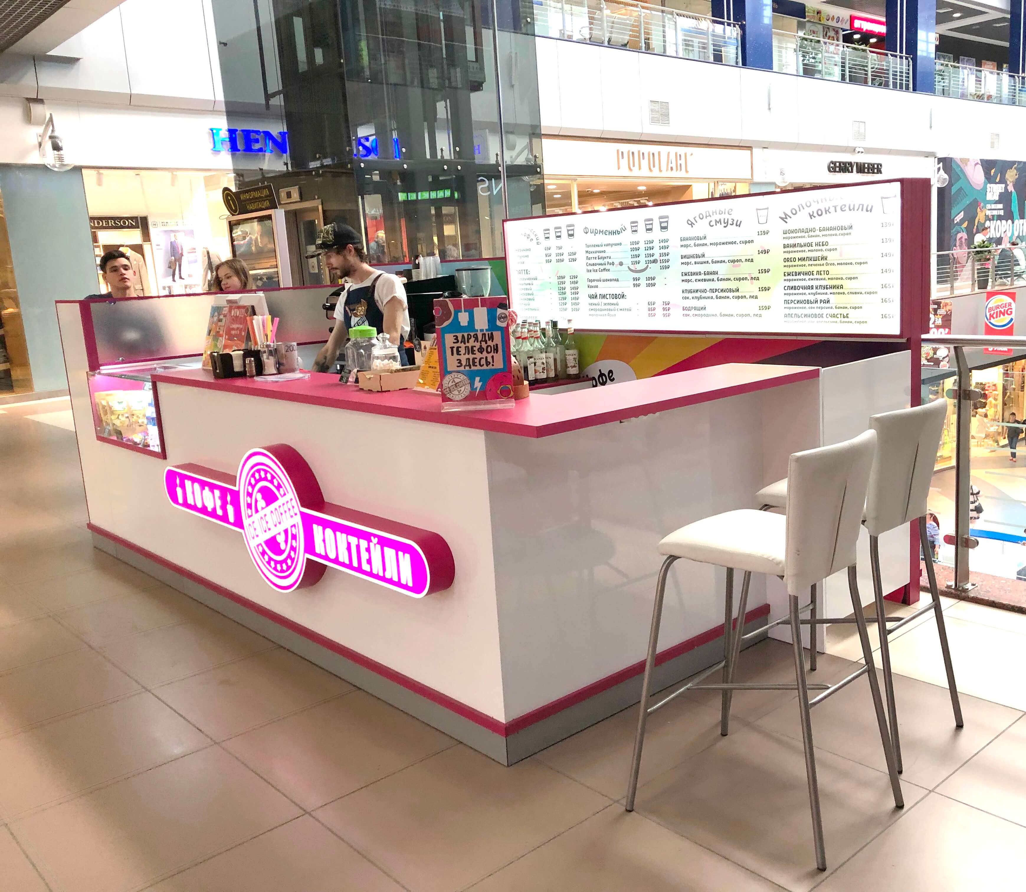 При разработке дизайна кофейни "Ice Ice Coffee" стояли несколько задач, и вот некоторые из них: предоставить баристе готовить гостям свой лучший кофе, показать меню на самом видном месте, а также реализовать возможность совместного времяпрепровождения для посетителей. В результате: бариста доволен своей обстановкой, меню на самом видном месте, а гости с удовольствием совершают заказы и возвращаются снова.