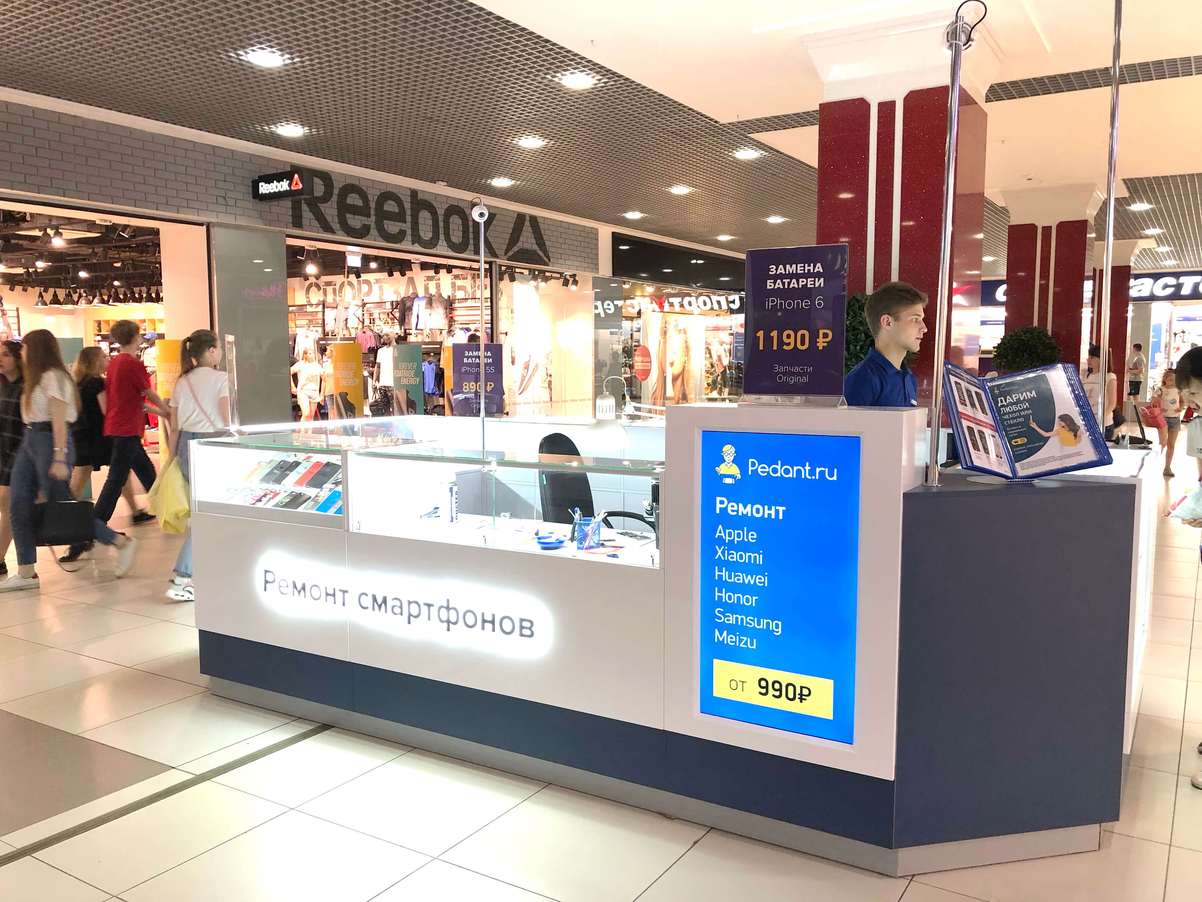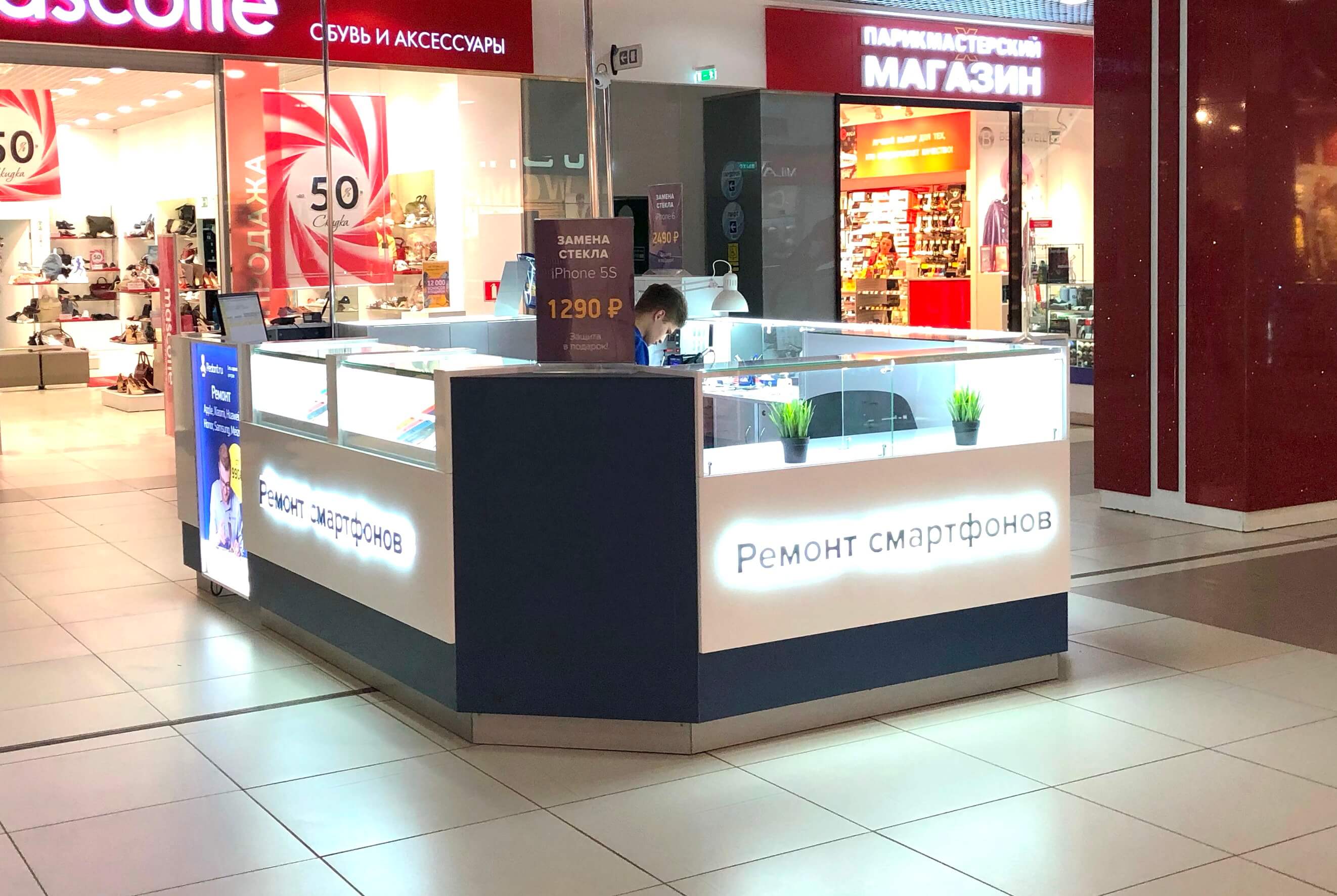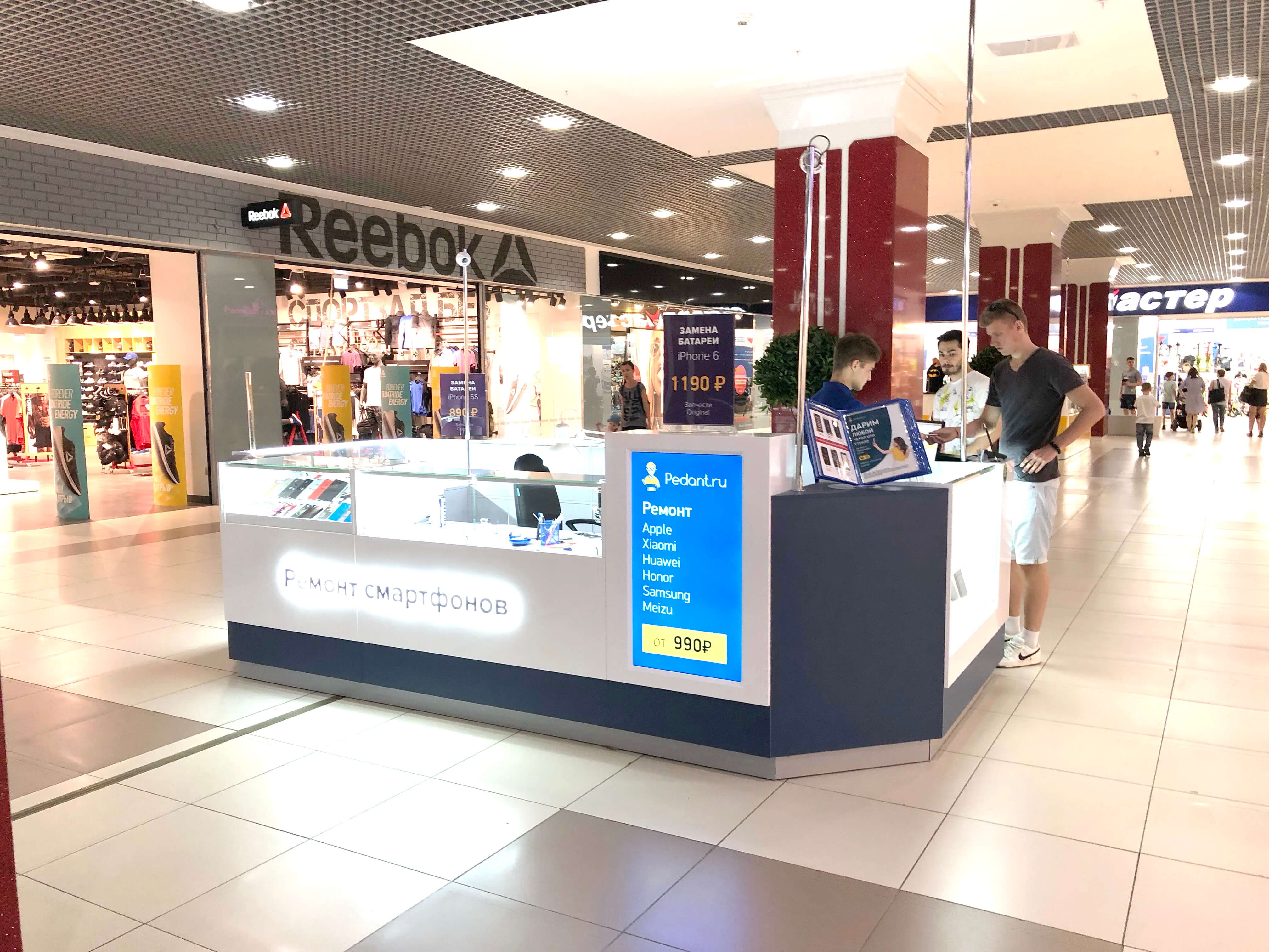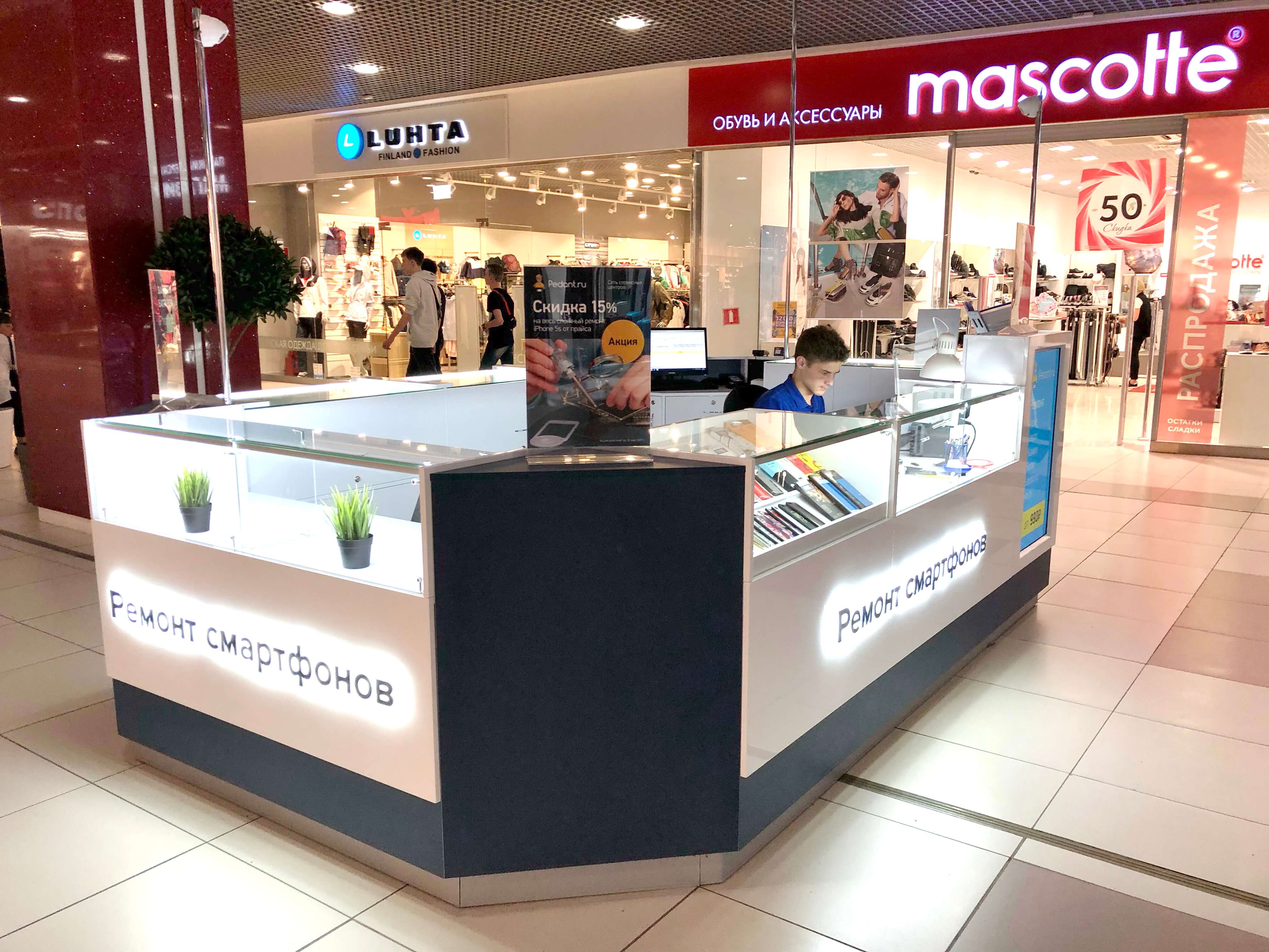 Как говорится: "дело мастера боится", и мы это прекрасно понимали при создании дизайна сервисных центров "Pedant". Для этого мы использовали современную систему освещения, способную поддерживать необходимый уровень яркости длительное время во время работы специалиста. А также разместили функциональные отделы для хранения комплектующих и аксессуаров, которые необходимы при ремонте смартфонов и планшетов.