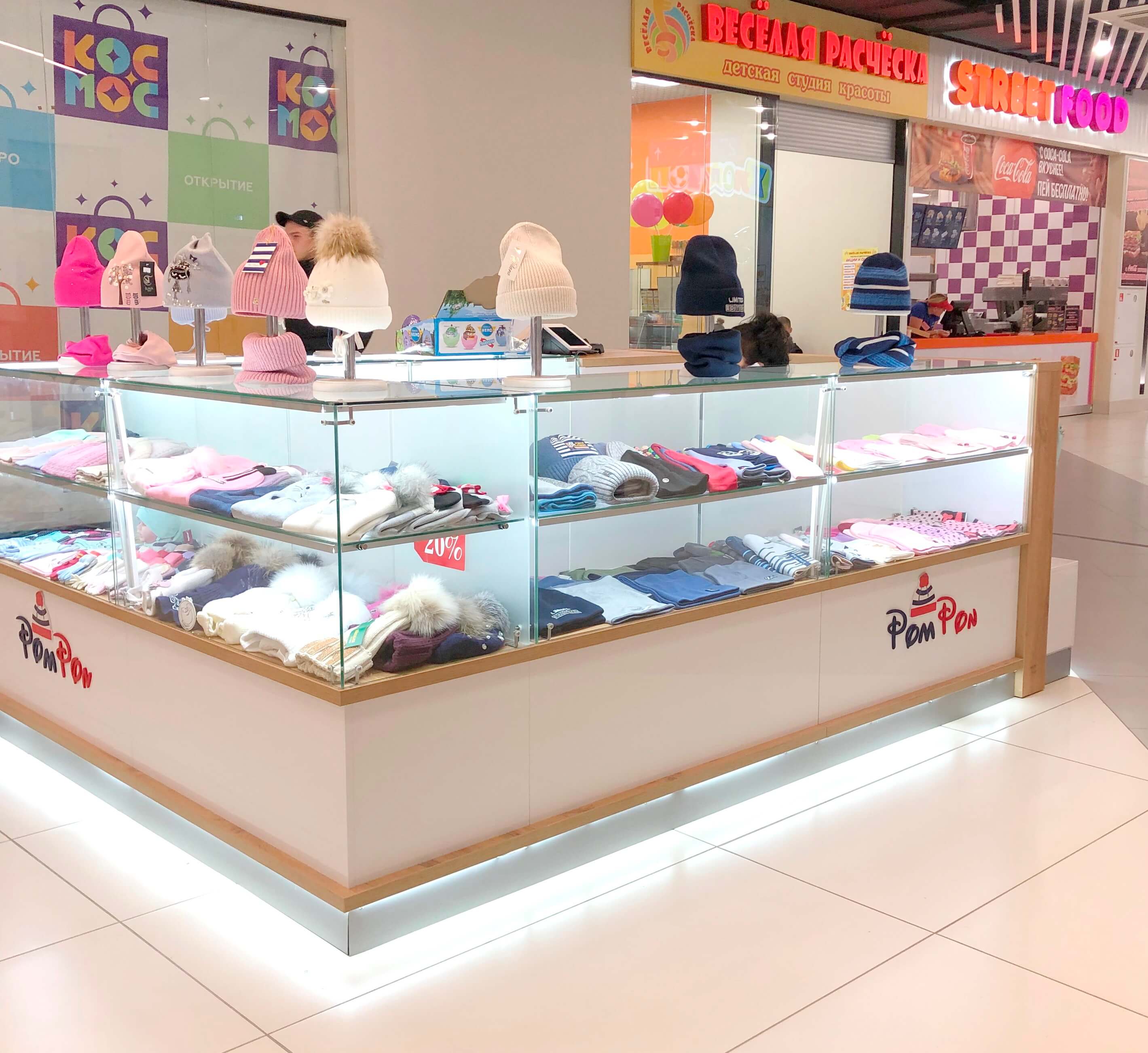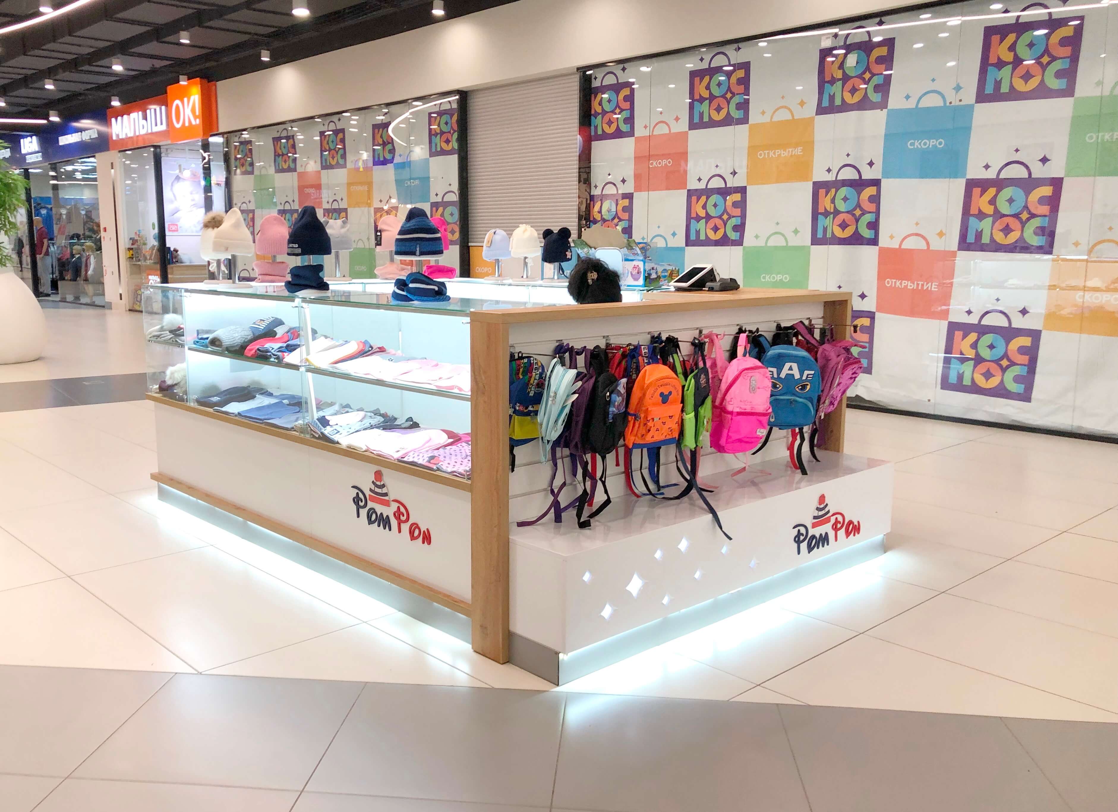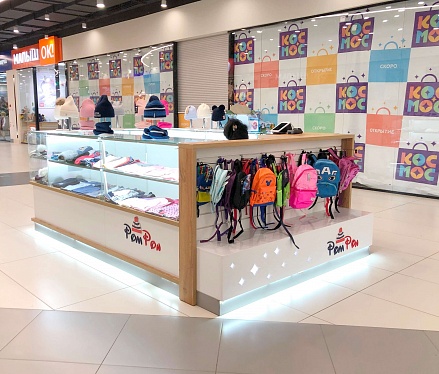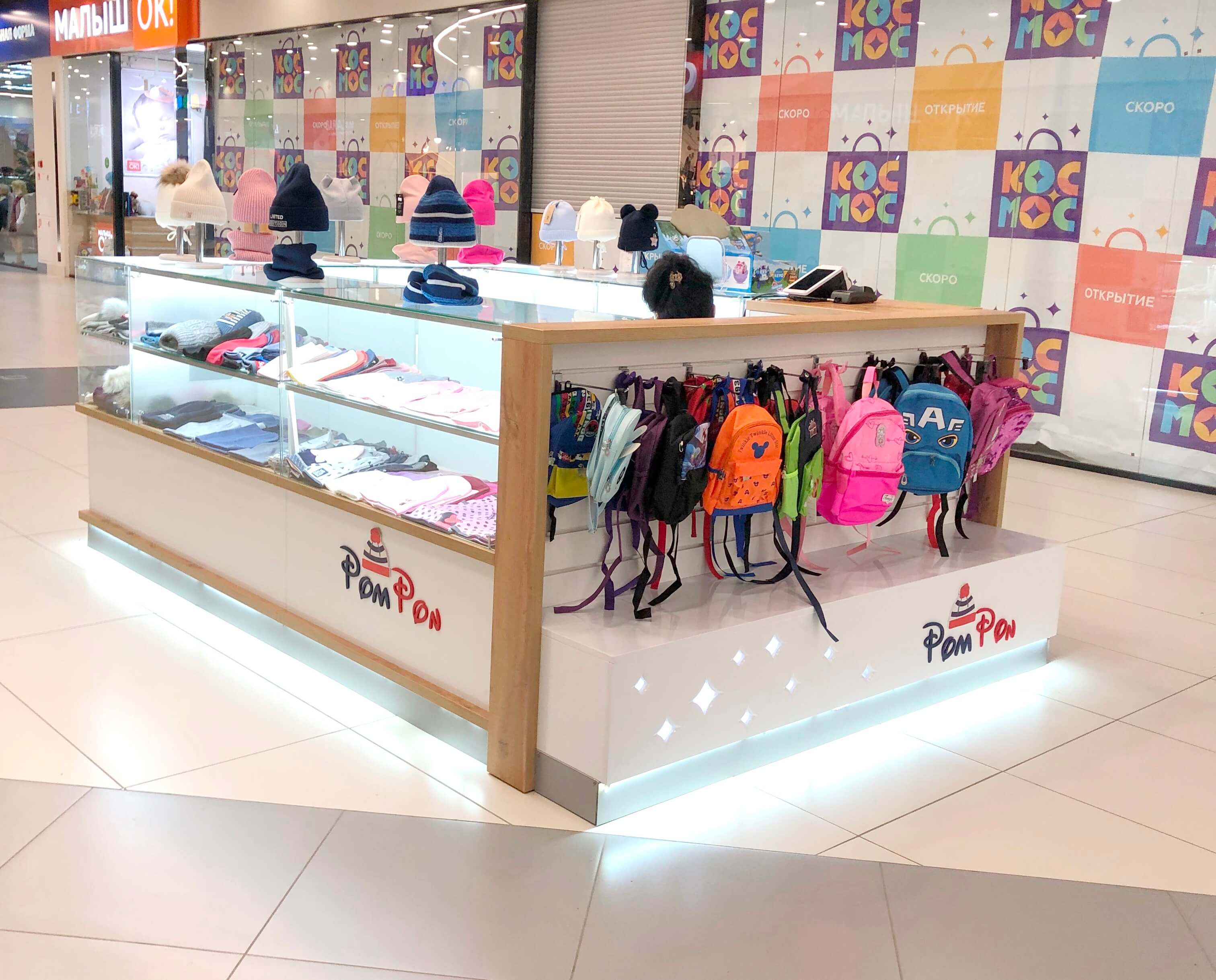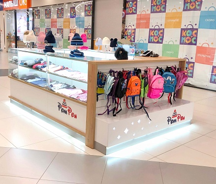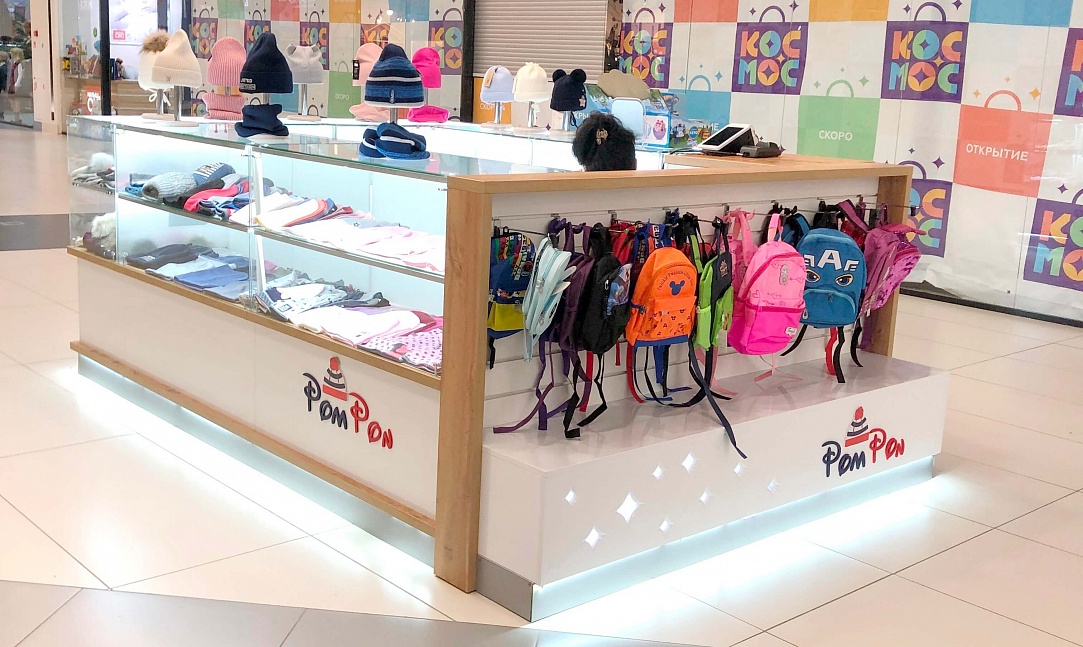 Маленький, яркий, и невероятно притягательный островной отдел реализовали наши специалисты в ТРК "Космос". Для этого мы учли: кронштейны для детских рюкзаков, выставочные платформы для шапок, открытые полки для одежды с непосредственным освещением и приятные глазу и на ощупь материалы, которые облагородят общий вид магазина детских вещей.