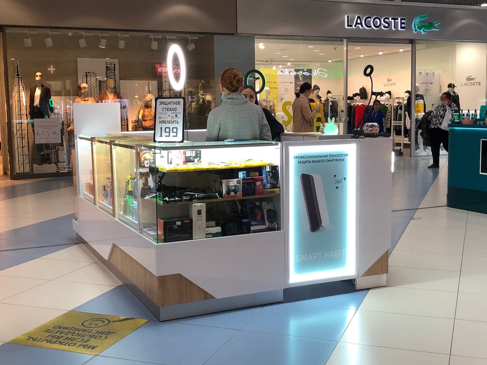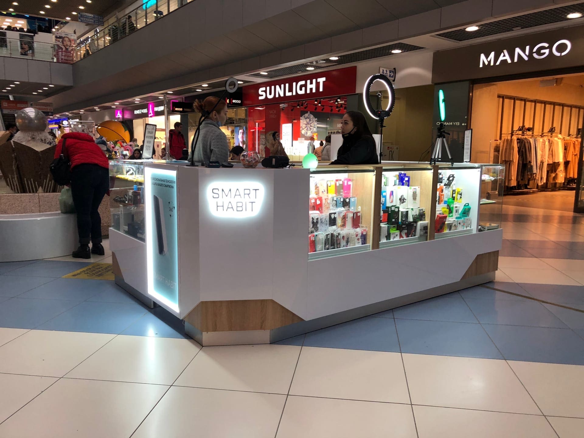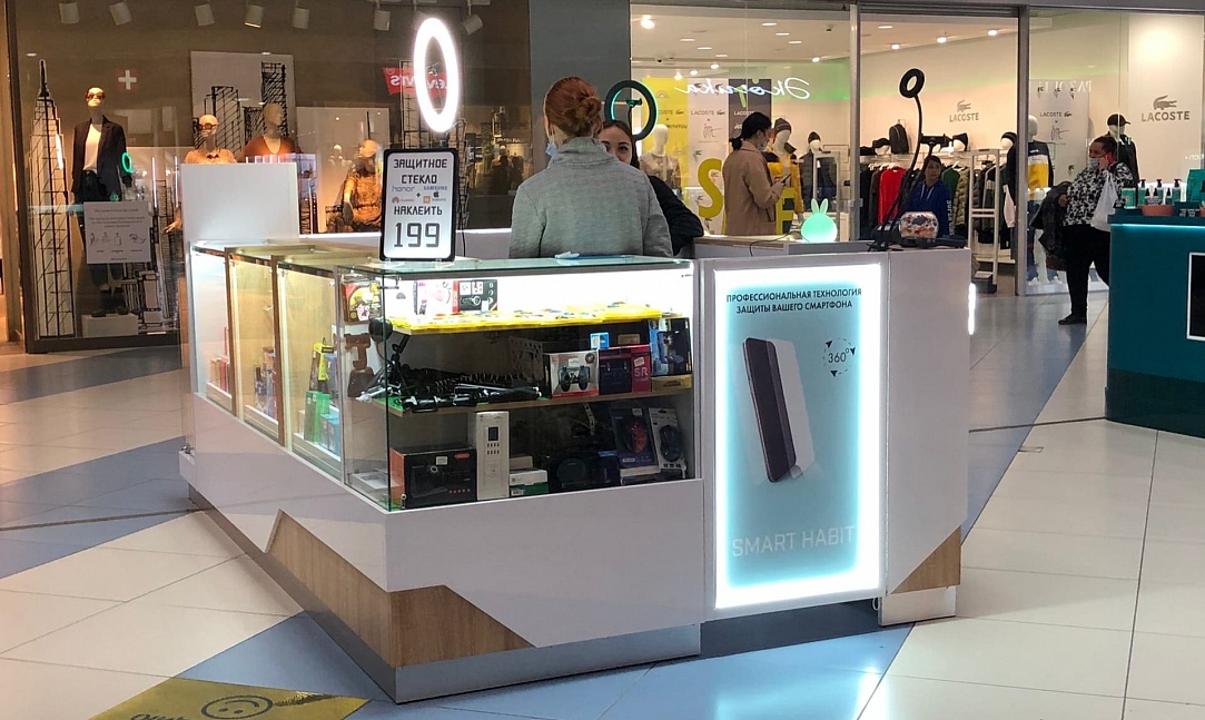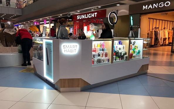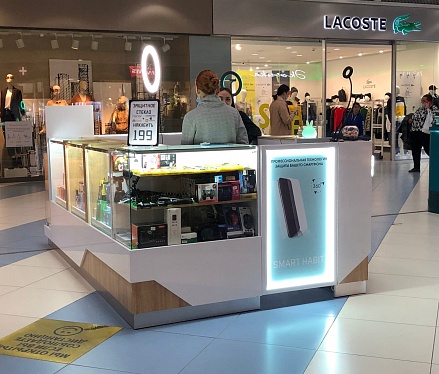 Островной отдел "Smart Habit" расположен на первом этаже в ТРК Горки, г. Челябинск, и привлекает своих посетителей свежим и современным дизайном, а также обширным ассортиментом аксессуаров для Ваших "смарт" гаджетов. Оформление магазина выполнено из белых панелей ЛДСП на контрасте с бежевыми блоками МДФ, служащими визуальной основой острова.